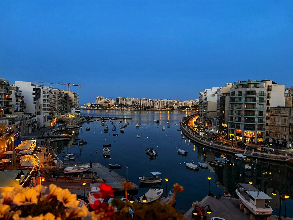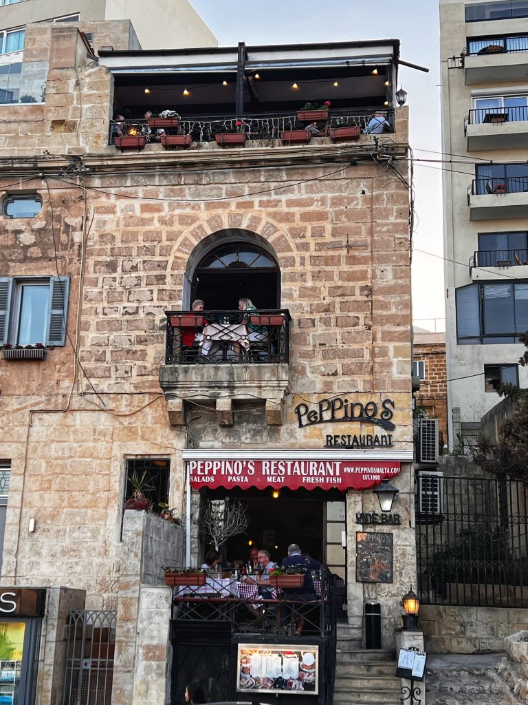 晚饭的饭店又是在斯皮诺拉湾,我俩的座位是三楼最左边的. The restaurant, Peppinos, for dinner is again at Spinola Bay. Our table is on the left side of the third floor.
