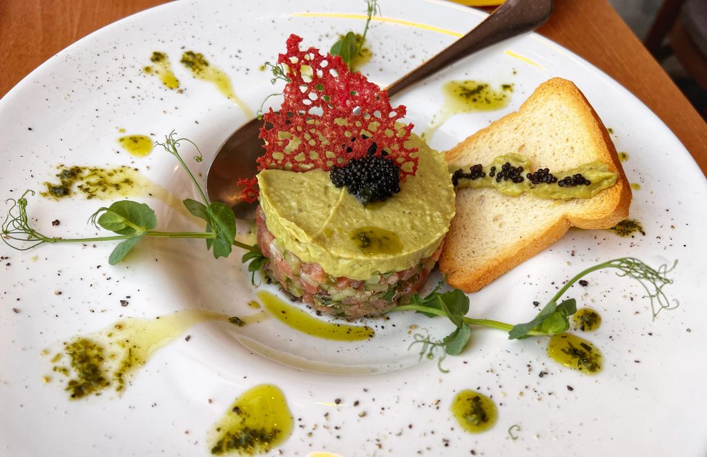 三文鱼牛油果前餐,和我做的一款很像,但是这个三文鱼是腌制过的,我觉得我的更新鲜. A salmon avocado appetizer, similar to one I have made, but this salmon is marinated – I think mine is fresher haha.