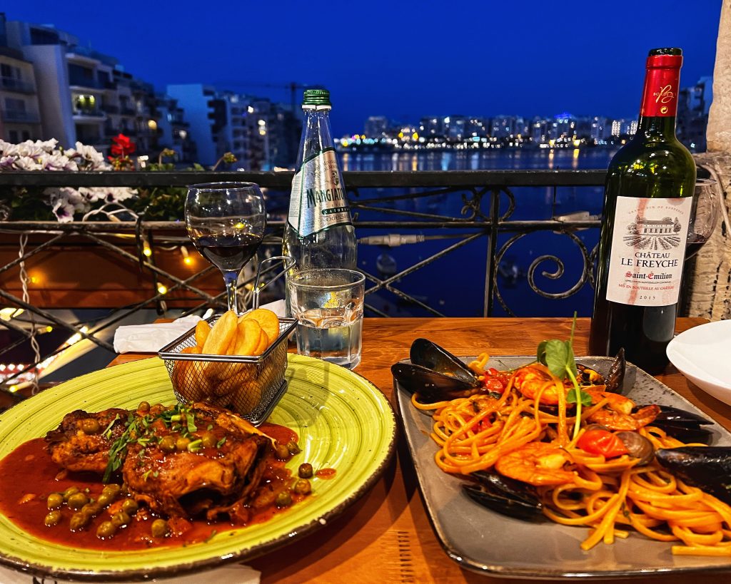 在马耳他的最后一个晚餐,左边的是我的炖兔肉,右边的是PJG的海鲜意面. Our last dinner in Malta: my Rabbit Stew on the left and PJG’s Seafood Pasta on the right.