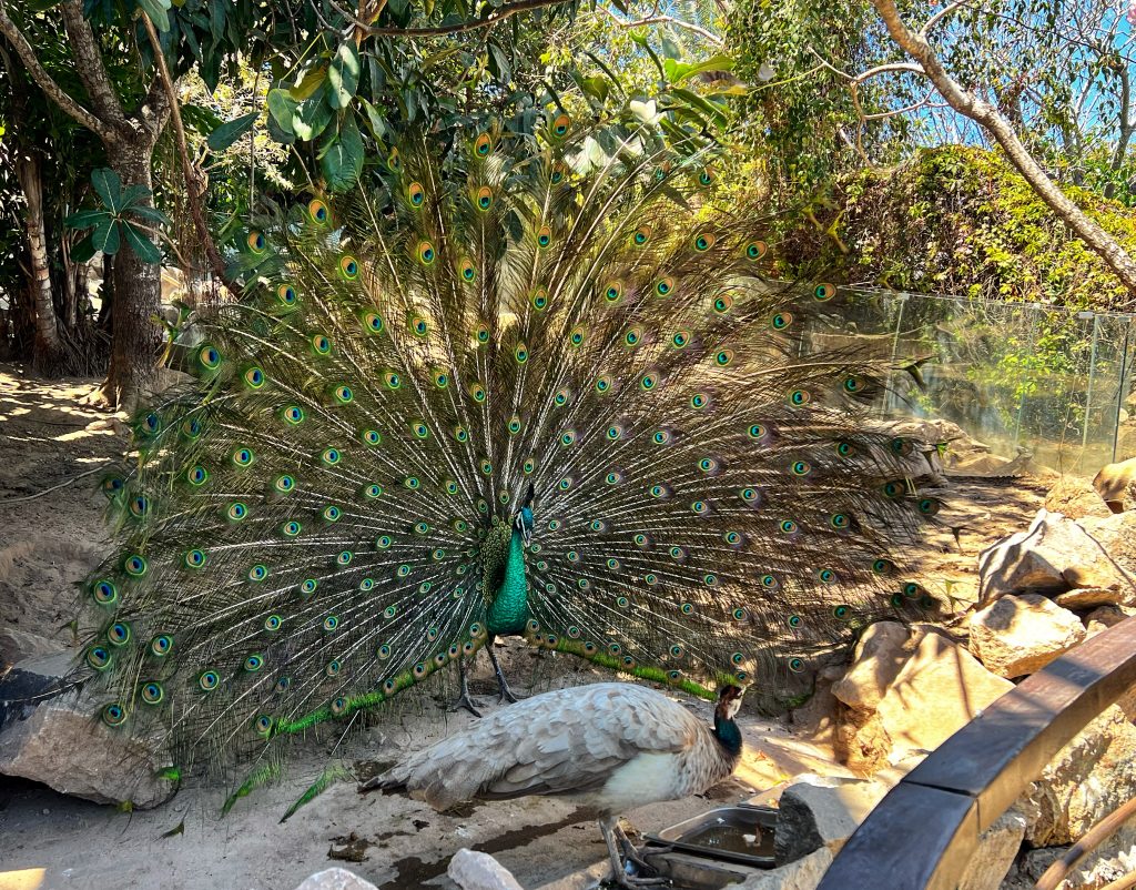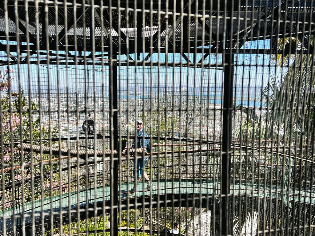 抵达山顶后,一位英文讲解员为我们简要介绍了园区的布局。出乎意料的是,这里可游览的地方远比想象中丰富。他建议我们先去看看小动物,再去观景台参观。我们沿着一条被树荫覆盖的人工栈道参观,途中看到许多色彩斑斓的鹦鹉被关在一个巨大的铁笼中,它们时而发出刺耳的鸣叫,仿佛在呐喊、在抗议,渴望冲破牢笼,飞向自由的天空。林间还偶遇了很多在争抢食物的孔雀。