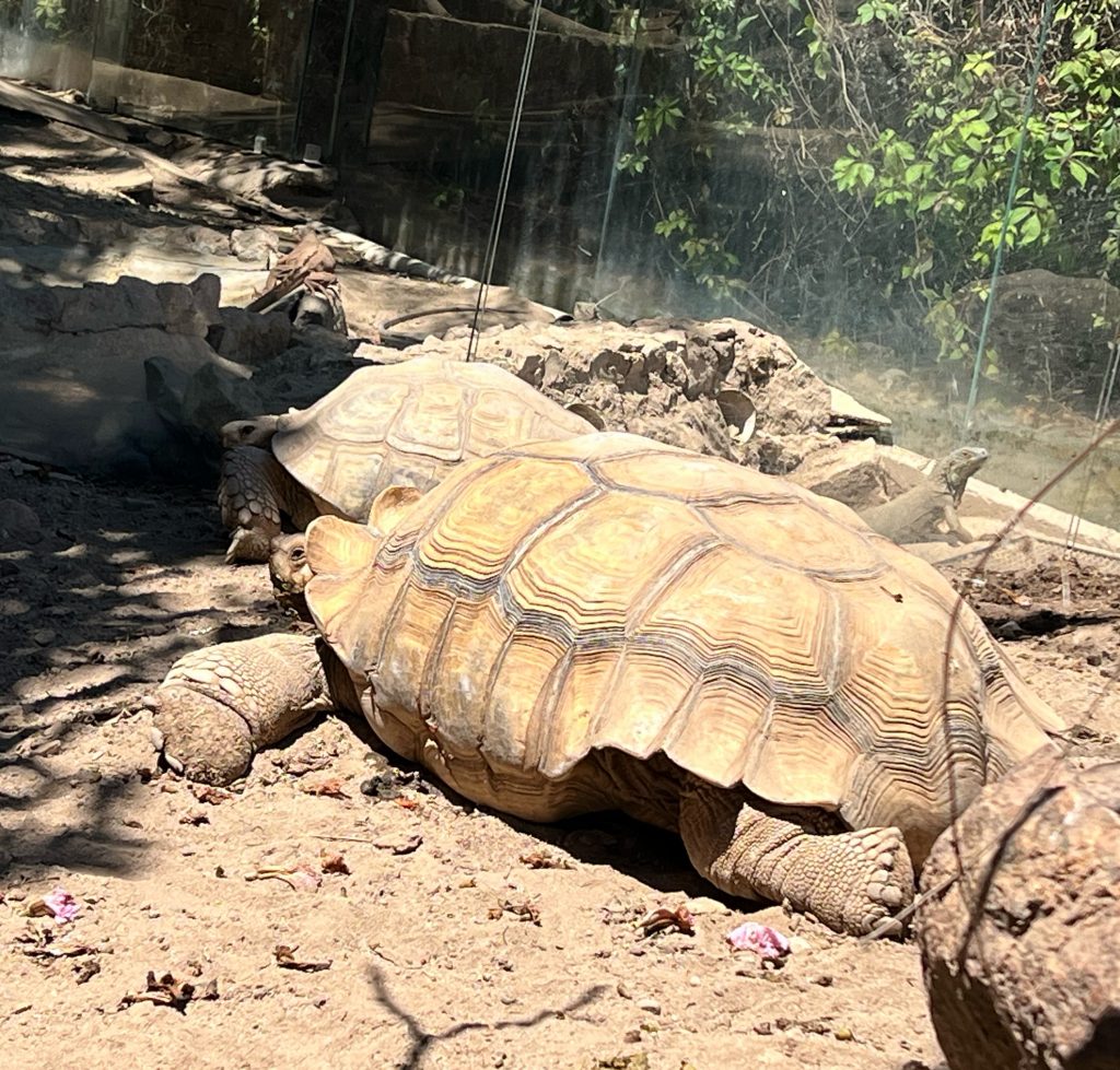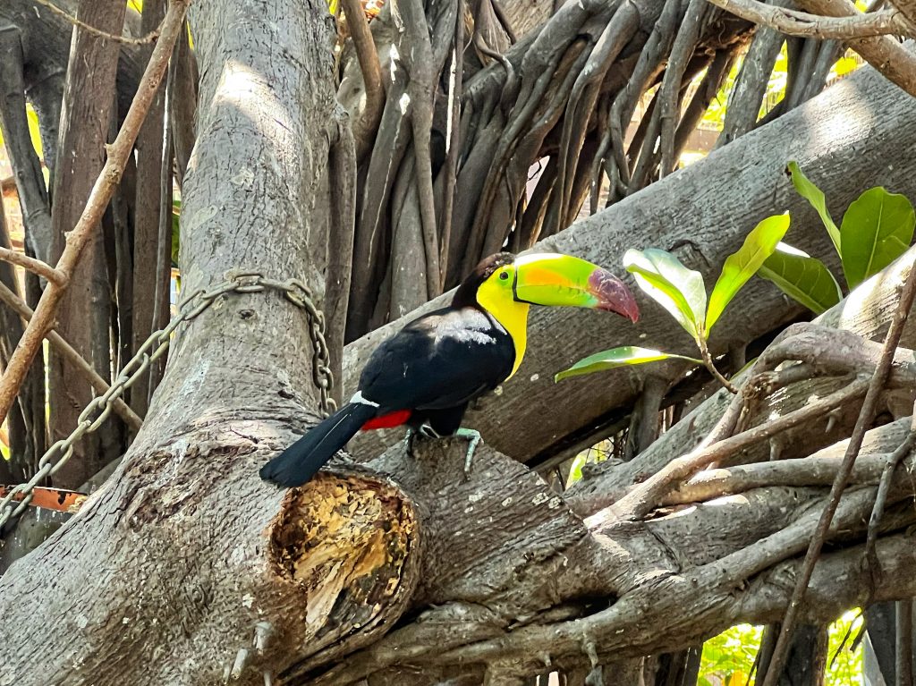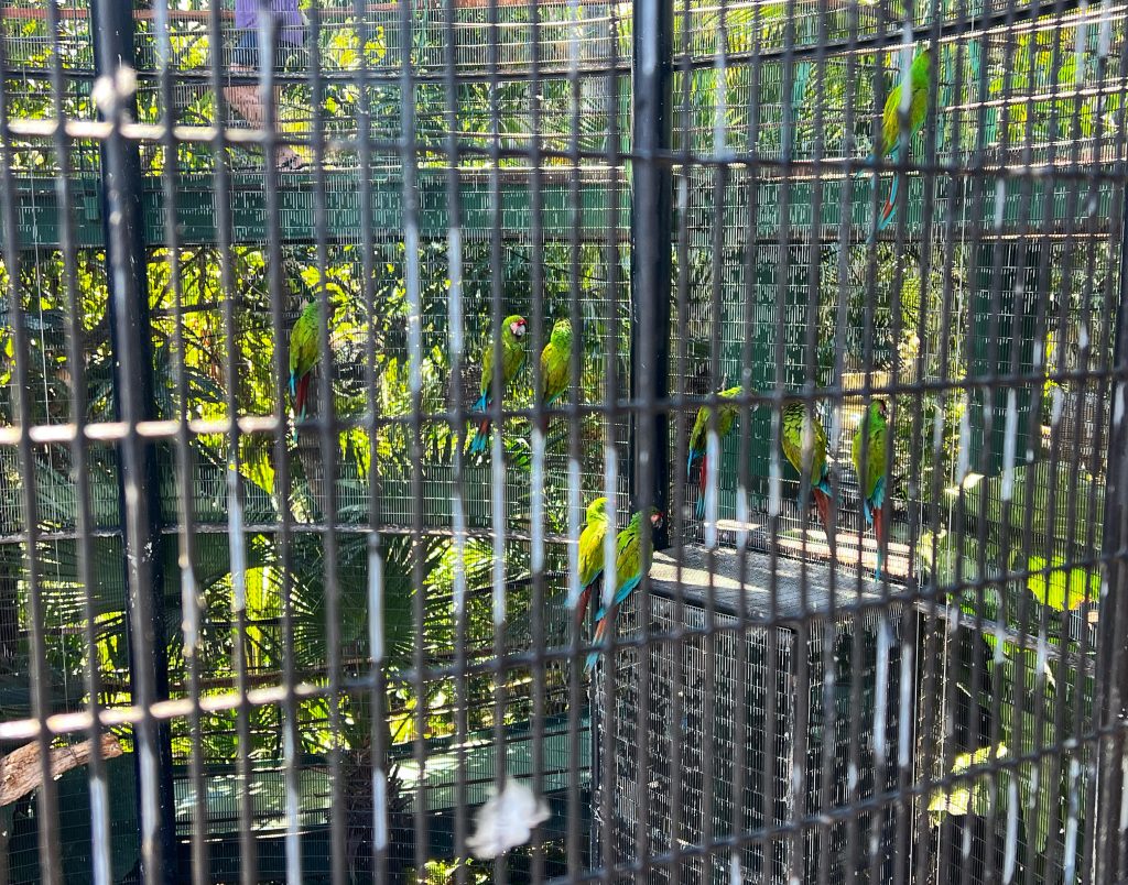 We followed a shaded boardwalk through the area, passing a massive iron cage filled with brightly colored parrots. They screeched sharply at times, as if crying out in protest, longing to break free and soar into the open sky. Along the way, we also came across several peacocks tussling over food in the woods.