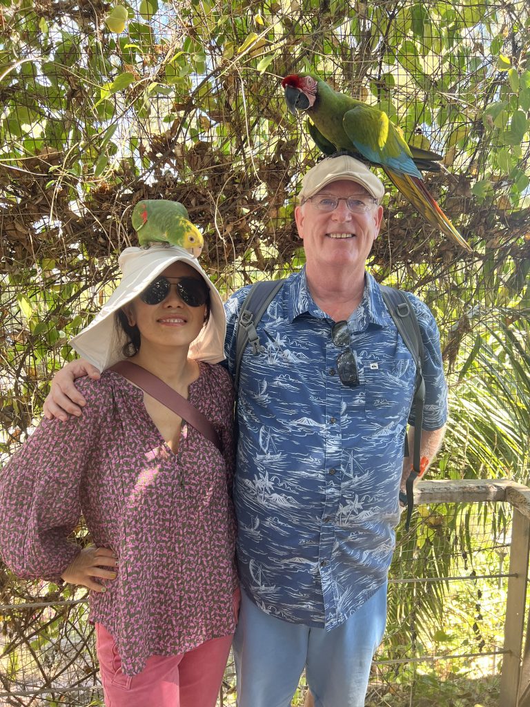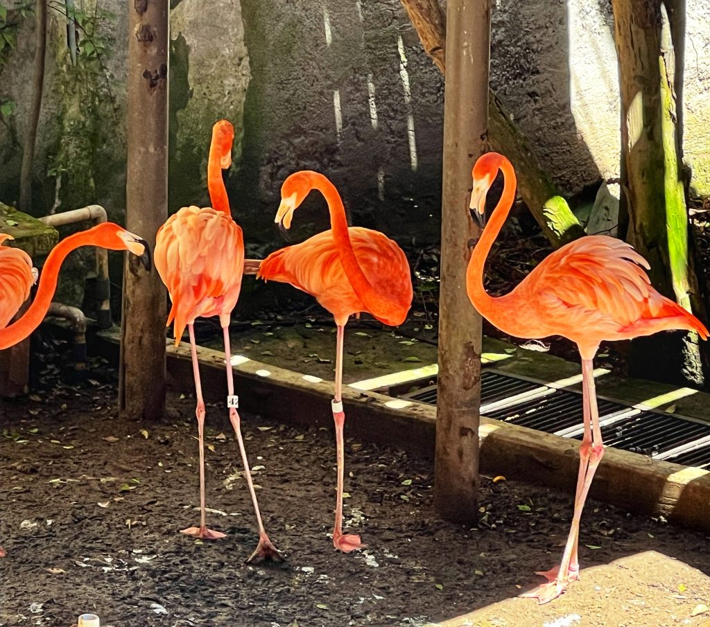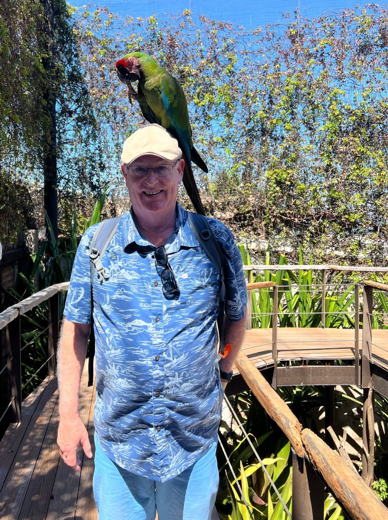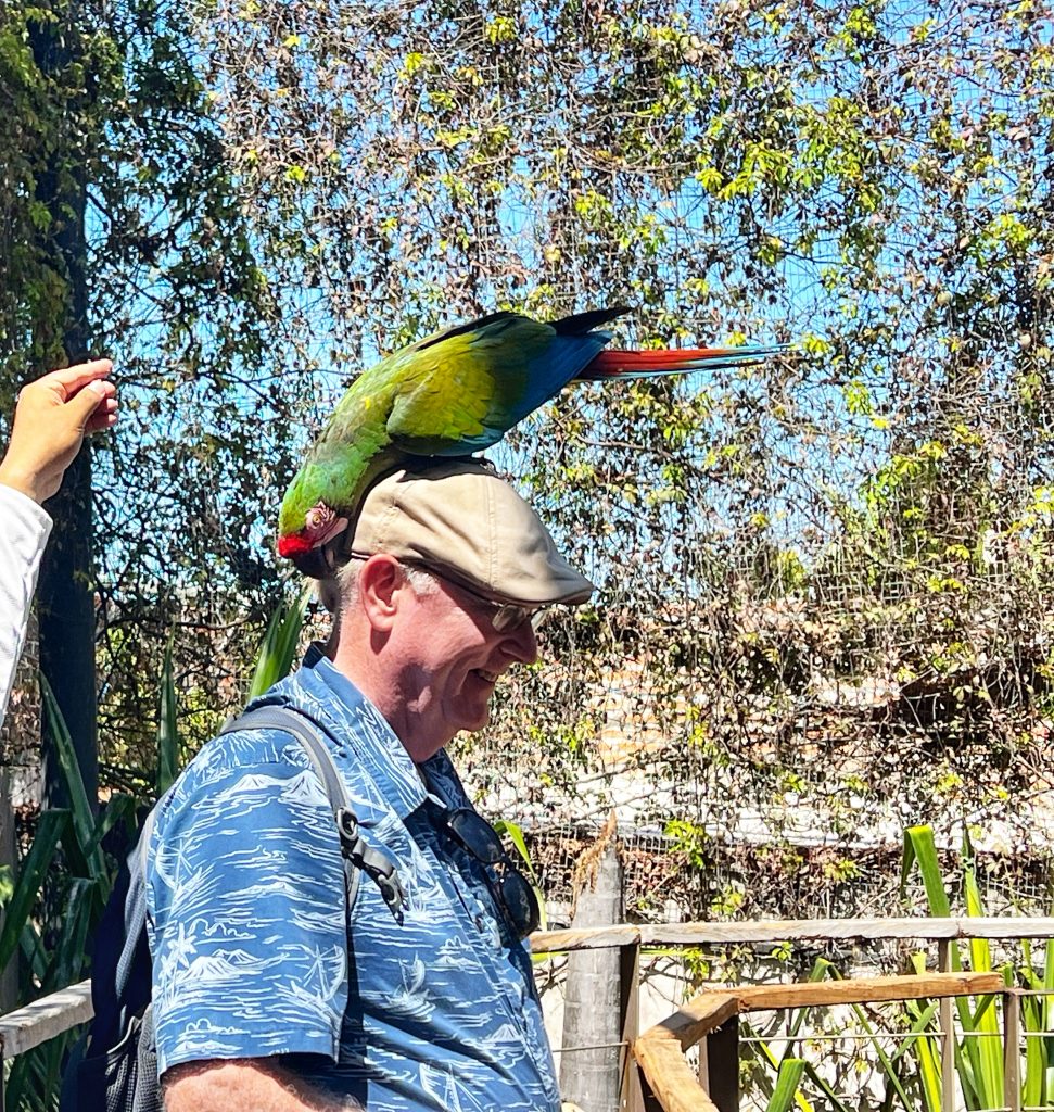 As I focused on photographing the flamingos, a brightly colored parrot suddenly landed on PJG’s head!! After a staff member handed it some food, it flew over and landed on my head too!! Even through my hat, I could clearly feel its small but sharp claws. A few more parrots then swooped around us, landing and taking off again, playfully circling above.
