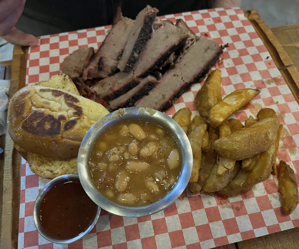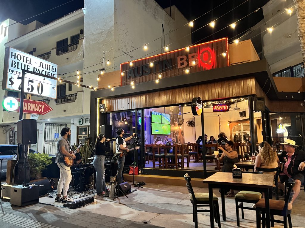 晚餐时分,我们又一次去了黄金区域,那里依旧没什么新意。尽管是周六,最热闹的地段也显得冷冷清清。于是我们叫了辆 Uber,去了我提前找到的一家德州奥斯汀式烧烤餐厅,心里充满期待,想着换换口味,摆脱一下单调的墨西哥菜。可惜,烧烤上桌后让人失望——肉质干柴,味道也平平无奇,完全没有预想中的浓香四溢。或许这顿饭最大的亮点,是餐厅里表演的那支乐队,算是意外的小惊喜。