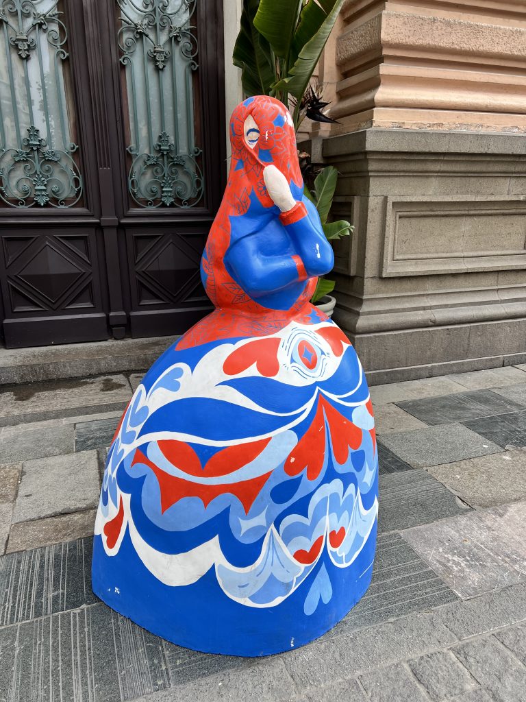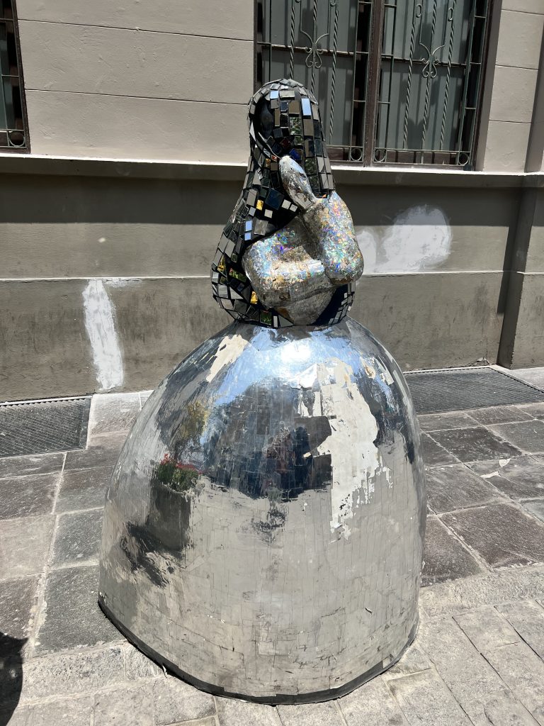 参观完政府宫后,我们在武器广场附近悠闲地漫步,感受着这片古老街区的历史气息。广场四周,有很多座蒙面女性的雕塑静静伫立,她们身着各式传统服饰,仅露出一只眼睛,透出一丝神秘与优雅。网上搜到了一些相关信息,才得知这些雕像源于利马殖民时期一种独特的文化现象。这些女性被称为Tapadas Limeñas,她们身穿西班牙风格的长袍,以丝质头巾遮盖头部与面部,只留下那一瞥如画的眼神。从17世纪到19世纪,这种服饰风靡一时,既是宗教与社会礼仪的产物,也成为一种含蓄迷人的风尚,代表着那个时代利马女性的身份表达。如今,这些身影被定格在雕塑和艺术作品中,成为秘鲁传统与历史的象征。