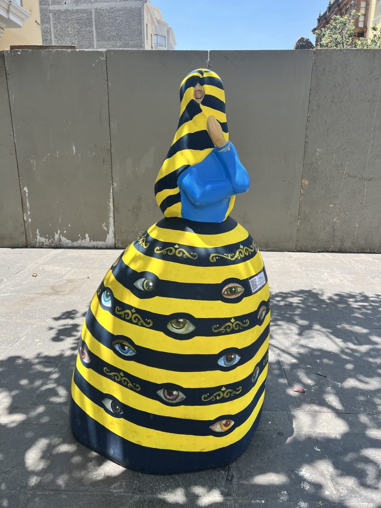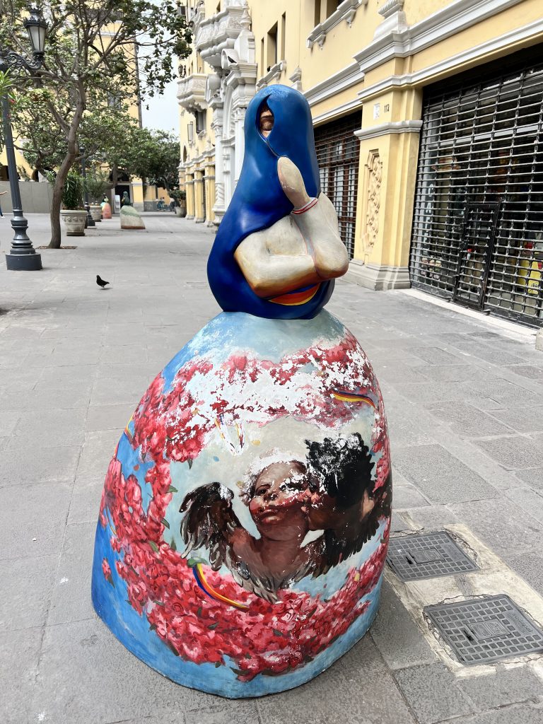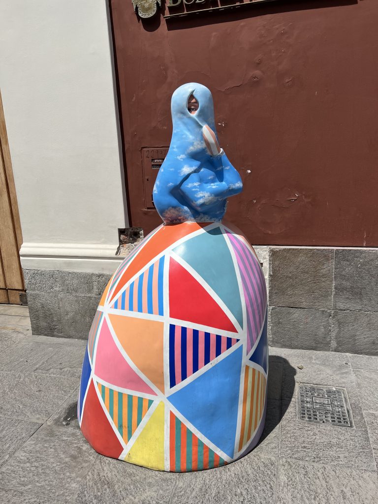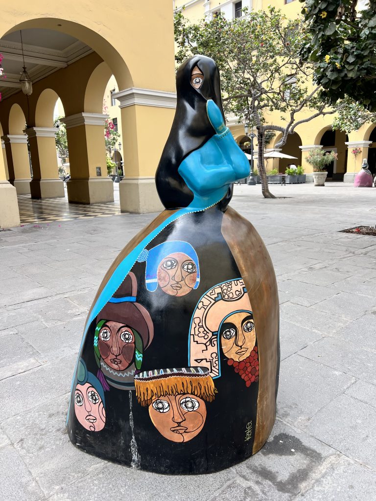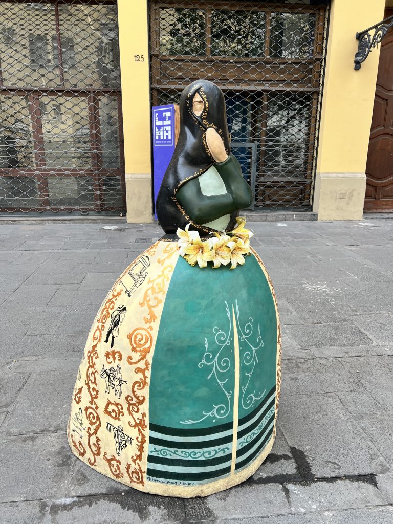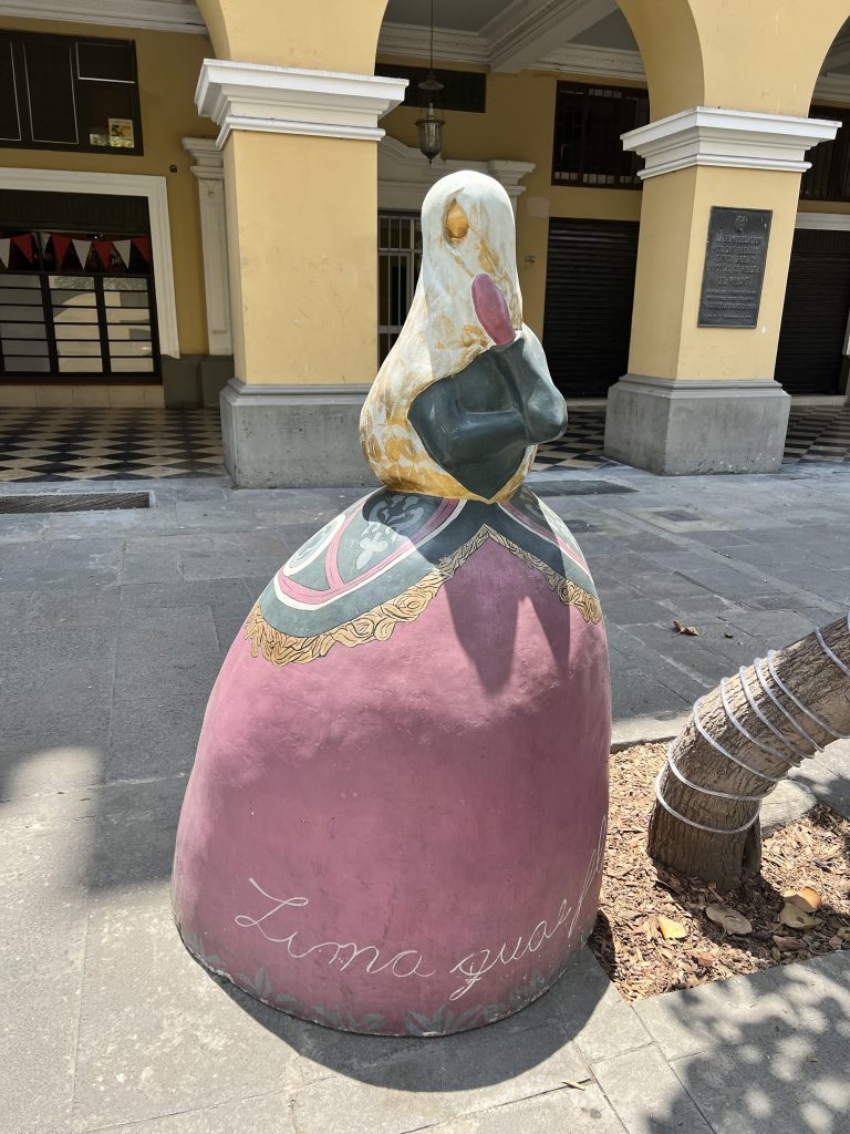 Curious, I searched online for more information and discovered that these statues represent a unique cultural phenomenon from Lima’s colonial era. These women, known as Tapadas Limeñas, wore Spanish-style gowns and silk mantles that covered their heads and faces, leaving only a single eye visible—a gaze as captivating as a painting.