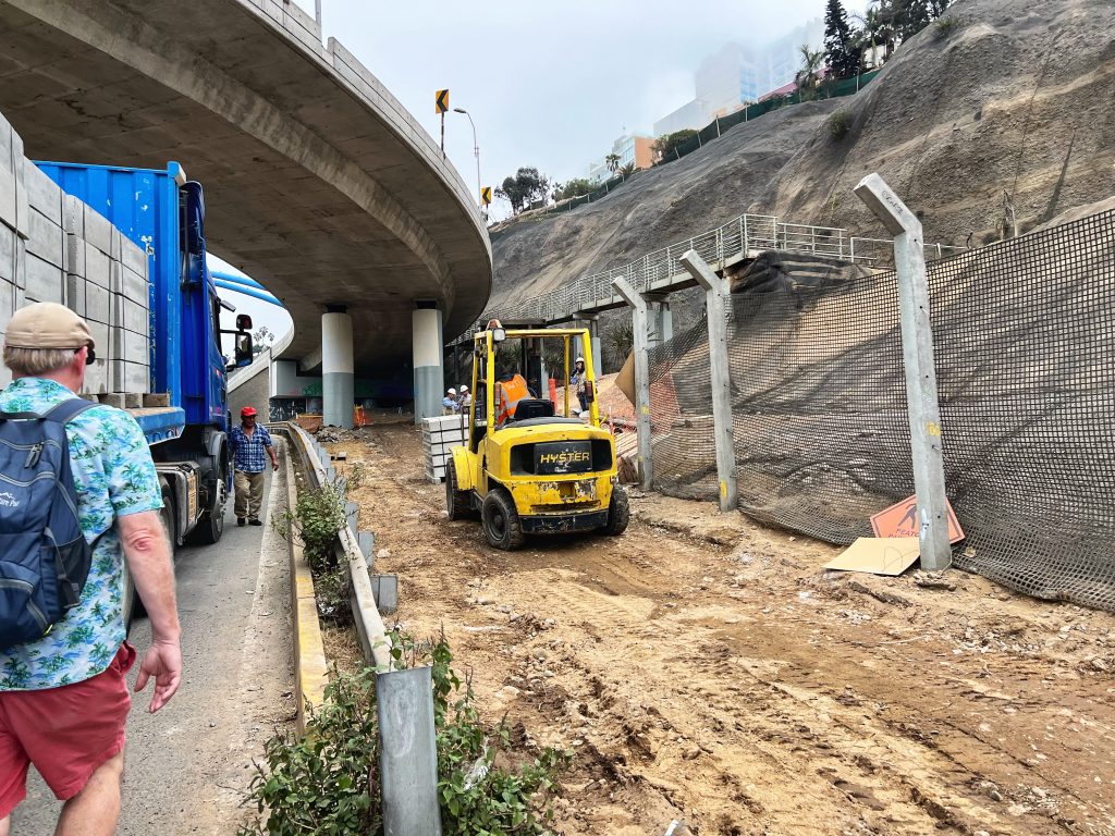 刚下天桥,就看见一块警示牌。用谷歌翻译一看,牌子提醒道路维修,不建议通行。但阳光正好,我们兴致正浓,便没有理会,继续前行。不久后,工地的景象映入眼帘,前方的道路被封锁。一位施工的交通指挥员朝我们挥手示意,似乎是在鼓励我们跨过栏杆继续前进。带着些许冒险精神,我们跟着他的指引继续向前。
