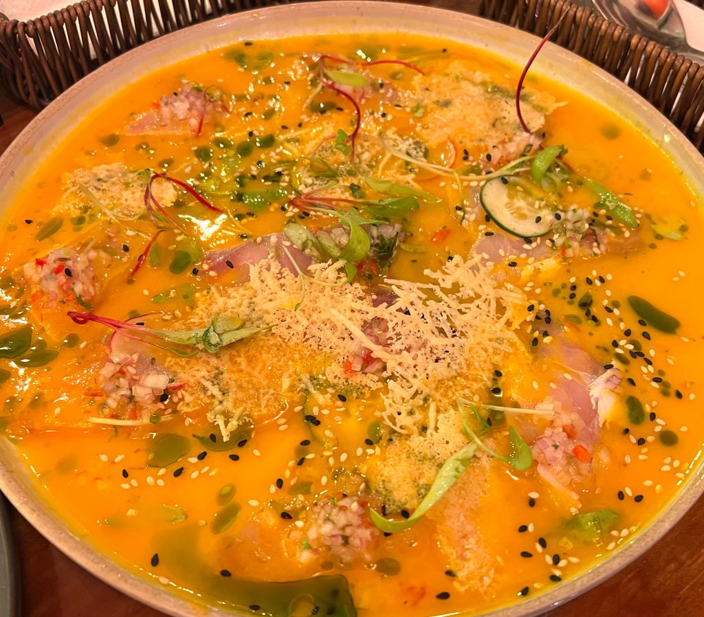 上完三个小时的烹饪课后,我打包了自己做的两道菜给PJG品尝,他觉得味道还不错。晚餐我们选择了一家秘鲁日本料理的餐厅,这类餐厅叫做Nikkei,与秘鲁中餐菜系(Chifa)相似,Nikkei料理是秘鲁与日本饮食文化融合的结晶。19世纪后期,大批日本移民来到秘鲁,将传统的日本烹饪技艺与秘鲁本地丰富的食材和风味相结合,创造出这一独特的菜系。Nikkei料理将秘鲁的辣椒、柠檬、藜麦和海鲜等食材,与日式的刺身、寿司等烹饪方式巧妙融合,形成了别具一格的风味。比如,用秘鲁黄辣椒制成的酱料搭配刺身,既保留了日本料理的清新,又赋予了秘鲁菜的浓郁层次感。