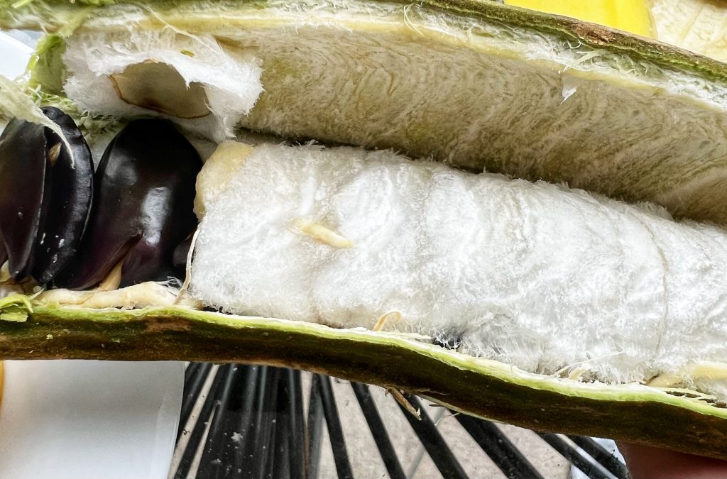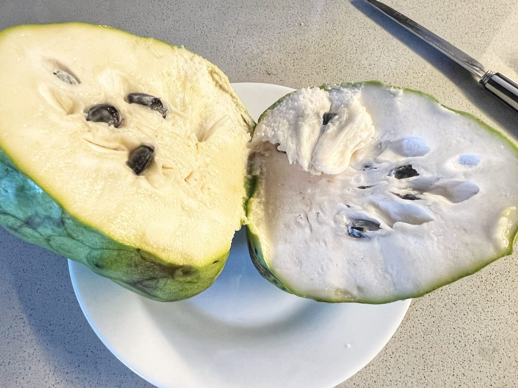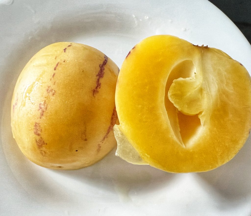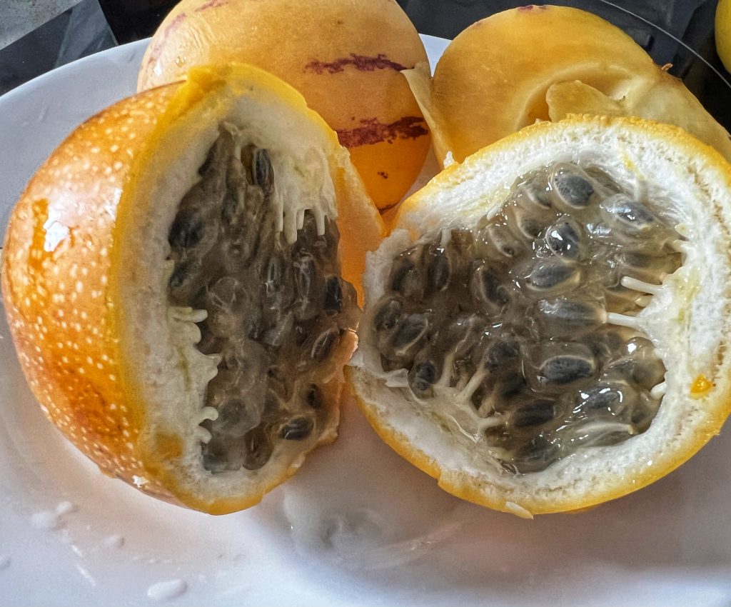 左边的是人参果,第一次见到和尝试这个水果,非常甜,水分非常多,有一种哈密瓜的味道;右边的是黄百香果,和其他吃过的百香果类似,但是比普通百香果更甜。 The one on the left is pepino dulce, a fruit I tried for the first time. It’s very sweet, incredibly juicy, and has a flavor reminiscent of cantaloupe. The one on the right is yellow passion fruit, similar to other passion fruits I’ve had, but noticeably sweeter than the regular variety.