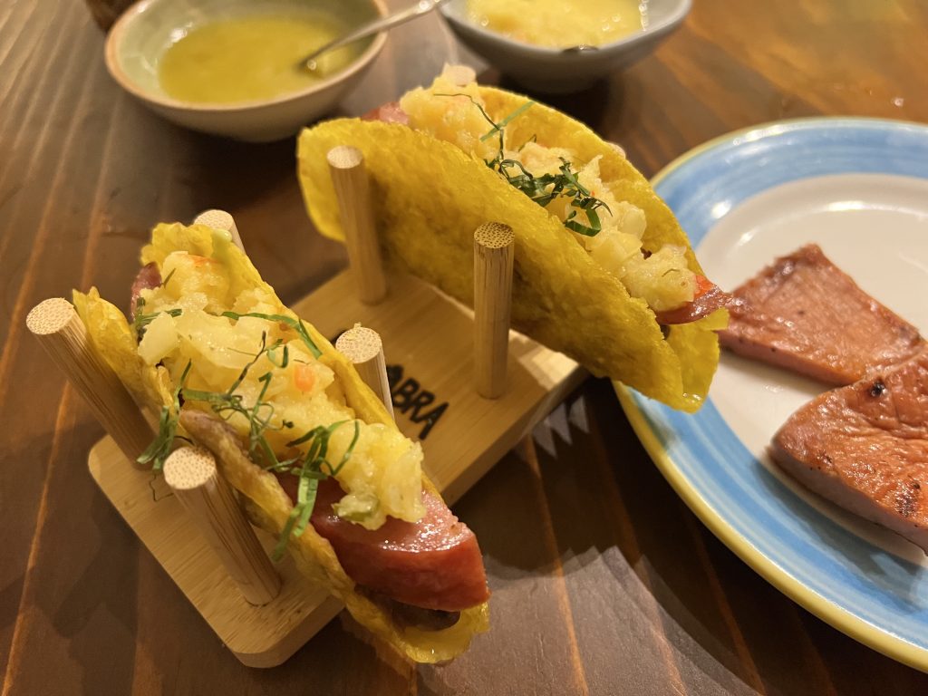 我的晚餐:皮斯可沙瓦鸡尾酒,香蕉片,香肠tacos,和一种烤鱼, 没吃出来有什么热带雨林的味道. – My dinner: the daily pisco sour, banana and taro chips, sausage tacos, and a piece of grilled fish,I didn’t taste any special “jungle” flavor.