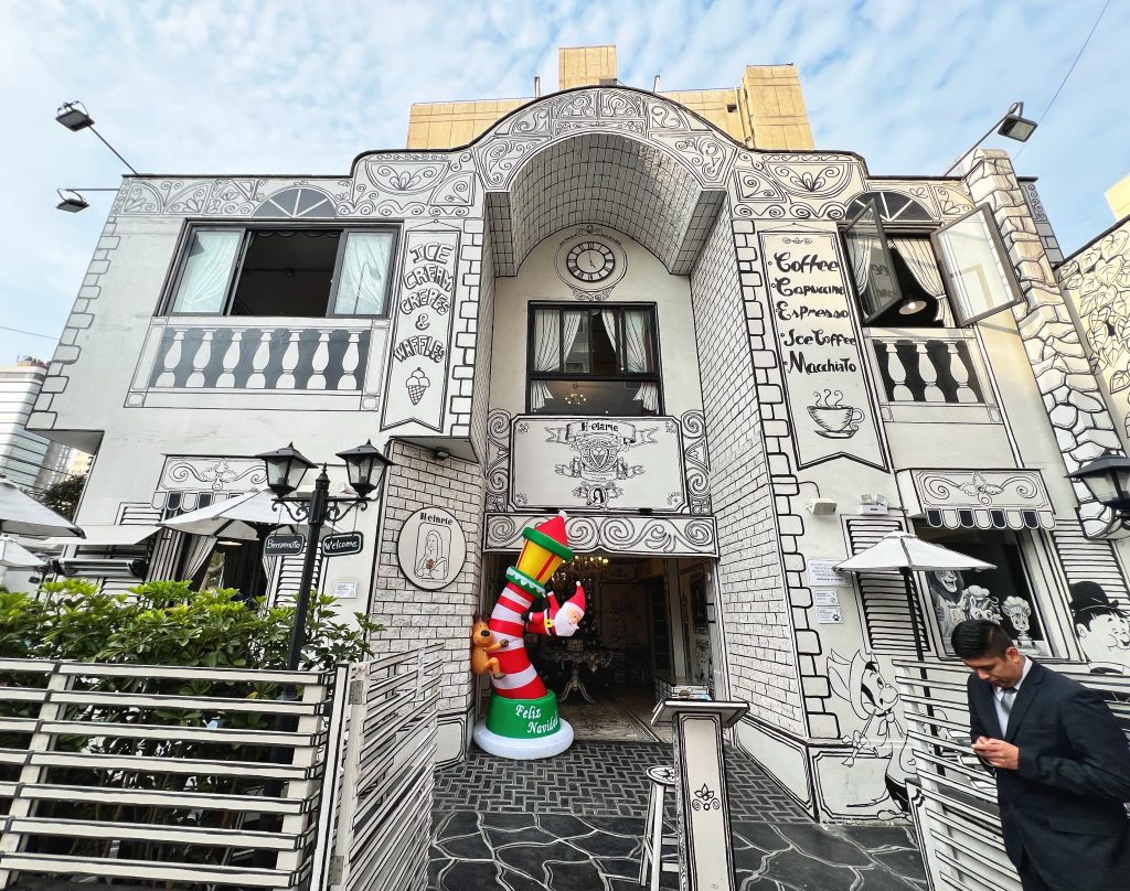 这个饭店的内外都被黑白2D手绘漫画风格装饰,营造出仿佛置身漫画世界的感觉。- The restaurant’s interior and exterior were decorated in a black-and-white 2D hand-drawn comic style, creating the feeling of being immersed in a comic book world.