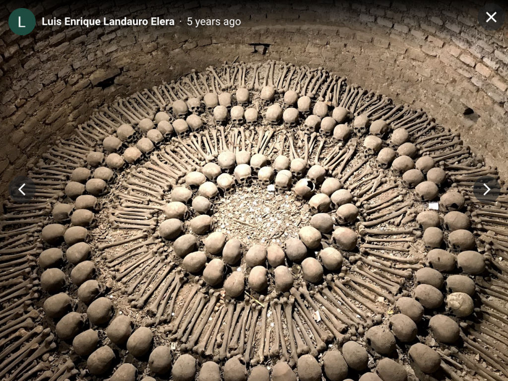 这座修道院建于17世纪,融合了西班牙巴洛克风格,内部装饰有精美的木雕、瓷砖和壁画,充分展现了殖民时期宗教艺术的辉煌成就。修道院最引人注目的部分是其地下墓穴(Catacombs),曾是殖民时期利马市民的公共墓地。据估计,这里安葬了多达7万具遗骸。导游提到,只有基督教徒才能被埋葬在此,因此许多人为了能安葬在墓穴里而选择皈依基督教。墓穴内能看到排列整齐的头骨和骨骼,而且好几个被展示的骨仓都有同样的骨头,我正在有这个疑问的时候,导游正好讲解说当时骨骼是按类存放的,比如头骨都在一个骨仓,股骨都在一个骨仓,等等。