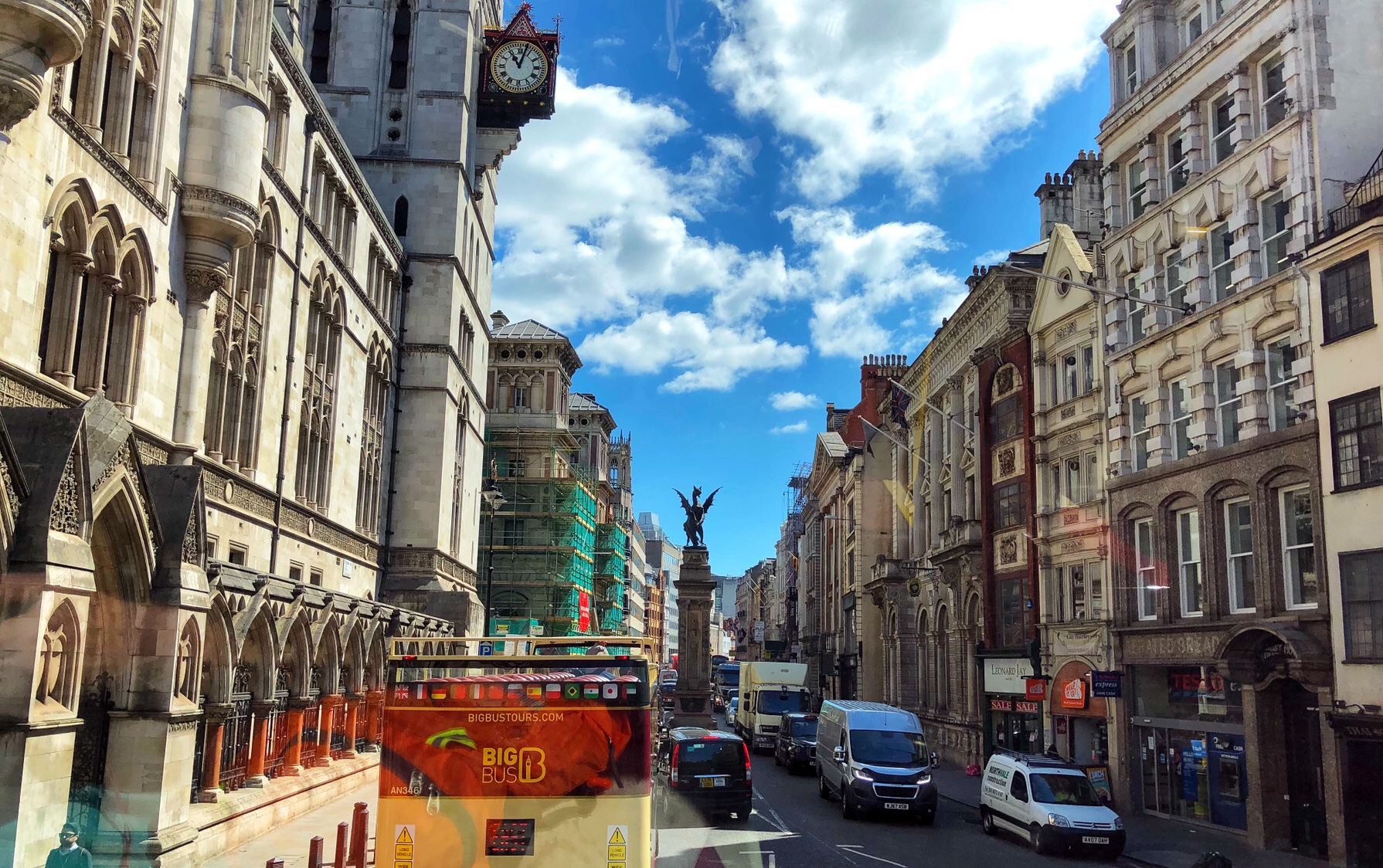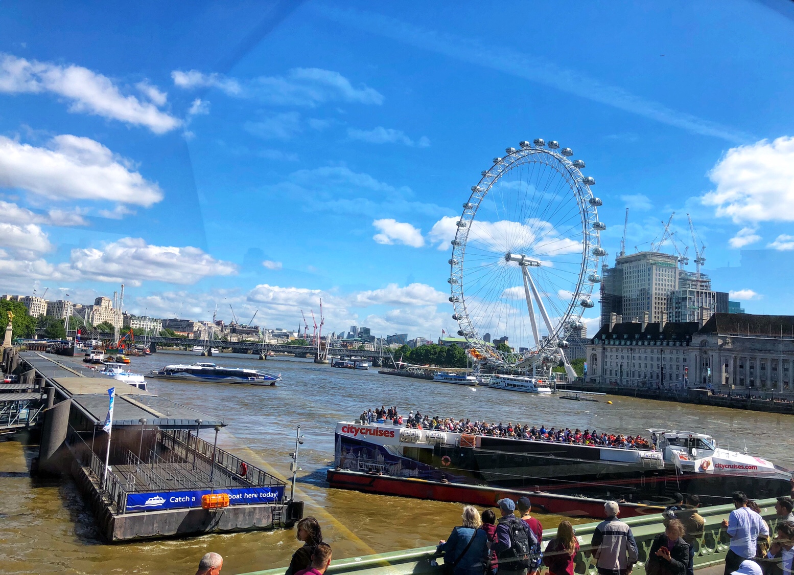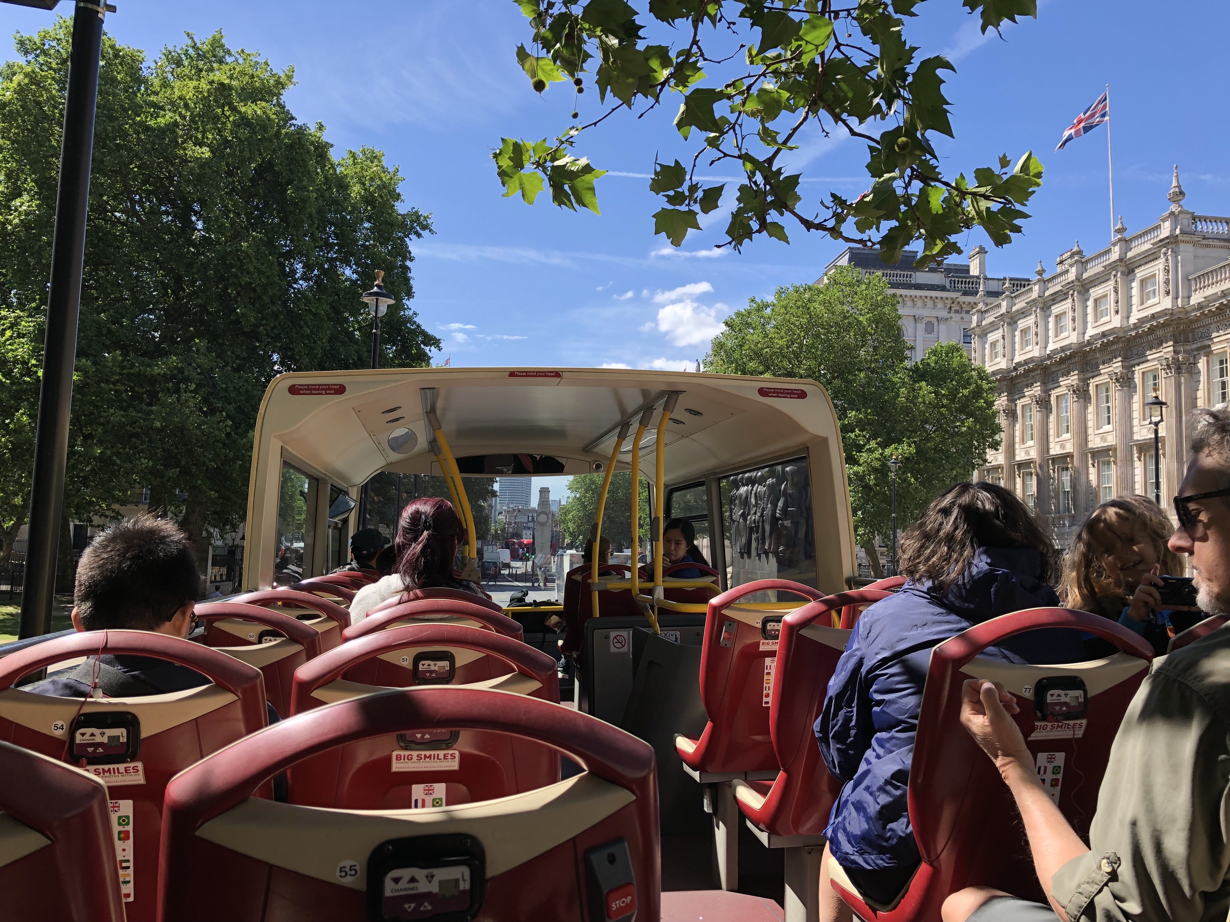 我俩这几天很幸运,伦敦竟然蓝天白云的,气温又不高很舒适。今天早上开始蓝天就出现了,我俩就决定去坐大巴士观光车,在固定站点随便上车下车,然后去周边景点游览。我俩的一卡通已经包含一天的这个项目,所以很值得。车上有讲解沿途景点的音频,上车后领取耳机,坐在车上听着讲解,看着风景,很是享受。