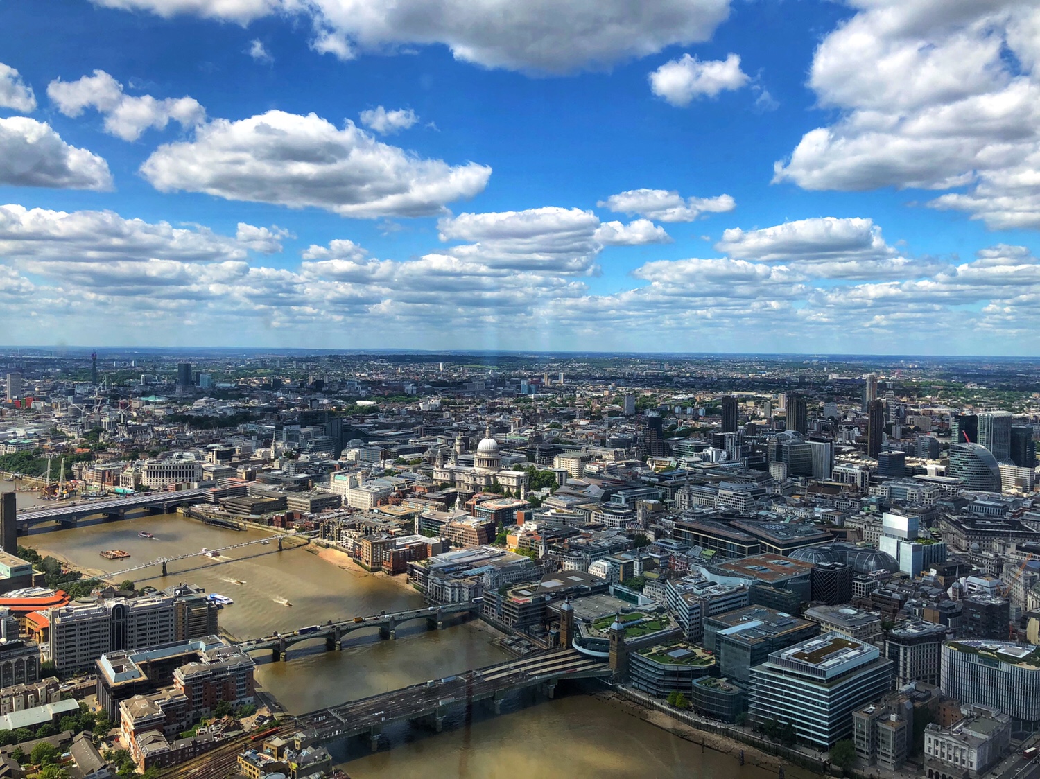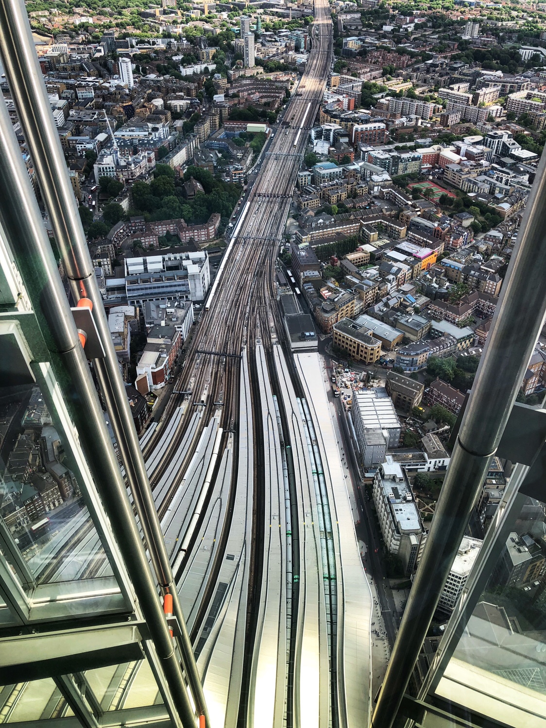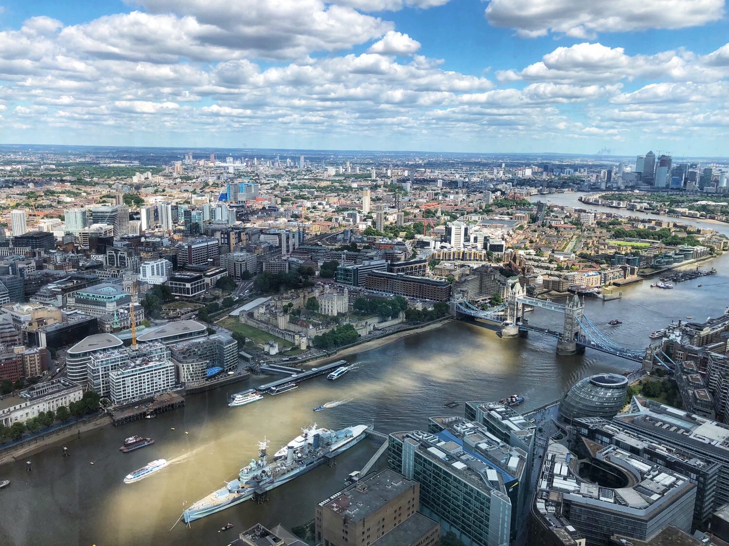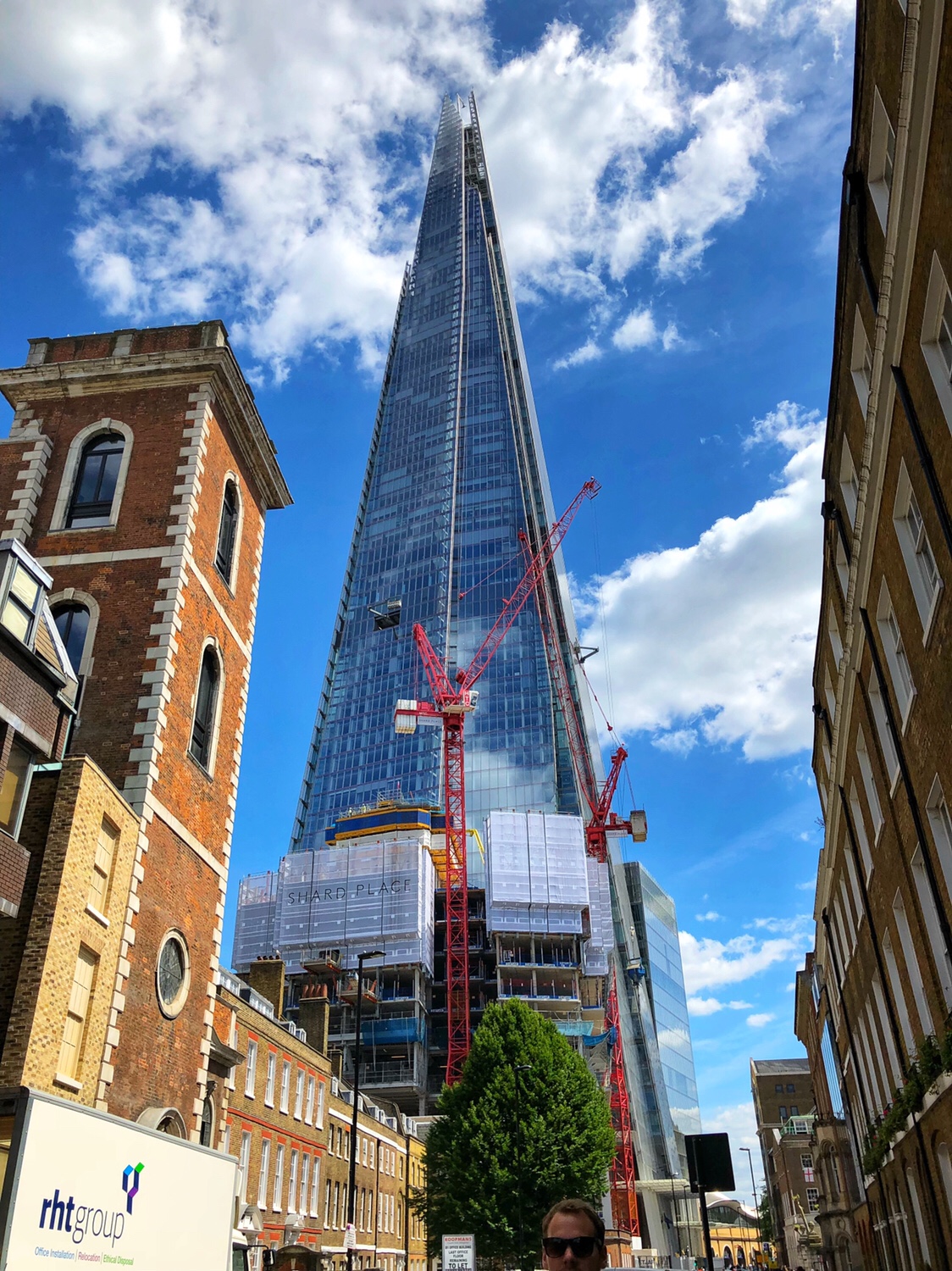 碎片大厦是英国的最高的建筑,于2009年开建,2012年完成,是意大利著名设计师伦佐·皮亚诺( Renzo Piano )设计建造的。它还有一个浪漫的名字,叫“摘星楼”。之所以叫碎片大厦是因为整个建筑由11,000个玻璃薄片组成,尤其是大厦的最顶端,看起来就是尖尖的玻璃碎片。在顶端的观景平台上,可以坐在那里点一杯香槟,360度的欣赏伦敦美景。(我俩的一卡通当然也包含了这里的票,在领取门票的时候,工作人员给了我俩购买香槟的优惠券,折扣后一杯香槟还要10英镑!小气的我俩当然没有花那冤枉钱啦,哈哈哈哈😄😄😄😄😄😄)