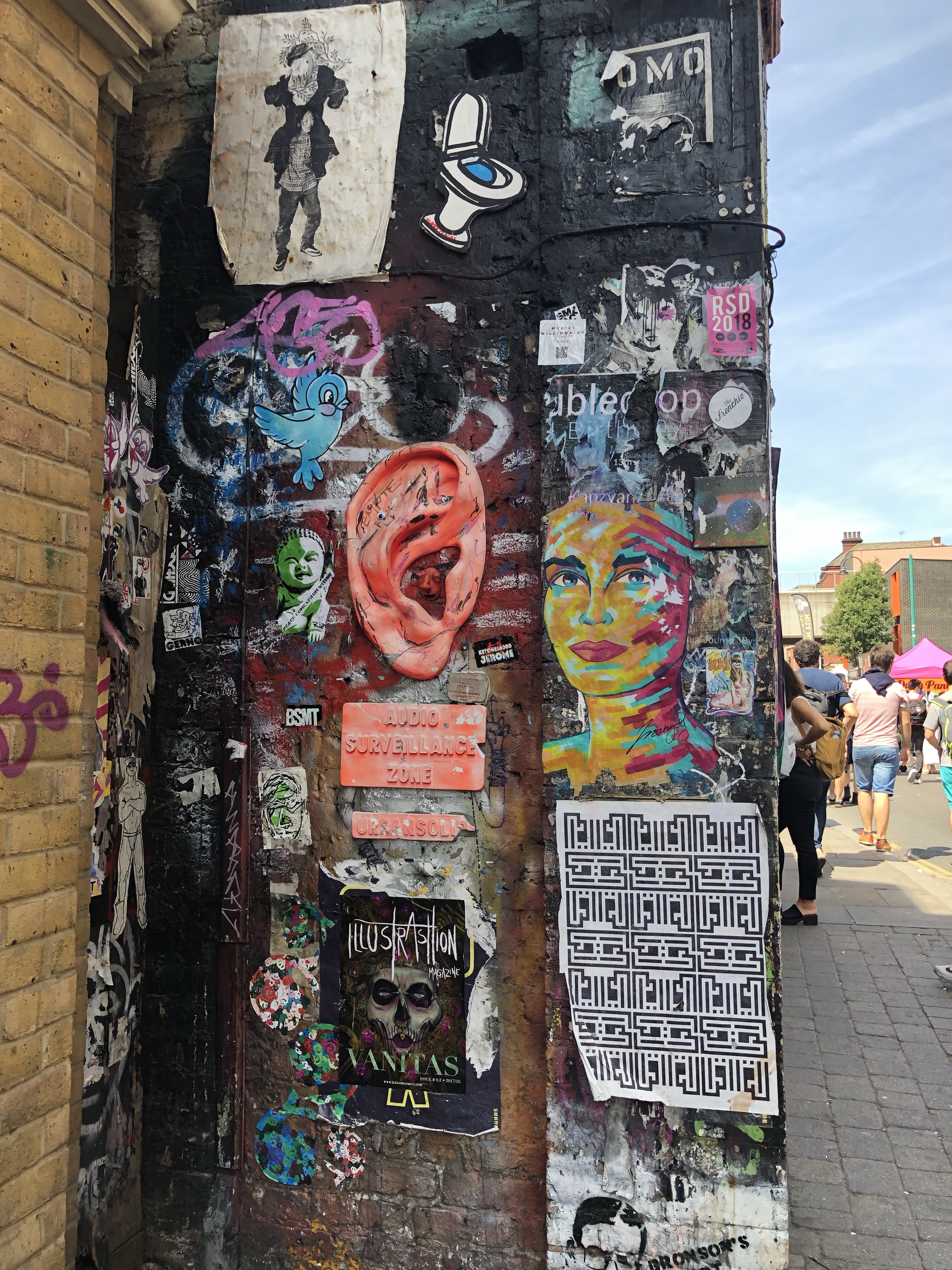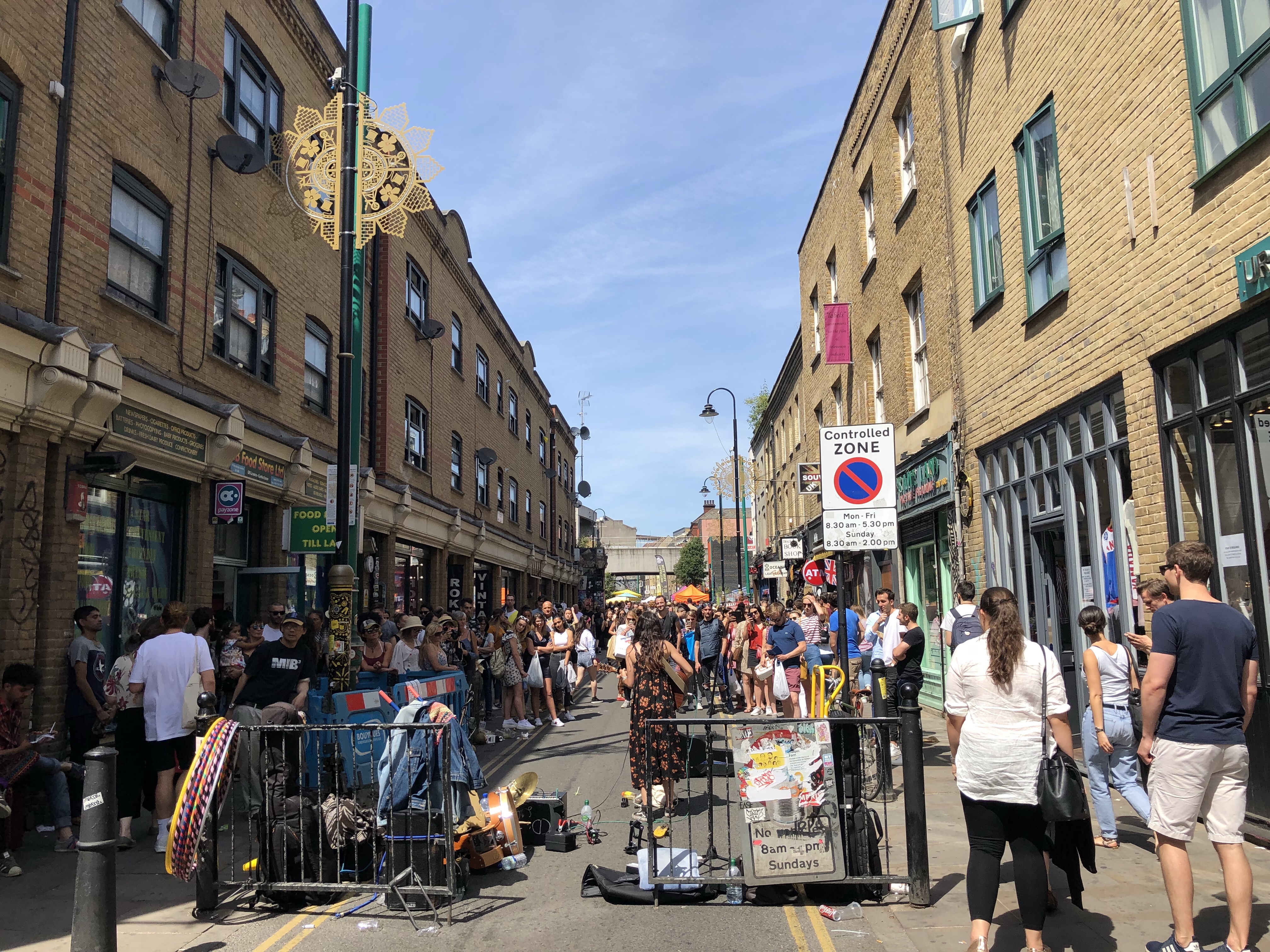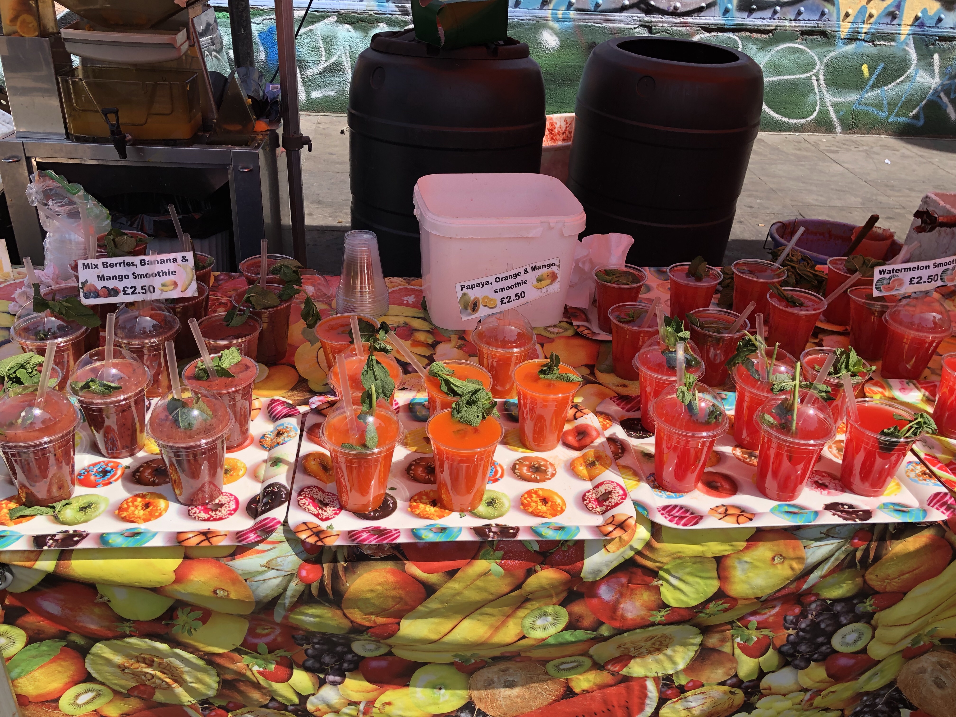 很巧合的是今天是周日,这里有比平时都大的市场,比前几天去的博罗和卡姆登区市场要大很多,这个市场很接地气,各种街头小吃 ,很多亚洲菜小摊,尤其是中国菜,都是已经做好的菜,炒面什么的,放到一个一个的大盆子里卖; 各种商品玲琅满目,小饰品,衣服,包,工艺品等等,感觉价格应该也是比较平民的;这里还有风格各异很引人注目的街头涂鸦和街头表演。