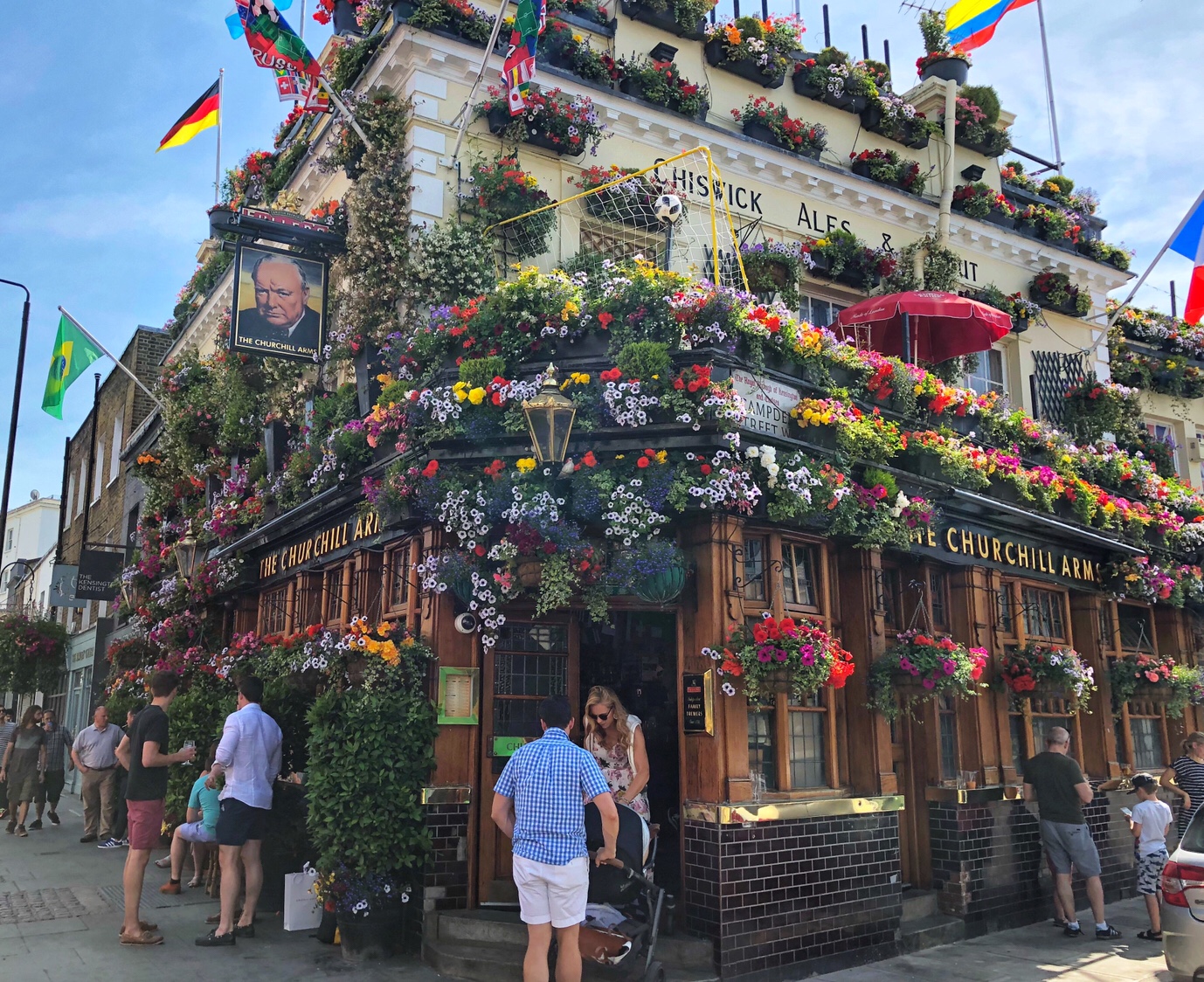 Before going to Kensington Palace, we went to see a cool pub, called Churchill Bar. The bar was built in 1750, and in the 1800 ‘s, Churchill’s grandfather and grandmother were regulars at the bar, and after WWII being called Churchill’s Bar. The bar is unique because of its distinctive and beautiful floral arrangement and hanging baskets outside. And this beautiful little bar shows a different view for every season.