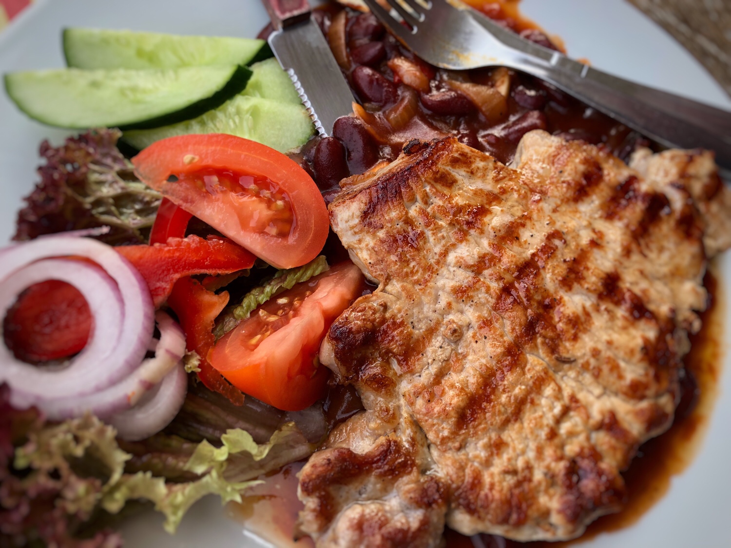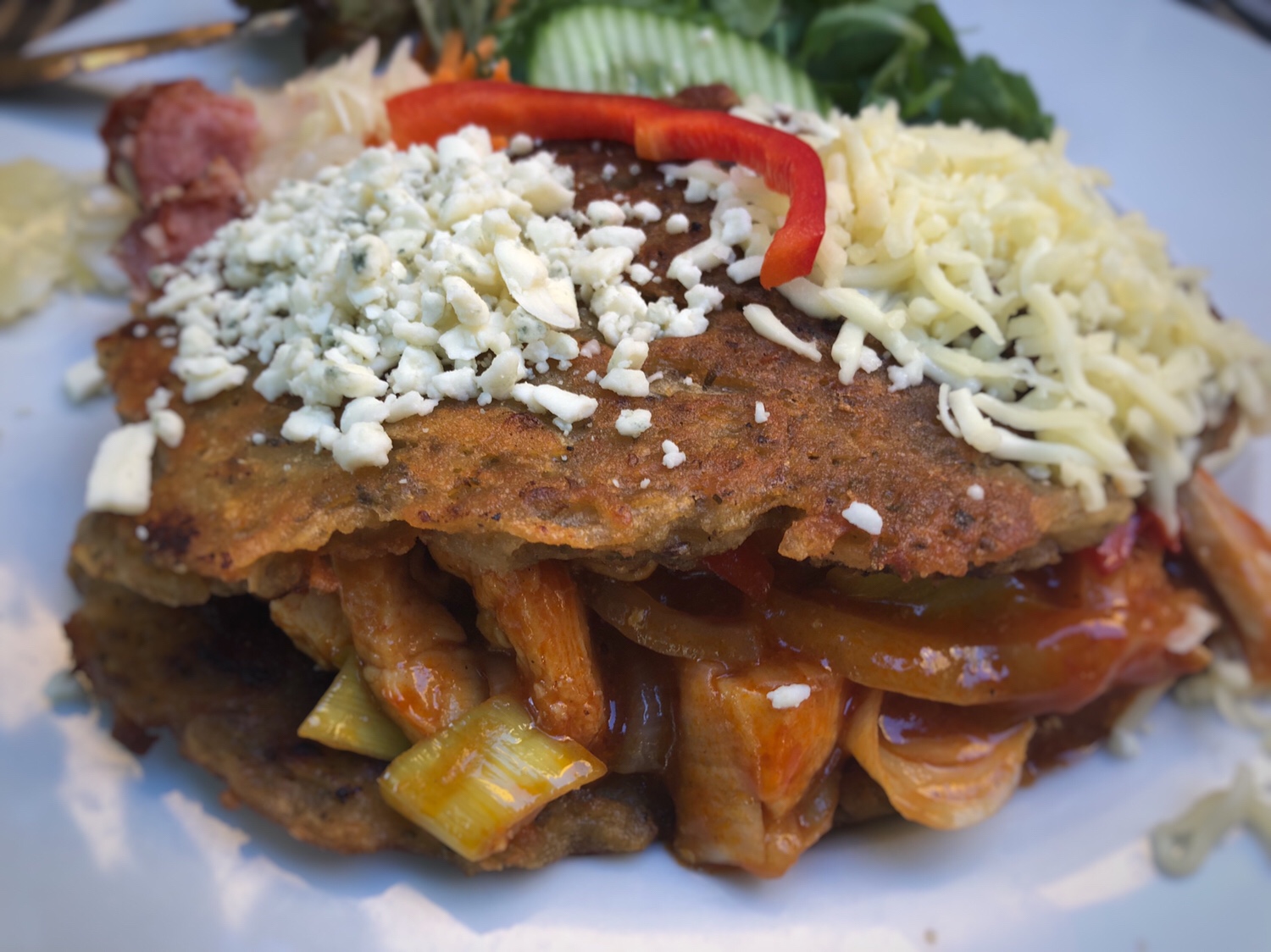 这是我俩到布拉格后的第一顿晚餐,我俩溜达到老城广场,没想到这里的游客太多太多了,在广场中央的餐厅虽然位置好,可以坐在那里欣赏过往人群,可是价格太高了,而且都是针对游客的,我感觉味道肯定不会好,所以我俩就继续走,稍微远离了广场中心,碰到了这家饭店,价格还比较合理 😀 我点了他们菜单上的三个捷克传统菜的其中一个,翻译过来应该是炖猪肉和饺子,等菜上来后,我才发现那个根本不是饺子,而是和我们的馒头差不多的面食。看起来很有胃口的一道菜,我一吃,突然感觉这种味道怎么这么熟悉?非常像PJG平时做的一道墨西哥菜辣酱玉米饼馅! 那个酱汁的那种辣的味道和PJG用的辣酱几乎一样! 难道我俩进了一家有捷克传统菜的墨西哥餐厅? 😂😂😂 总之,味道还算不错,比我想象的要好。