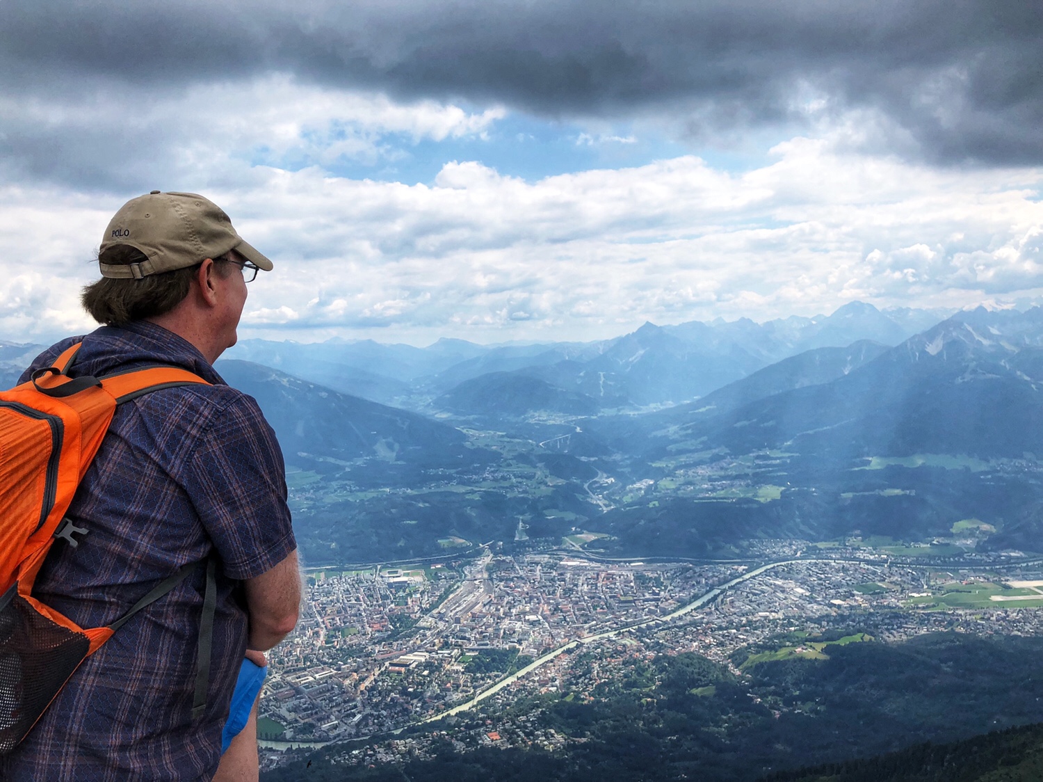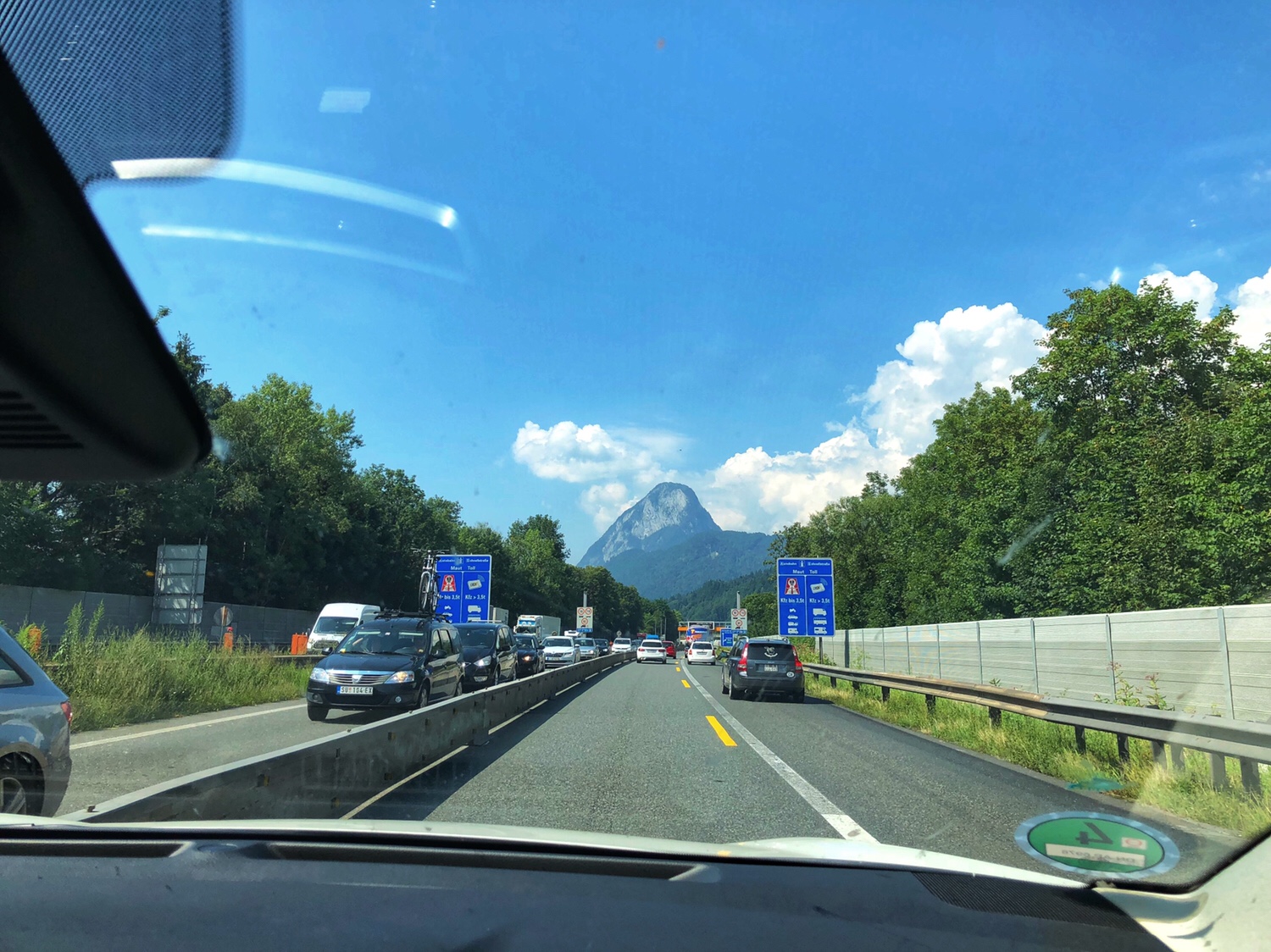 During our first few days in Salzburg, we planned to drive to Innsbruck and pursue PJG’s father’s footprint from 69 years ago. Yesterday we saw that the weather forecast was for no rain today but that it would rain the day after tomorrow, so we decided to make the two hour journey today. The middle part of the drive goes back through Germany and not long after leaving Salzburg we come to a big traffic jam on the motorway. We wondered what the reason for the traffic was and we didn’t know we were about to cross into Germany. It turns out, it was a border inspection and the first time we encountered one in the EU after crossing several borders. But in reality, its just a basic checkpoint where they ask a few questions and you don’t need a passport. Many of the vehicles don’t even need to even stop.  But we were not that lucky. I think because the rear window of our car used a black glass film, so the inspectors couldn’t see in – so they asked us to roll down the rear windows.  Then they asked us where we were going, where we came from, and then wished us a pleasant journey. The traffic jam situation delayed us for more than 20 minutes.