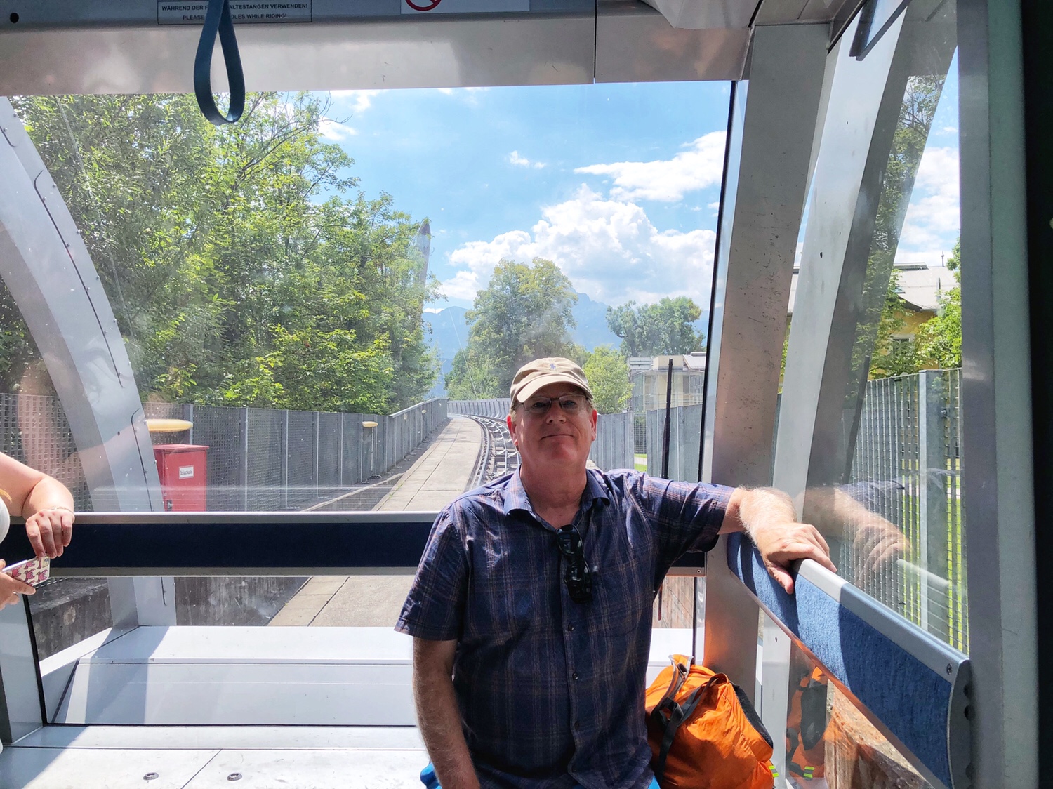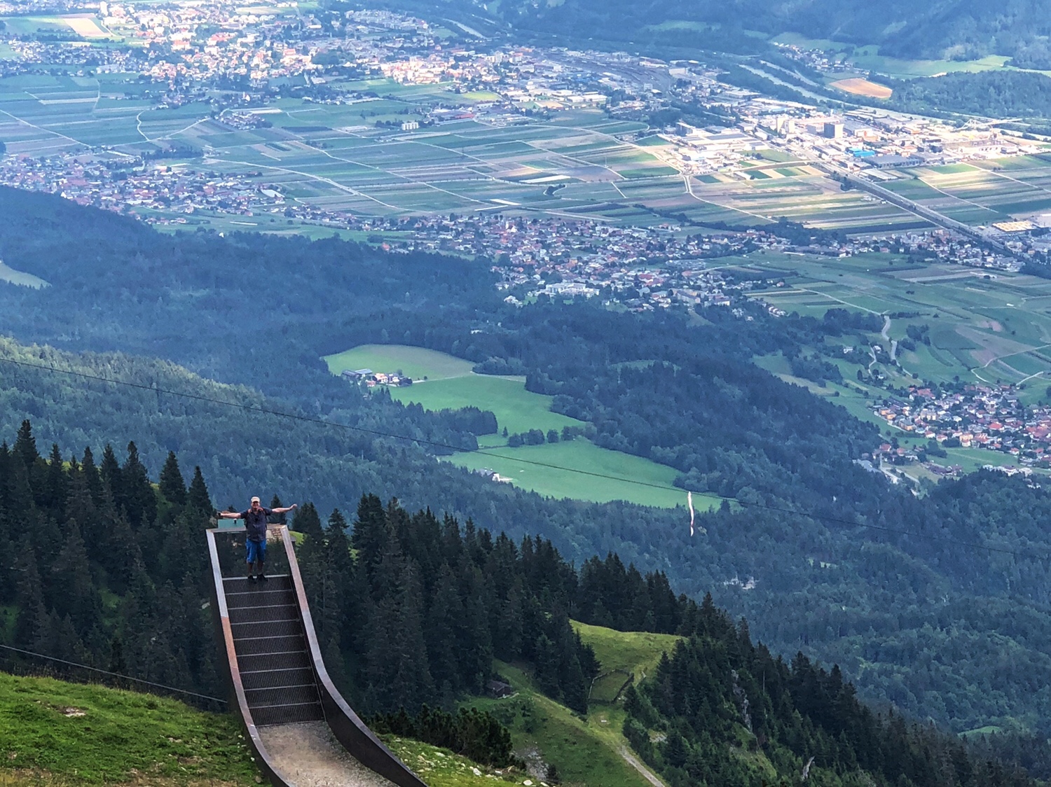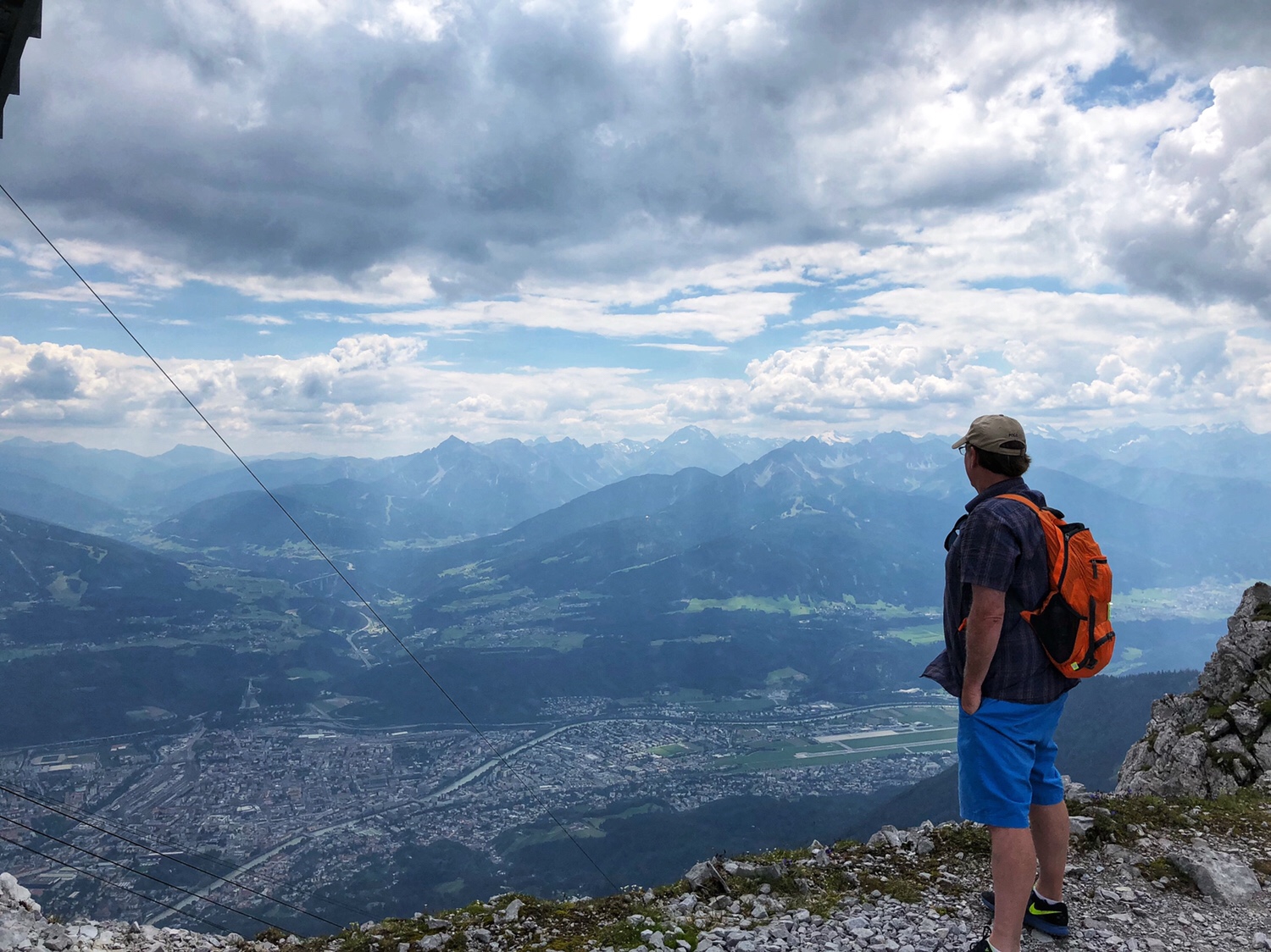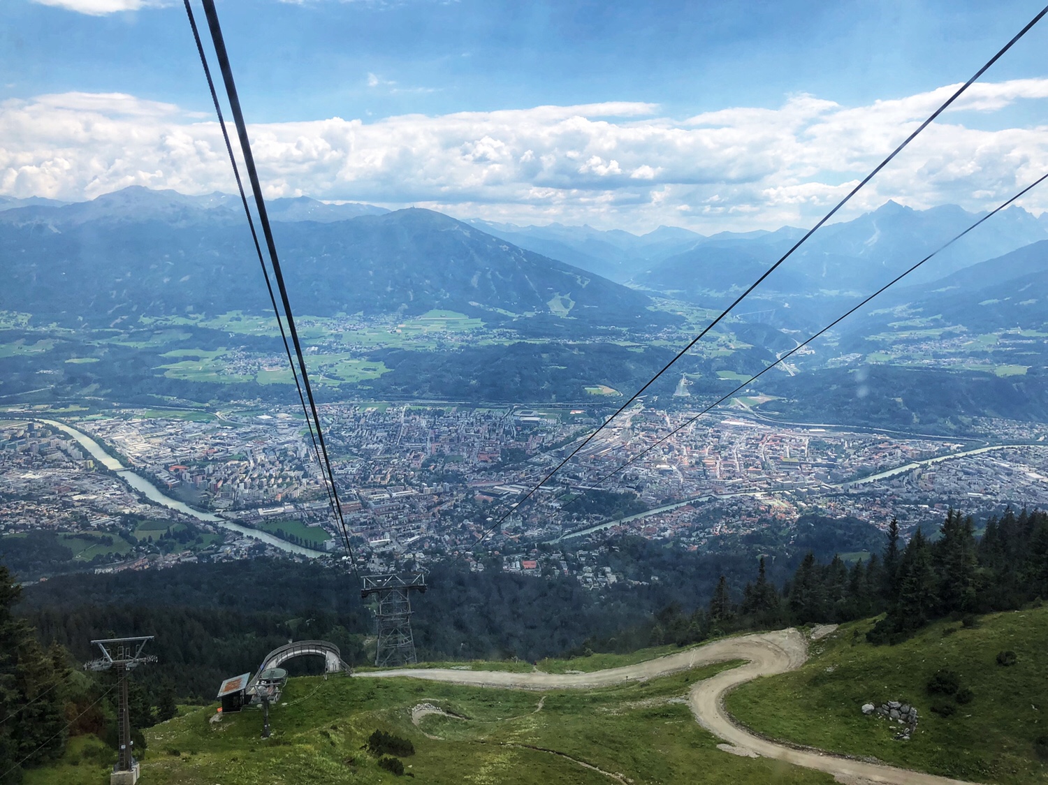 I don’t know what the cable car was like 69 years ago. Today, the cable car going up the mountain is divided into three sections. From Innsbruck to the Hungerburg station we used the funicular then we get the first cable car to the Seegrube station at 6250 feet above sea level. Then finally we change to another cable car that takes us to the Hafelekar peak, that reaches 7650 feet above sea level.