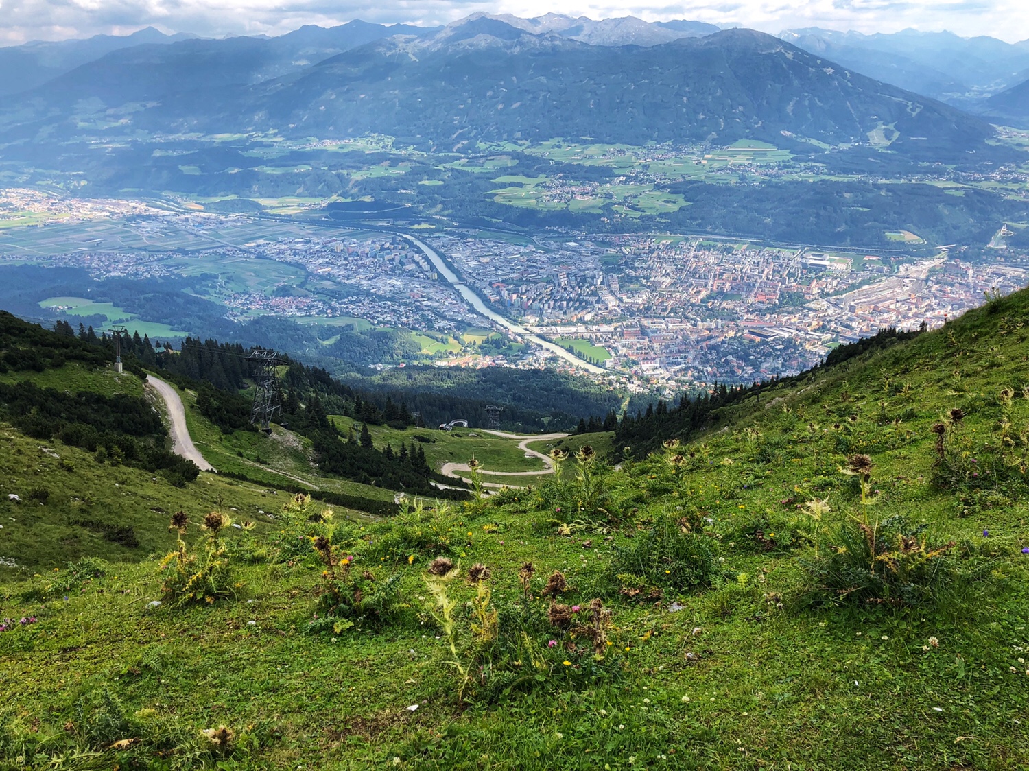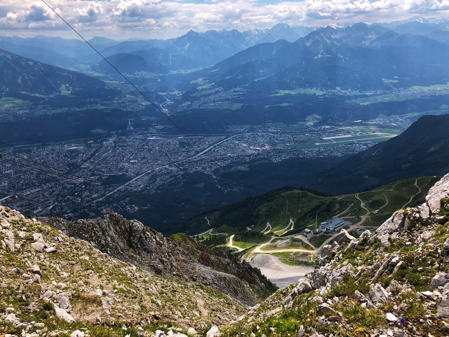 山下的因斯布鲁克市一览无余 . The city of Innsbruck nestled in the mountain valley with unobstructed views of the alps.