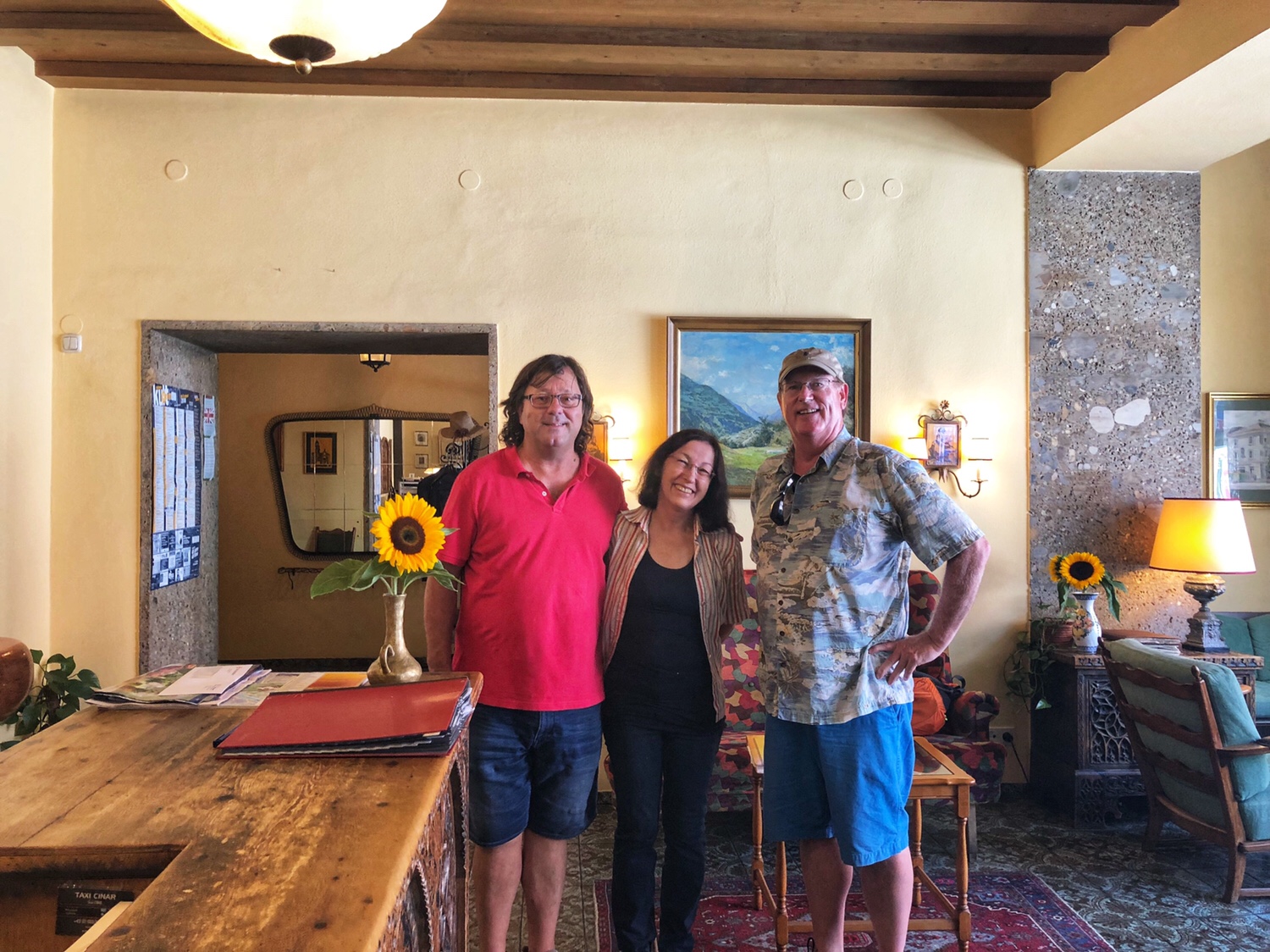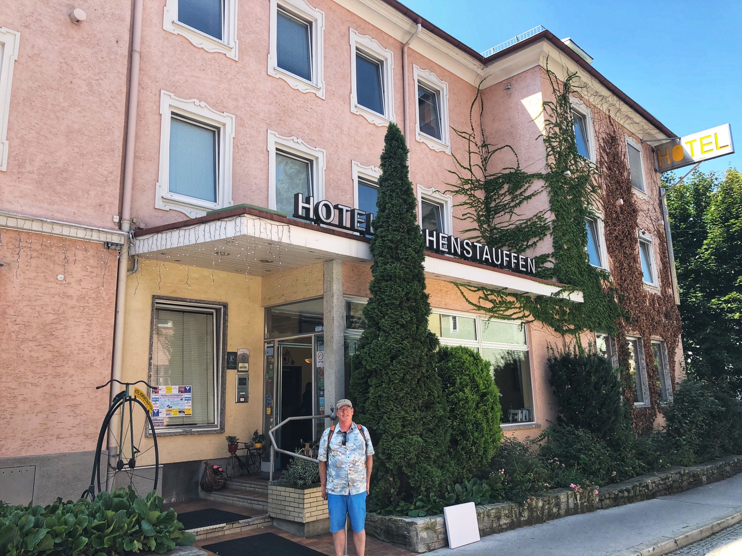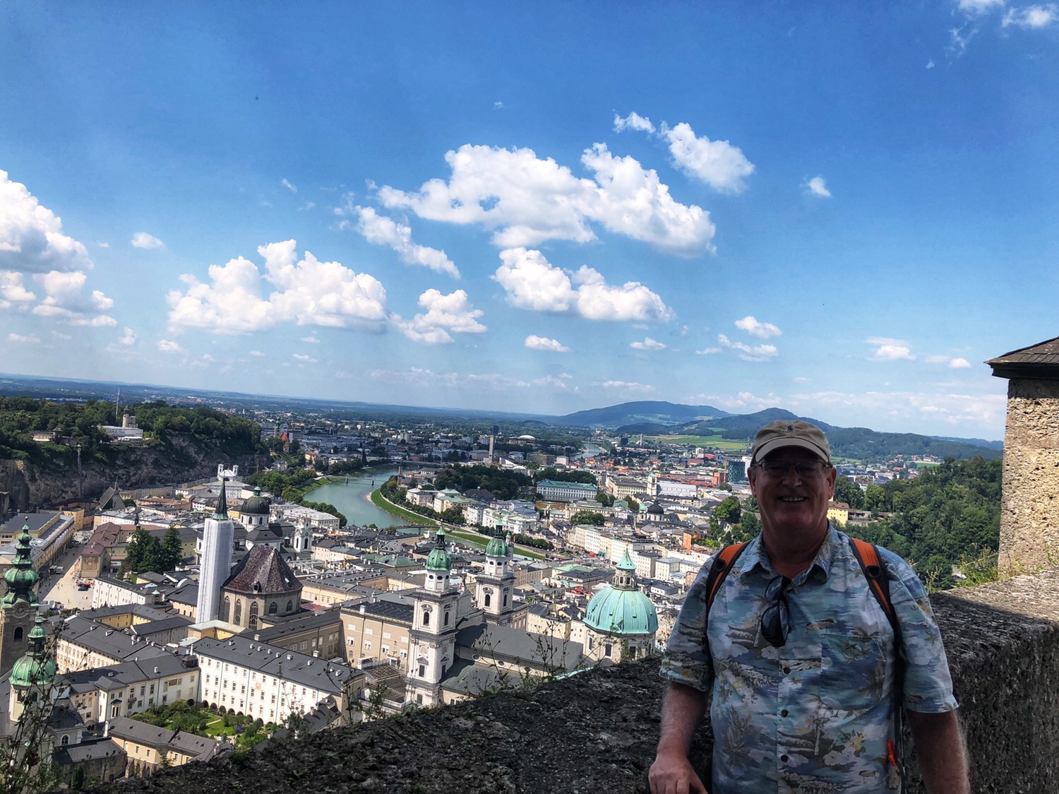 In the morning, we bought a 72-hour Salzburg card online. Like other cities, it allows unlimited public transportation in the city, and some attractions are free or discounted. Although we bought it online, we still had to go to the Salzburg Tourist Information Center at the train station to get a physical card, which seemed silly. Anyway, since we were at the train station we took a short walk to the Hohenstauffen Hotel. This hotel is where PJG’s father stayed 69 years ago. We weren’t sure why he chose this hotel except that it was very close to the train station. PJG actually had an email conversation with the hotel owner last year and on today’s visit we met the owners. This hotel is already in the third generation of a family business. The owner and his wife were very friendly and showed us some old photos, including photos of the hotel from 1901 and in the 50’s. Unfortunately and unsurprisingly, they did not save the registration records from 69 years ago, which would have been a really a precious discovery. As we were leaving, the owner unexpectedly presented us with two large calendars with paintings from a local artists he knew. Very nice to recieve the big calendars, but we don’t really know how we will get them home!