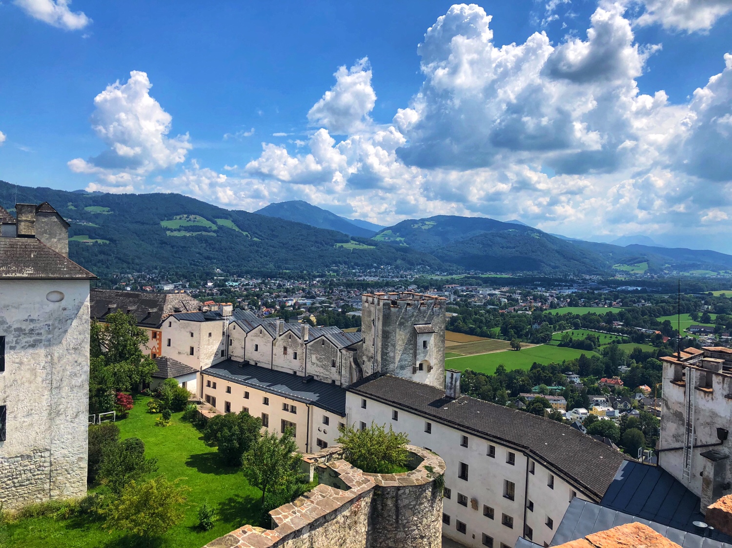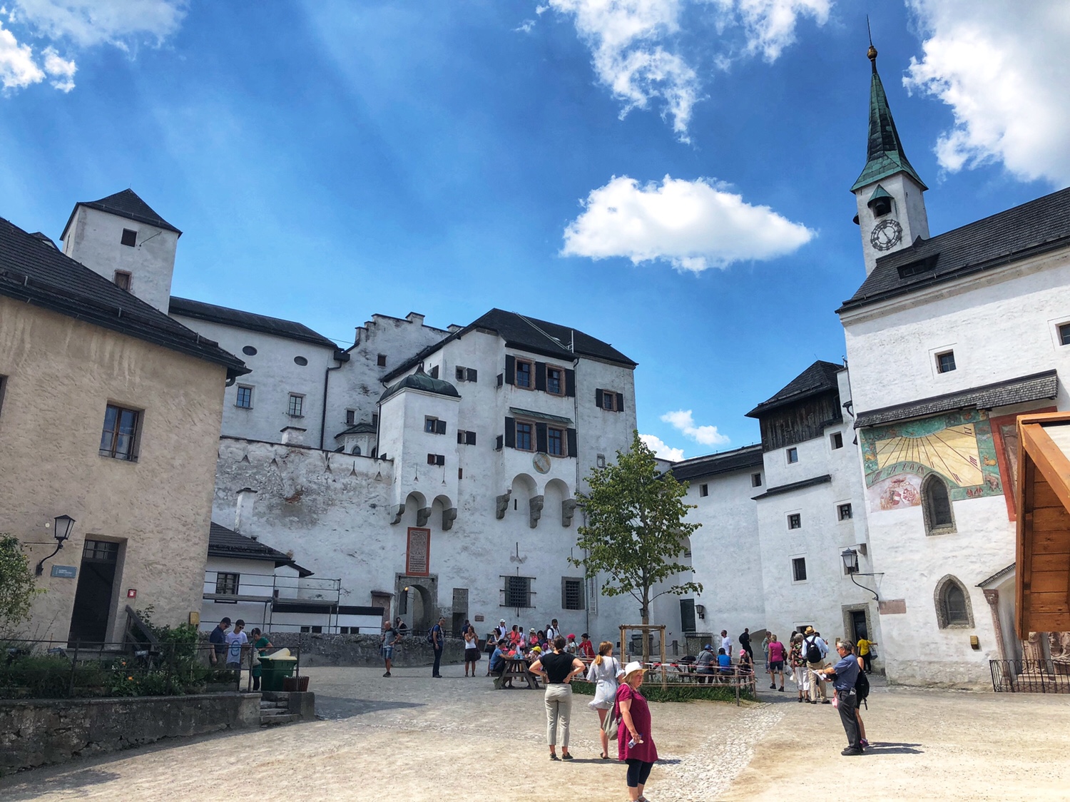 不得不先回民宿把挂历放在再继续今天的游览,下一个目的地是坐落在山上的萨尔茨堡要塞。该城堡要塞是11世纪以来欧洲最大的,保存最完整的中世纪城堡。 欧洲的很多城市都是由宗教的发展而发展起来的,萨尔茨堡要塞据具体始建年份不详,但是是由历任总主教逐步扩建而形成今天的要塞。在1515年要塞就修建了铁索缆车用来运送货物。我俩今天也坐了缆车上山游览要塞。