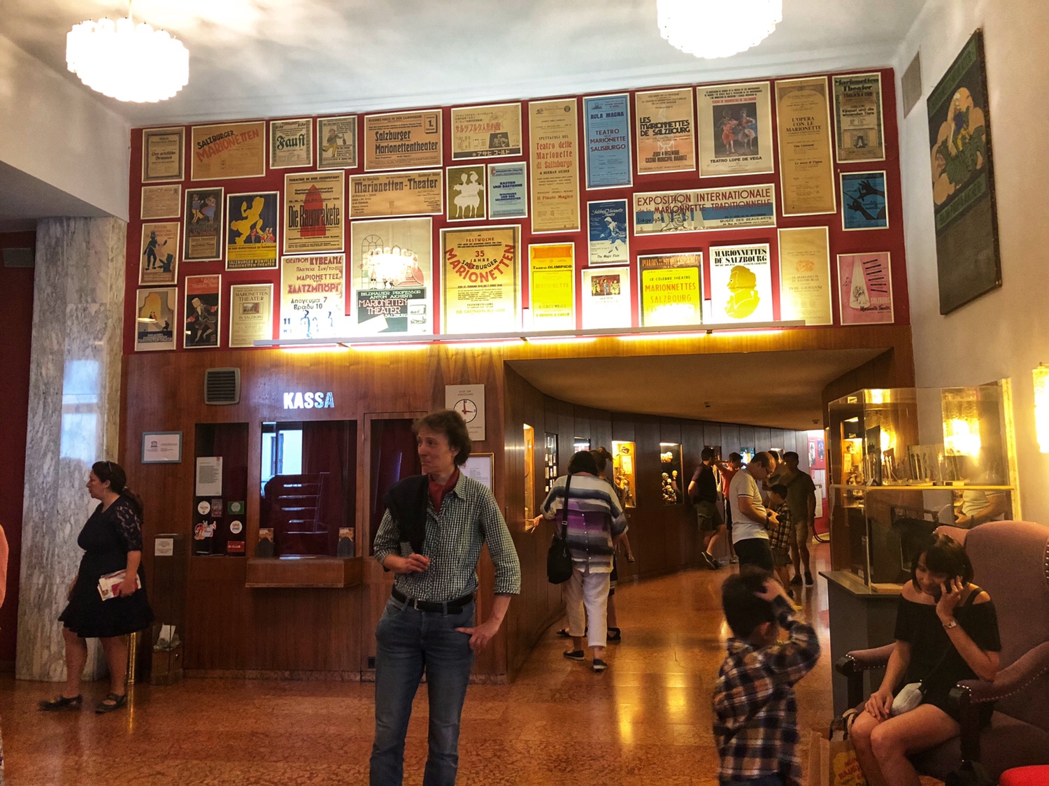博物馆内并不允许拍照片,所以没有照片可以分享。参观完了莫扎特出身地博物馆,我俩去一个民宿房主推荐的吃一个甜点的地方,吃了甜点后,就赶去萨尔茨堡木偶剧院看5点开始的牵线木偶剧 – 音乐之声。PJG的父亲当年也去过这个木偶剧院看了一出牵线木偶剧,不过就不知道是不是“音乐之声”了。萨尔茨堡木偶剧成立于1913年,是世界上最古老的一直在经营的牵线木偶剧的剧场之一。剧场不大,走廊里展示了很多以前演出过的原版的木偶。