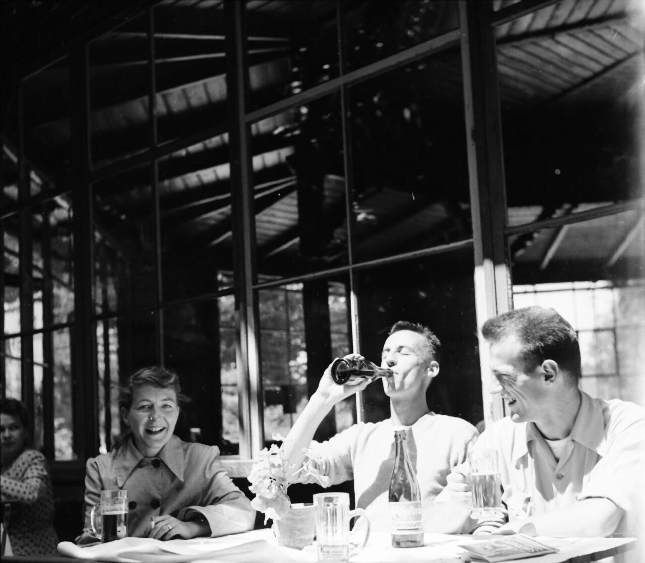 下山后,我俩去了一个附近的啤酒厂-Kaltenhausen,开车有5分钟车程。这里是萨尔茨堡最古老的酿酒厂,开始于1475年。我俩来这里的原因是PJG父亲的下面的这张照片,照片上他父亲和朋友在萨尔茨堡的某个地方喝啤酒,地点实在难以辨认,但是在来到萨尔茨堡经过这里的人的指点,桌子上的啤酒瓶子的啤酒牌子被辨认出来了,就是Kaltenhausen的自酿啤酒。所以我里觉得没准他父亲和朋友就是在那里拍的这张照片。可惜,到了那个啤酒厂后,没有找到和照片相似的地点。那里的一个服务员虽然很友好地回答我俩的问题,可是她也不能确认照片上就是这里。遗憾啊~~~