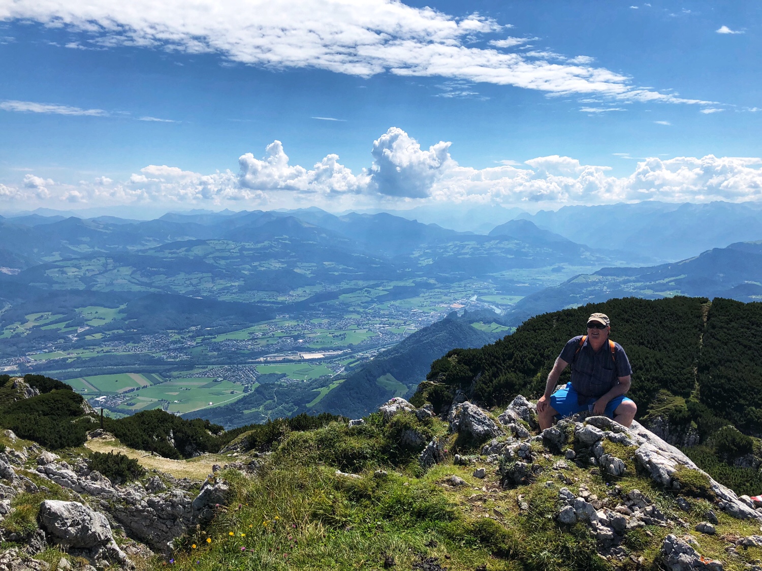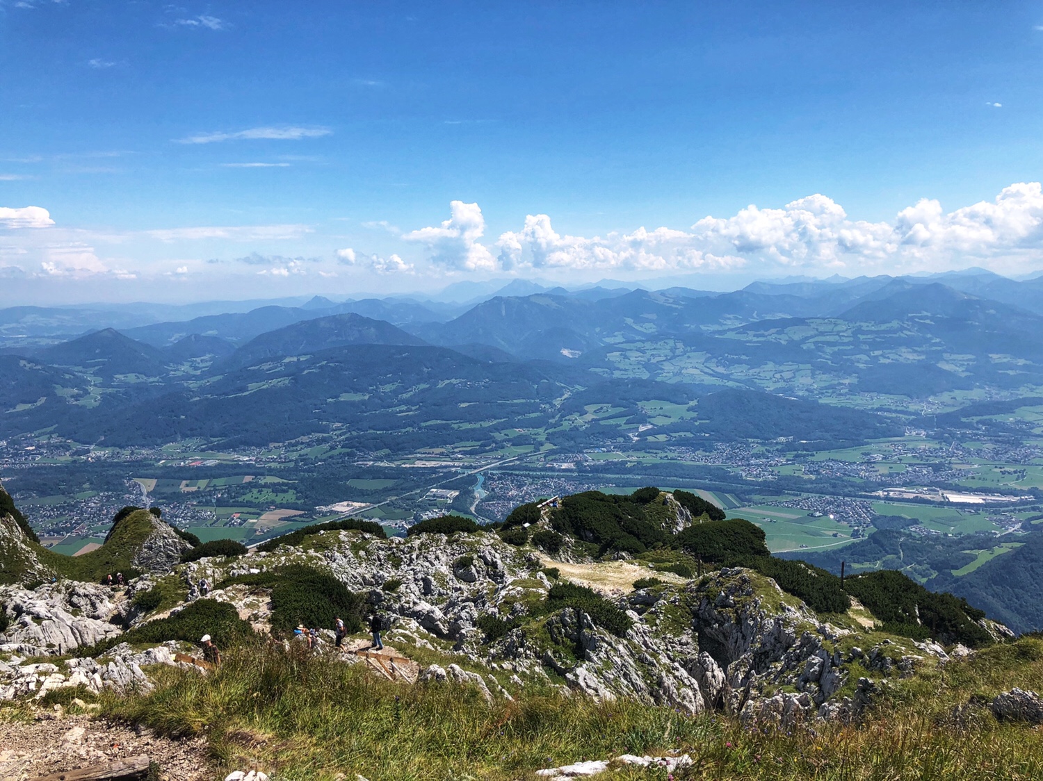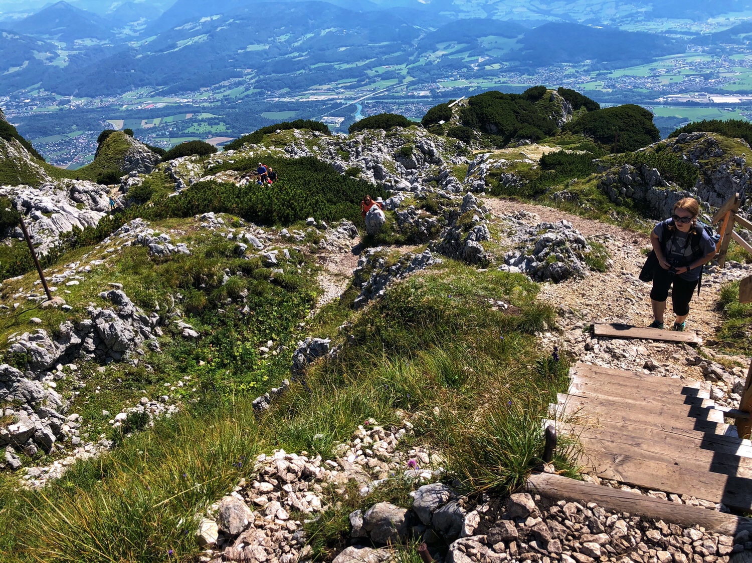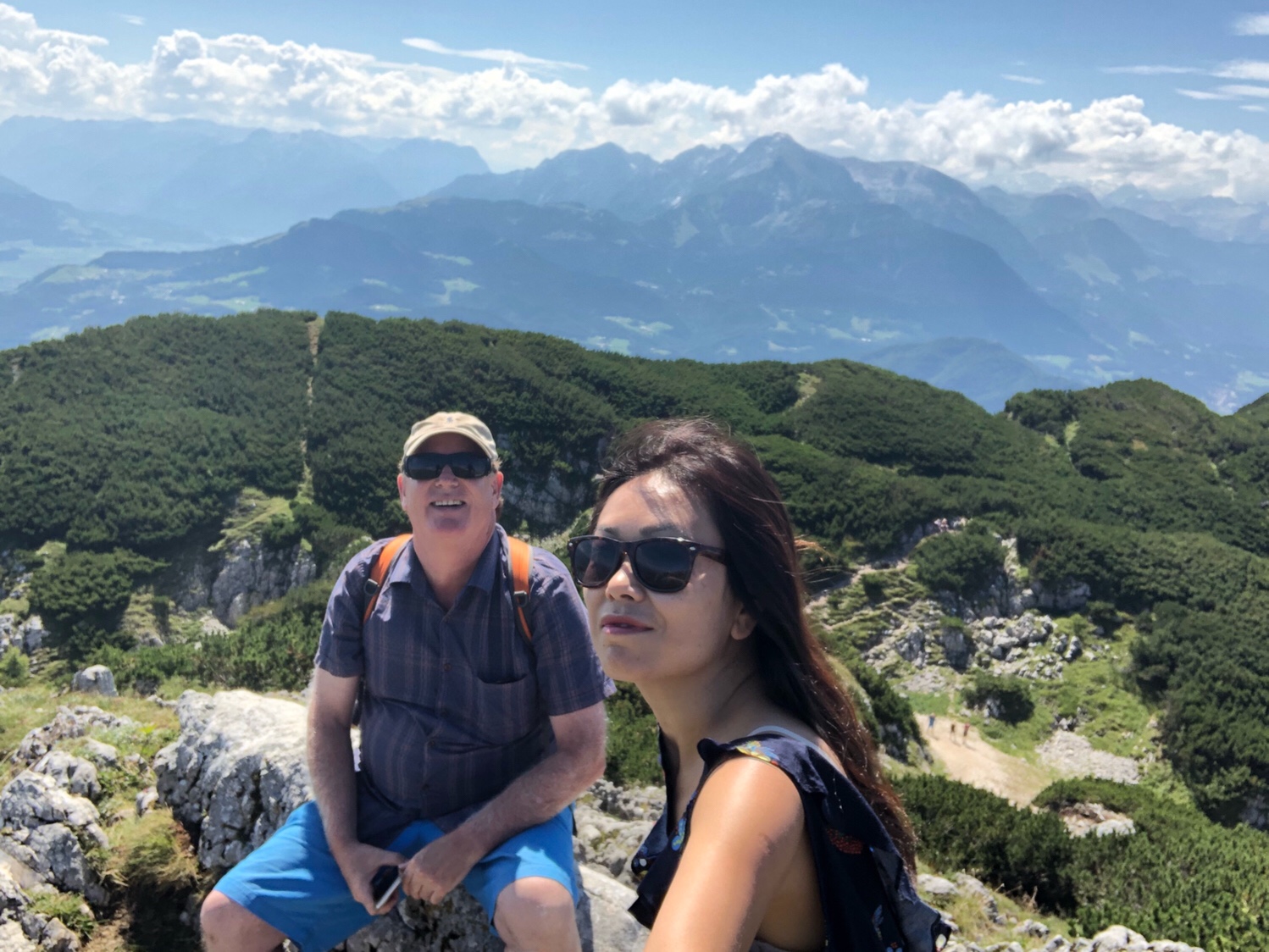 It took only 5 or 6 minutes for the cable car to get to the top of the mountain. The Mountain is not as high as the mountains in Innsbruck that we were at the other day – this mountain is only 6470 feet above sea level. The scenery on the top of the mountain is very different. There is a large area of green vegetation on the top of the mountain. Surrounded by mountains, overlooking the northern part of the Salzburg valley. After getting off the cable car, we had to climb the final part of the mountain to reach the top. I didn’t really dress for climbing a mountain. I am sure many people were laughing at me as a typical tourist. In fact, PJG has been laughing at me, and he asked, why do all asians dress up to go hiking up a mountain? 😂😂😂