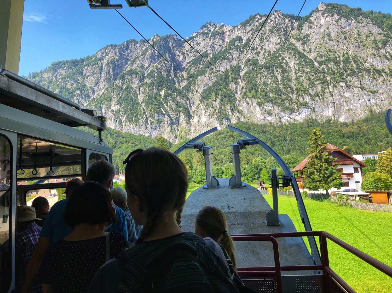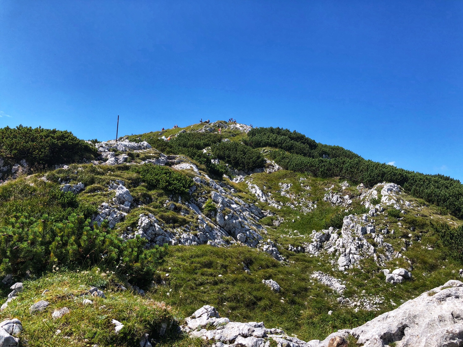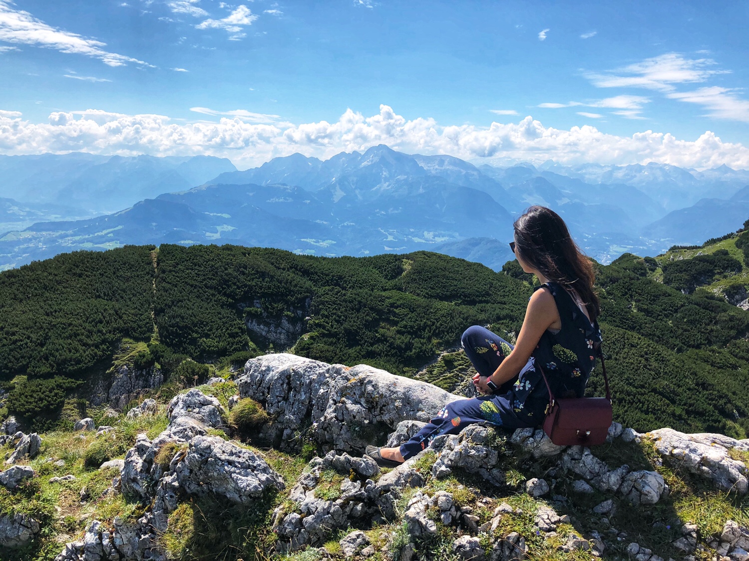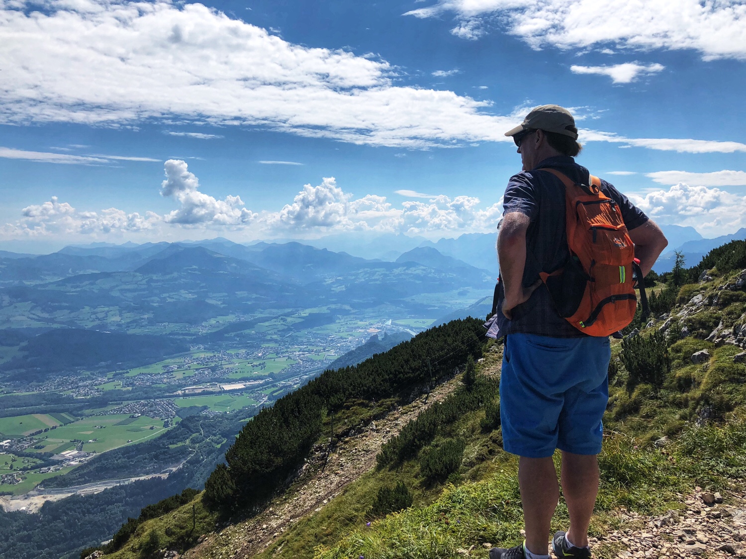 It took only 5 or 6 minutes for the cable car to get to the top of the mountain. The Mountain is not as high as the mountains in Innsbruck that we were at the other day – this mountain is only 6470 feet above sea level. The scenery on the top of the mountain is very different. There is a large area of green vegetation on the top of the mountain. Surrounded by mountains, overlooking the northern part of the Salzburg valley. After getting off the cable car, we had to climb the final part of the mountain to reach the top. I didn’t really dress for climbing a mountain. I am sure many people were laughing at me as a typical tourist. In fact, PJG has been laughing at me, and he asked, why do all asians dress up to go hiking up a mountain? 😂😂😂