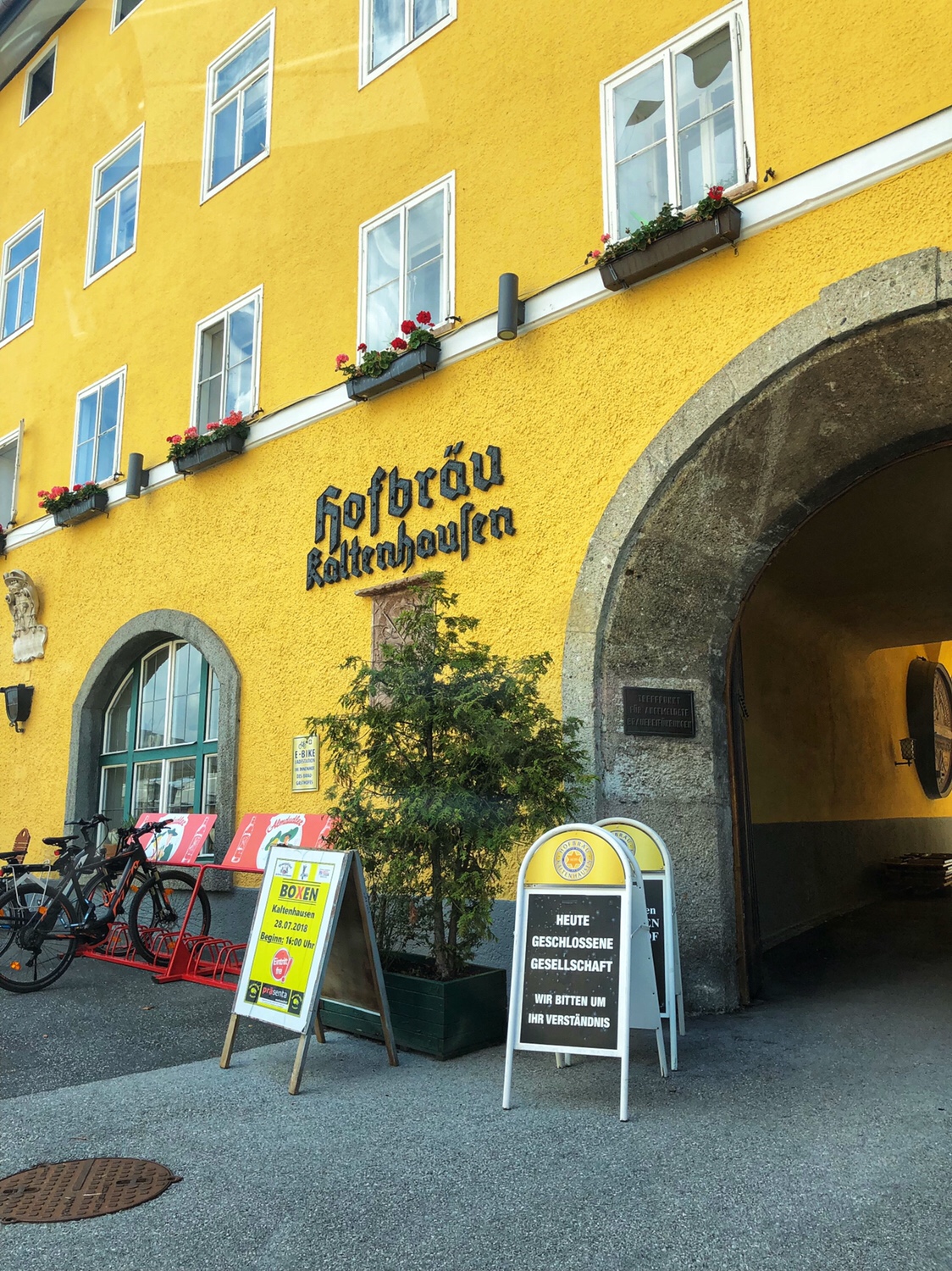 After coming down the mountain, we decided to visit a nearby brewery, Kaltenhausen, which was only 5-minutes away. This is the oldest brewery in Salzburg, founded in 1475. The reason we came here is to investigate the photo below taken by PJG’s father. The photo shows his father and friends drinking beer somewhere in Salzburg. The location is really very hard to figure out, but after coming to Salzburg, we heard that it might be at this location. We had dinner the other night and showed the photo to our waiter who identified the brand of beer on the on the table was Kaltenhausen’s. In those days, most breweries would sell their own beer at their pubs. So it seemed that his father and friends were taking this picture there. Unfortunately, after arriving at the brewery and looking around, we could find no place similar to that in the photo. Although we spoke to a waiter there who answered our questions and was very friendly, she could not confirm that the photos were taken here. Sorry~~~