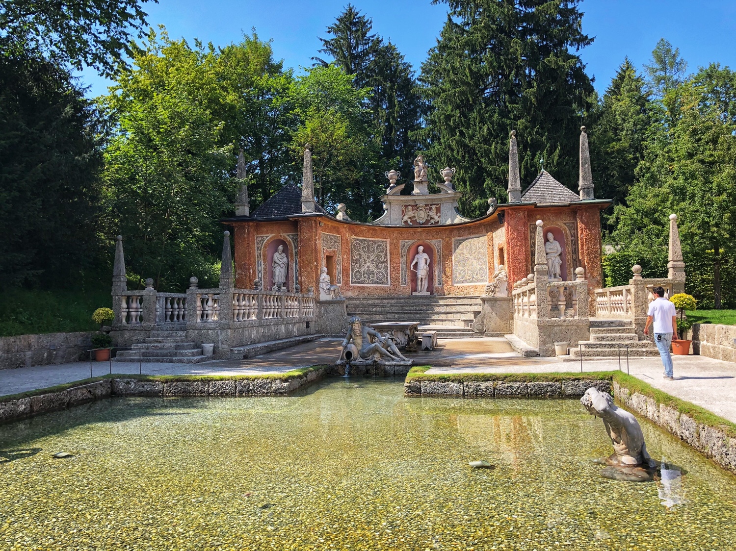 离开啤酒厂,我俩去了海尔布伦宫,开车从啤酒厂大概13分钟就到了。整个海尔布伦宫建于1613到1619年,大到包括一个大花园,一个动物园,以及一个宫殿,很多精心设计的喷泉等。这里是为萨尔茨堡的大主教马尔库斯·西提库斯而建,用于大主教夏季白日休憩游玩和宴客的地方,晚上大主教并不住在这里,所以这里没有卧房。海尔布伦宫最吸引人的地方就是它的机关喷泉。