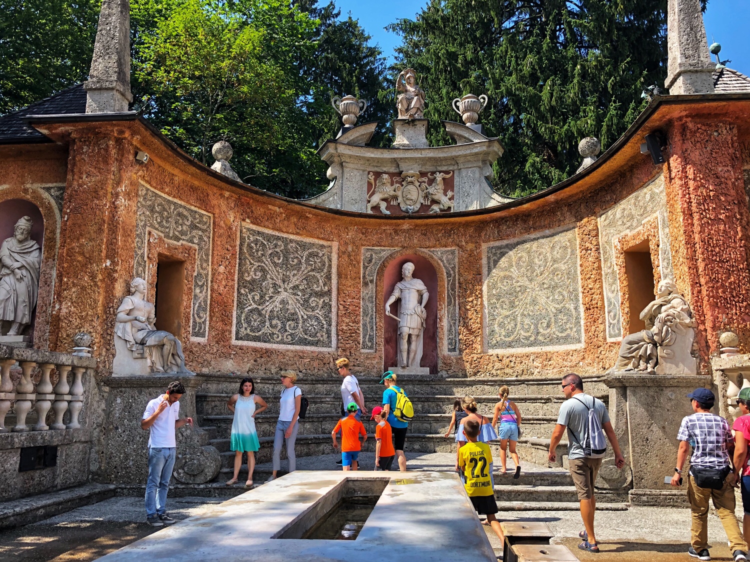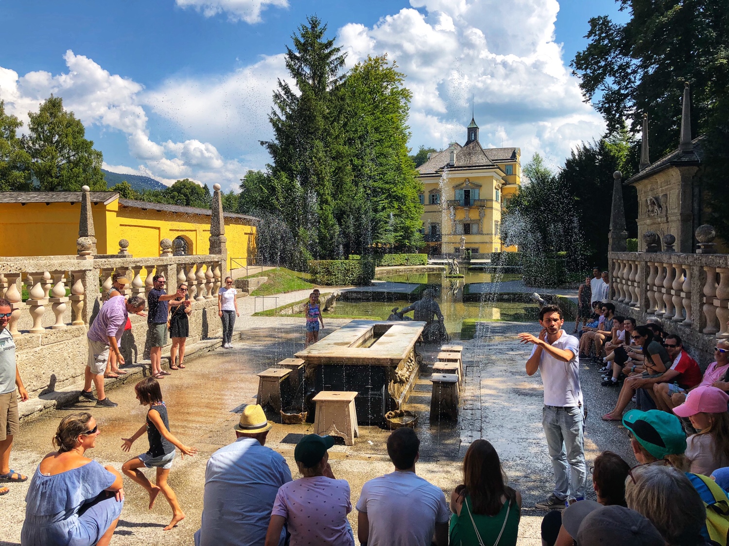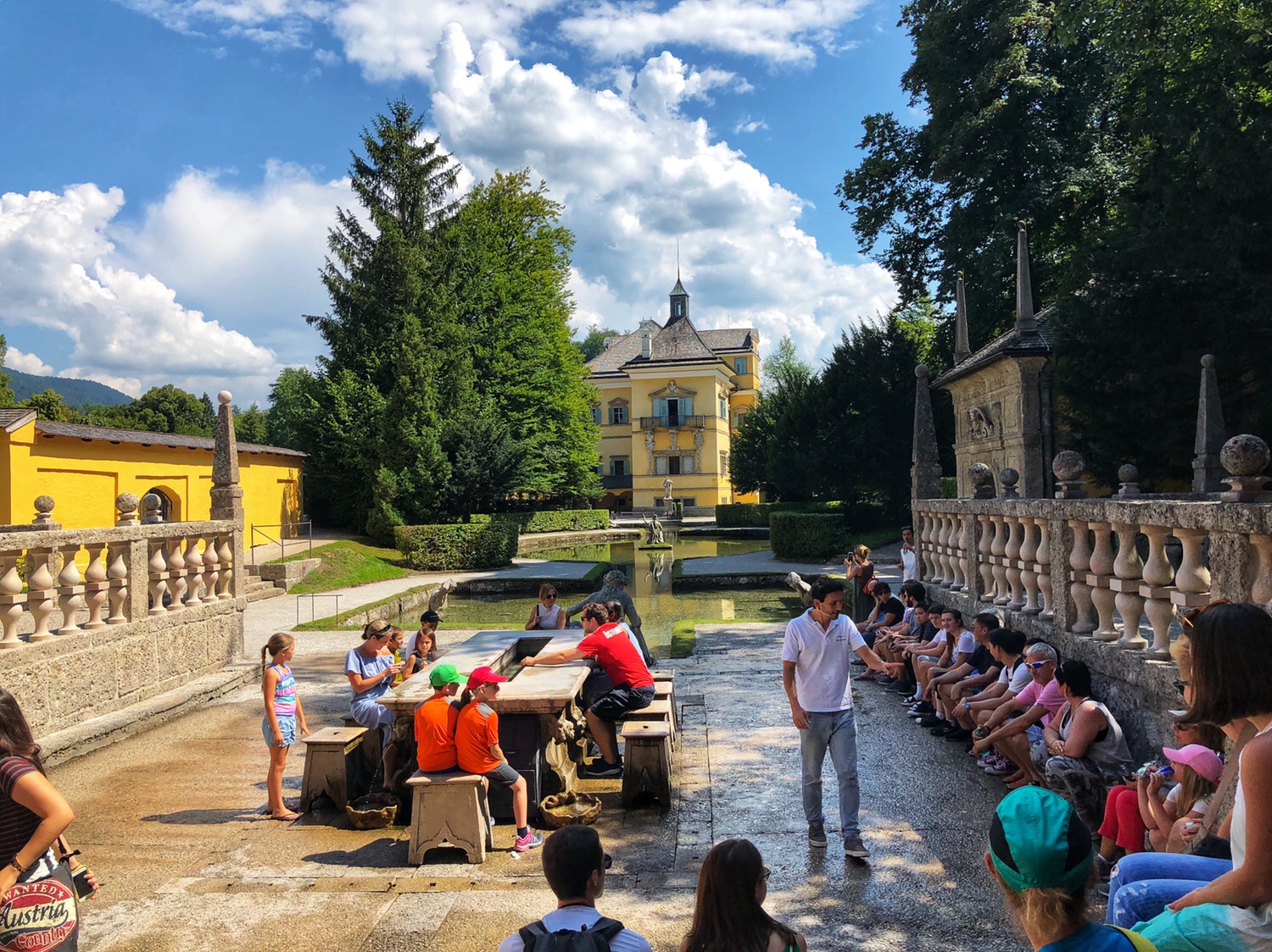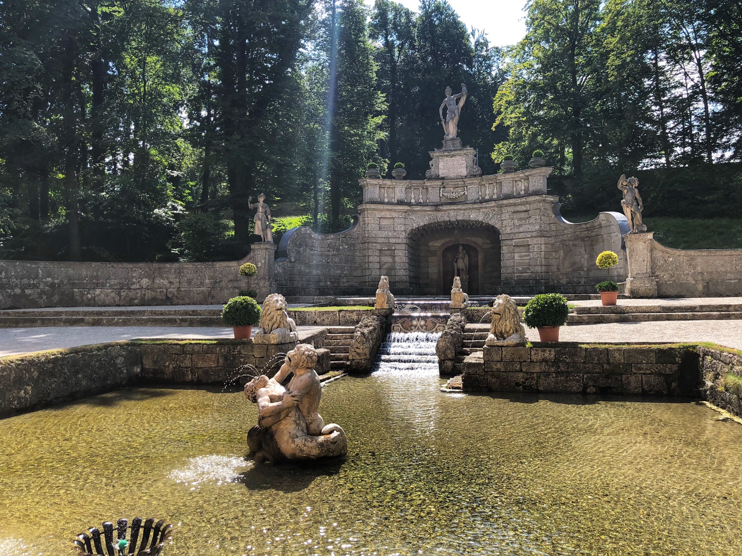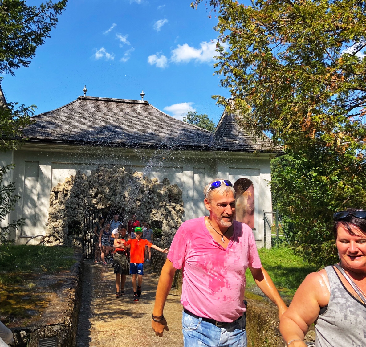 After leaving the brewery, we went to Hellbrunn Palace about 15 minutes from the brewery. Hellbrunn Palace was built between 1613 and 1619 and contains a large garden, a zoo, and a palace with many well-designed fountains. It was built for the Archbishop of Salzburg, Marcus Sitikus, for the Archbishop’s summertime recreation and banquet. The Archbishop did not live there at night, so there was no bedroom. The most attractive part of Hellbrunn Palace are the tricks fountains.