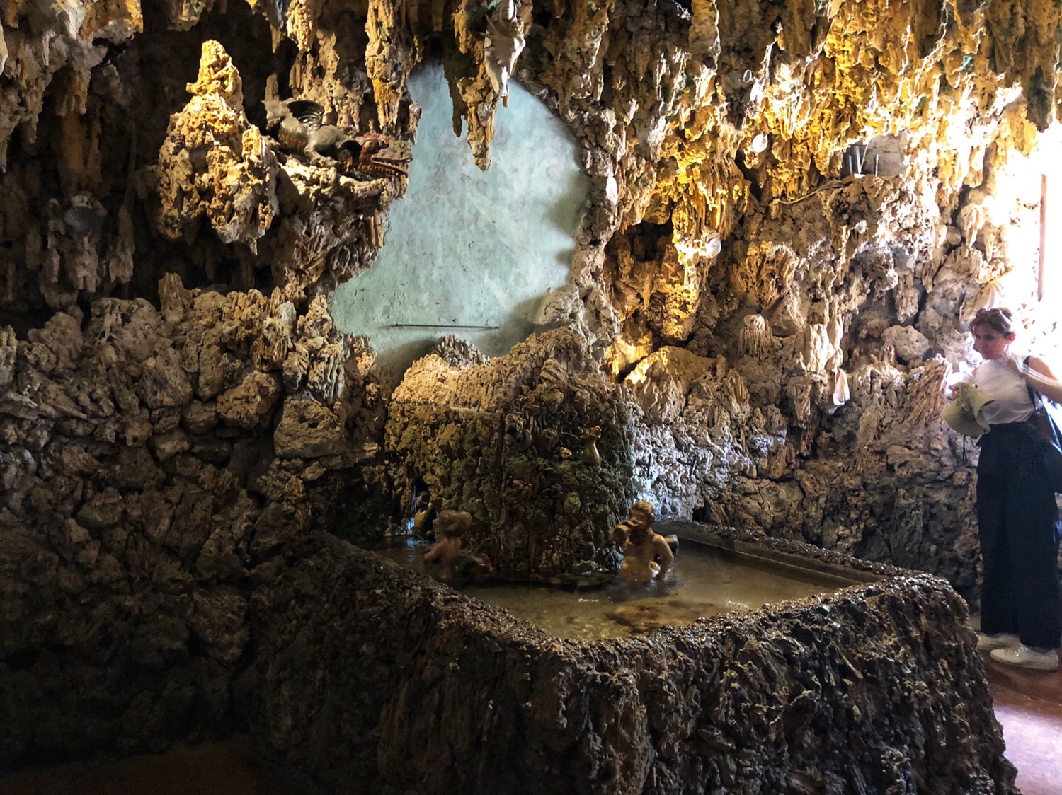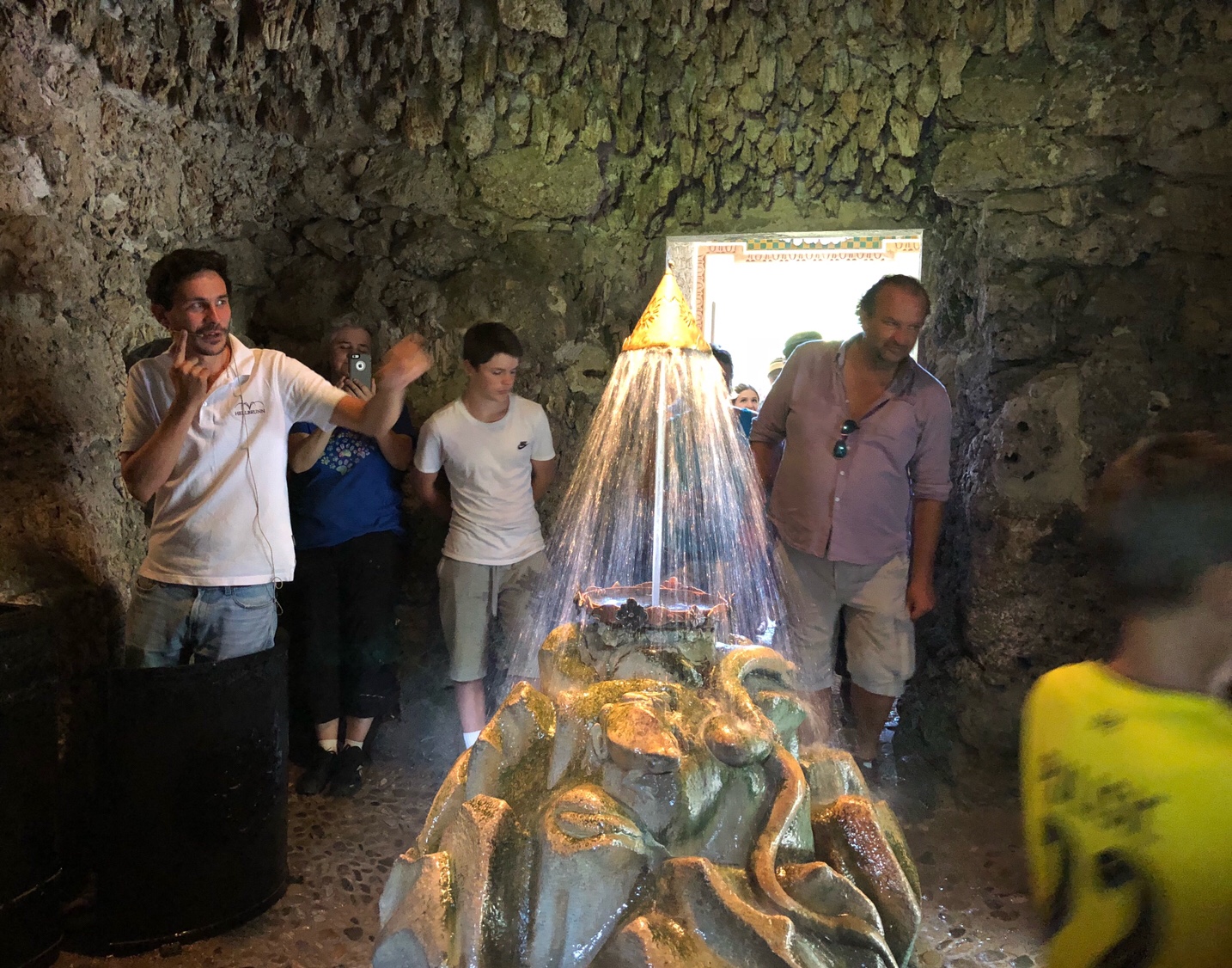 下面照片里的是最后一道机关,我们进到一个石窟里后,导游讲解完那个漂浮的皇冠后,告诉我们可以离开了,然后泉水从两侧的地面突然射出,几乎每个人都被淋湿了,当你走出那道喷水过道以为没事了后,停下来感叹,突然对面的地面又突然袭击射出泉水,😄哈哈 每个人大人或小孩都开心地哈哈大笑 😄😄