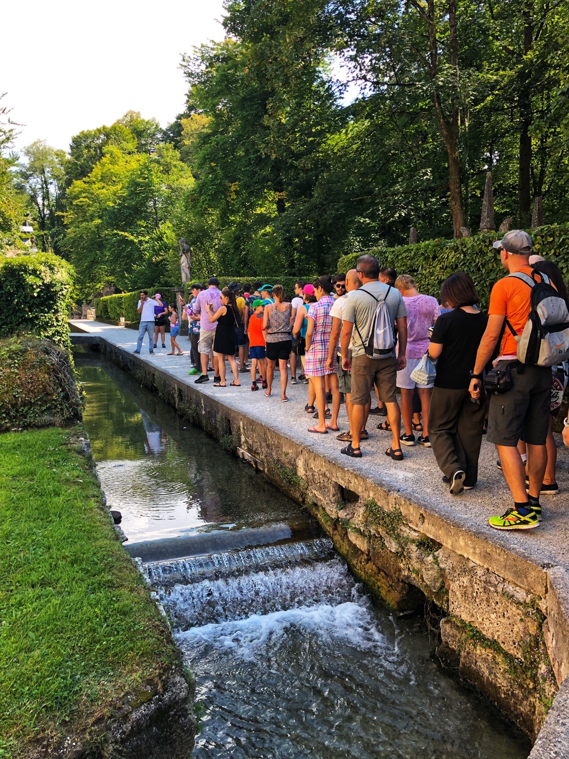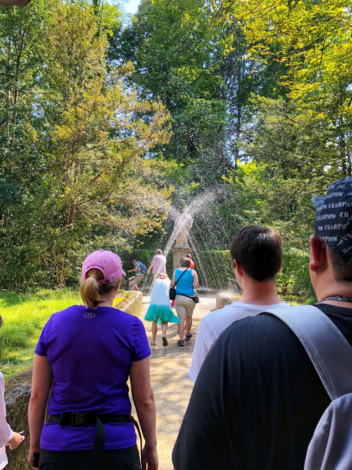 说起机关喷泉,我俩去参观的时候还真的不知道还有一个导游会带我们游览这些400多年前就设计建造的喷泉。导游带着我们走到庄园内最核心的方桌( Royal Table) 喷泉处,大家在周围的阶级上坐下来,有些人选择了坐在方桌周围的几个石凳上,导游开始用两三种语言给我们讲解喷泉的一些历史,然后告诉那些坐在方桌周围的人,要遵守以前大主教的规则,一旦坐下,大主教没有允许的情况下,客人是不可以站起来的,接下来他要打开喷泉机关向我们示范喷裙,忽然,喷泉从方桌周围各个方向喷出,有人坐着的石凳中心也喷出了泉水,当然这是在他们都站起来后才看出来的,坐在方桌周围的人全部被淋湿,哈哈 😄