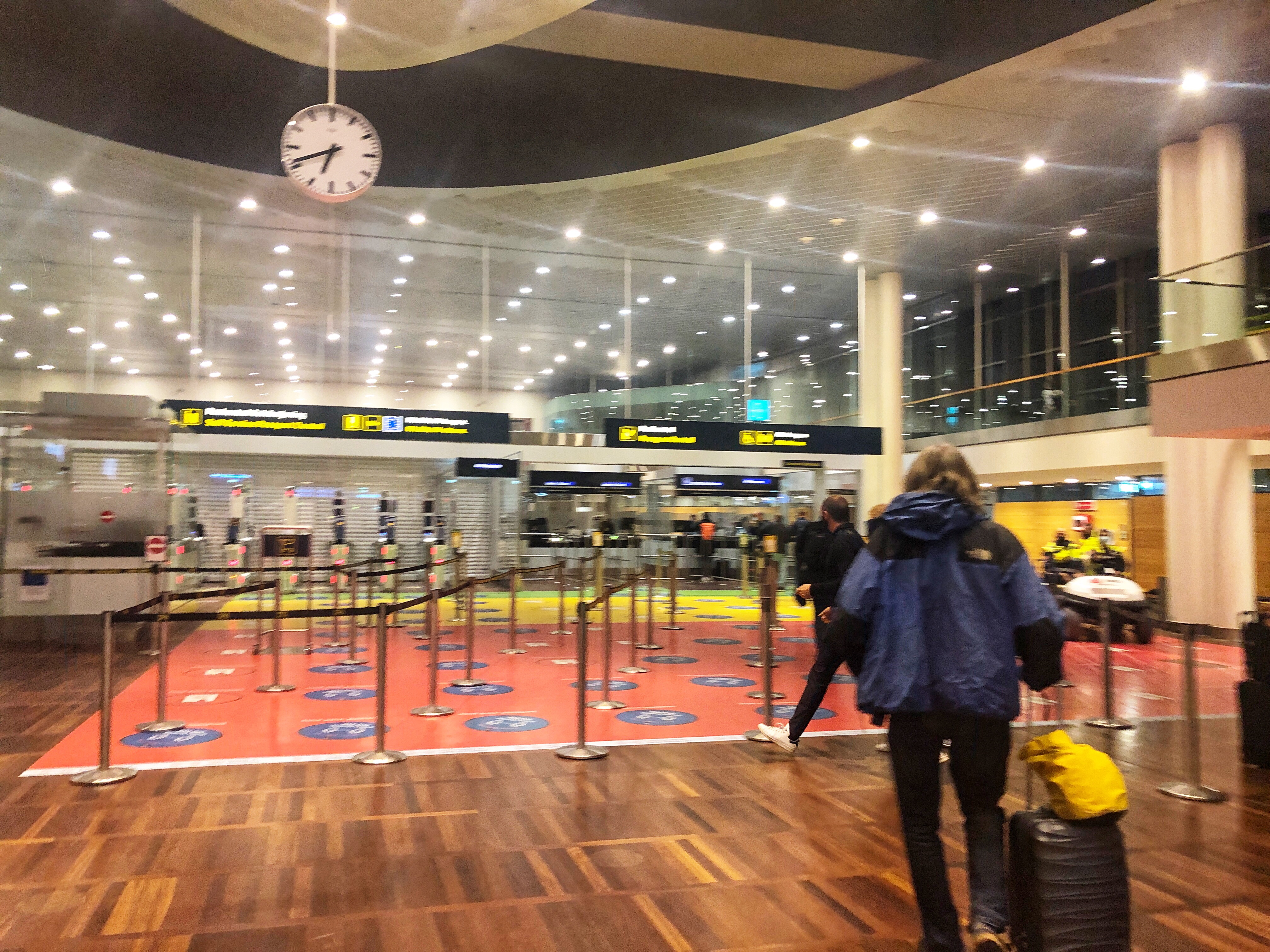 Copenhagen Airport Security Checkpoint, after 6 o’clock in the morning, there are no people, only our passengers on this flight