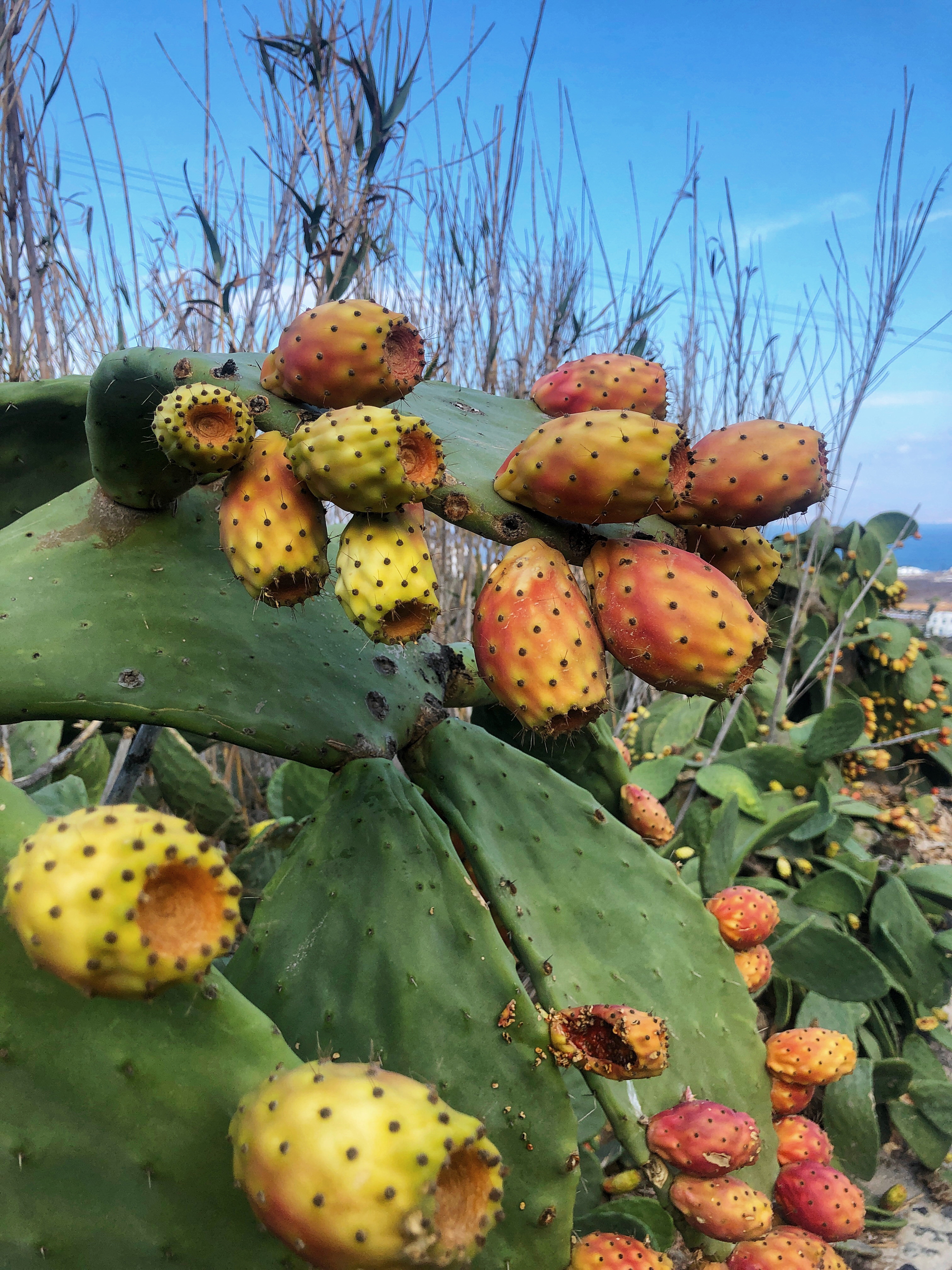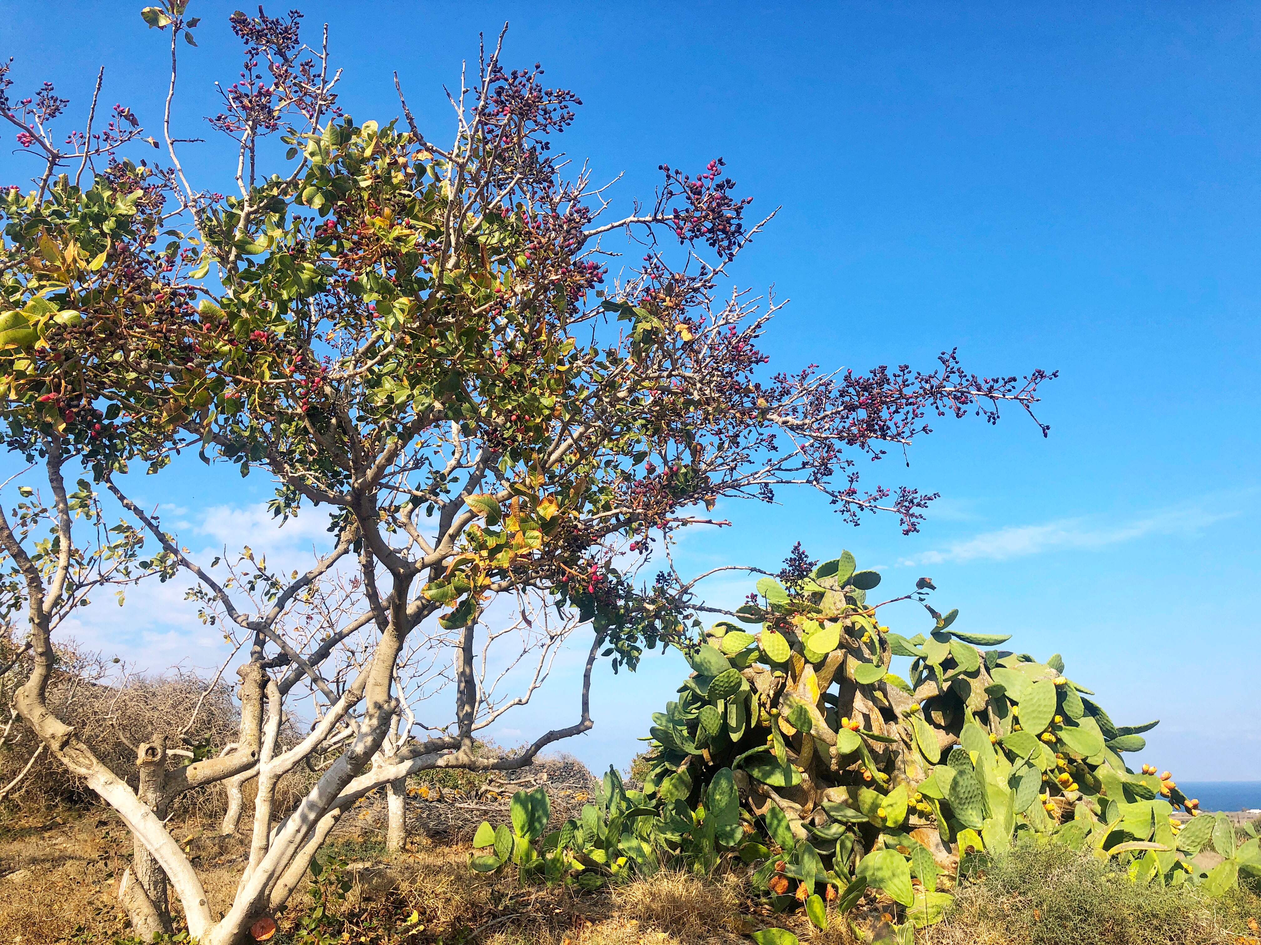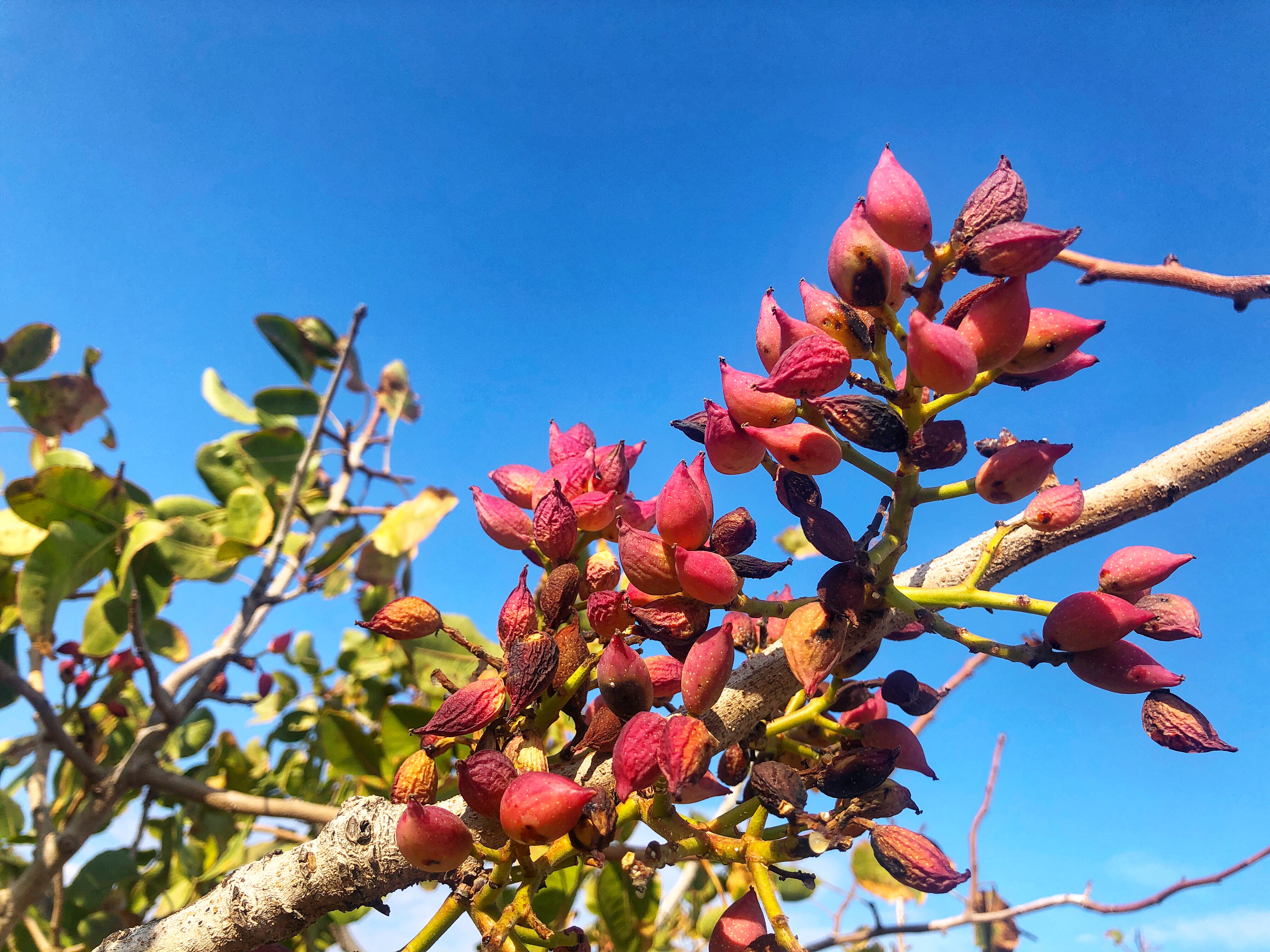 沿路去海滩,还看到了开心果树,这是我俩第一次见到开心果树,估计是过了丰收季,树都基本枯萎了,只有一些没有成熟的开心果挂在孤零零的树上。看到开心果树应该是今天最大的收获了 🙂 路上还看到了一片片的仙人掌果,不知道是野蛮生长的,还是有人种植这个。路过了一个葡萄酒庄,但是所有葡萄树都枯萎了,不知道是缺水,还是过了季节。