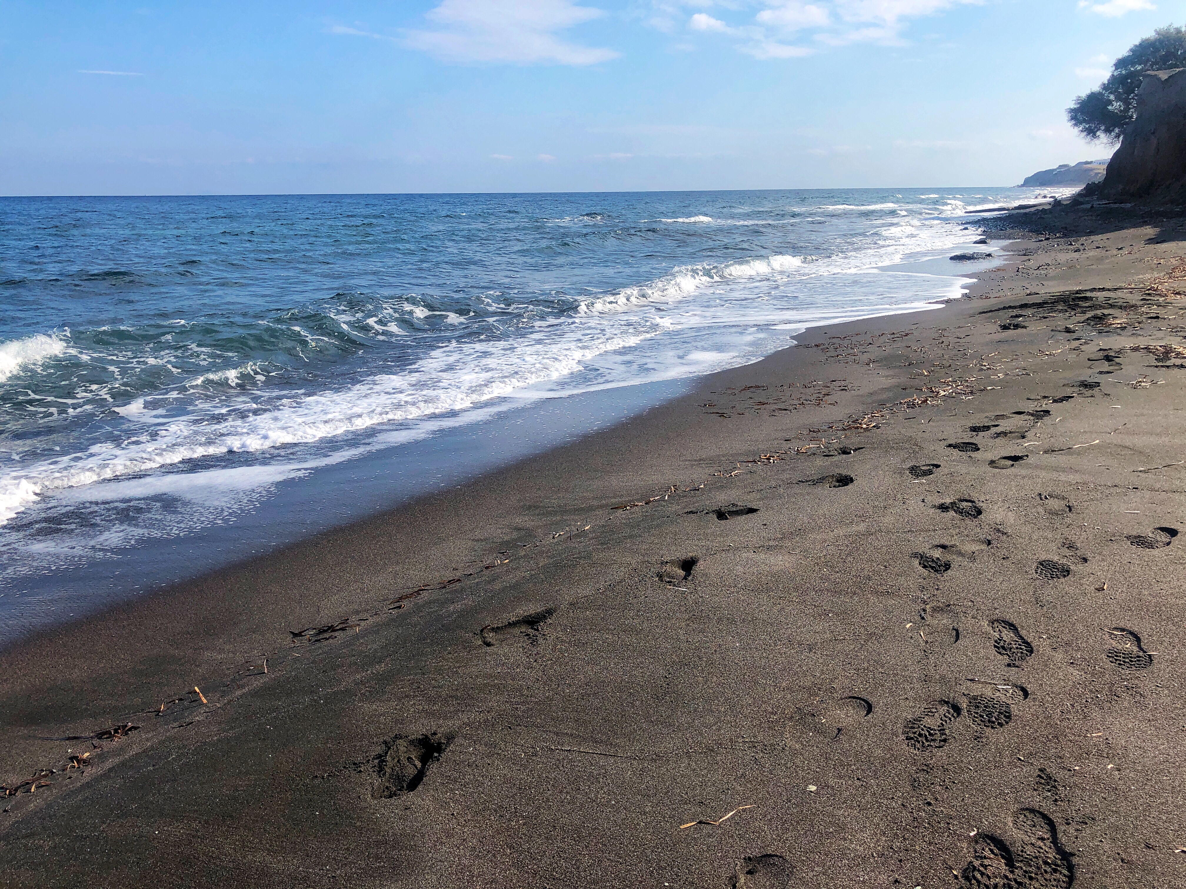 很轻松的徒步到了海滩,发现这竟然是一个黑沙海滩! 我来从来没见过黑沙海滩!看来又是一个收获 🙂 Google了一下为什么圣托里尼岛有黑沙滩,基本就是火山在3600 年前那场毁灭性的爆发时,整个岛屿都被浮石、火山灰和熔岩覆盖,这些成分形成现在的黑沙滩。