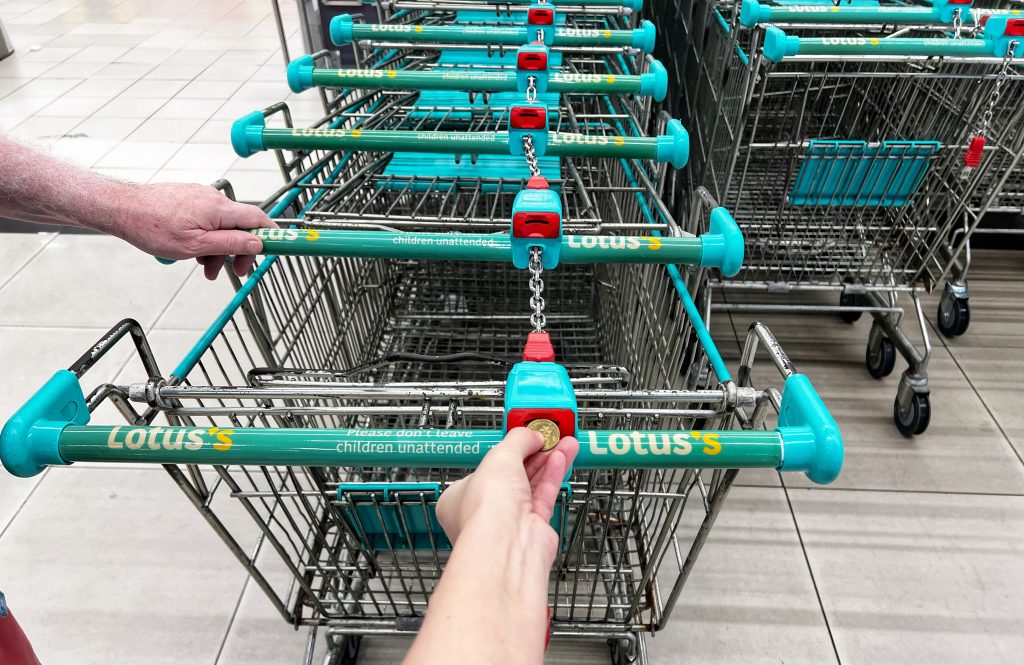 莲花超市的购物车是需要投50分的硬币使用,购物完成后,把车归还到原位后可以把硬币取回,很好的一种防止顾客乱停车的方法 – The shopping carts at Lotus Supermarket require a deposit of 50 cents to use. After shopping, when you return the cart to its original place, you can retrieve your coin. It’s a good method to prevent customers from leaving carts scattered around.