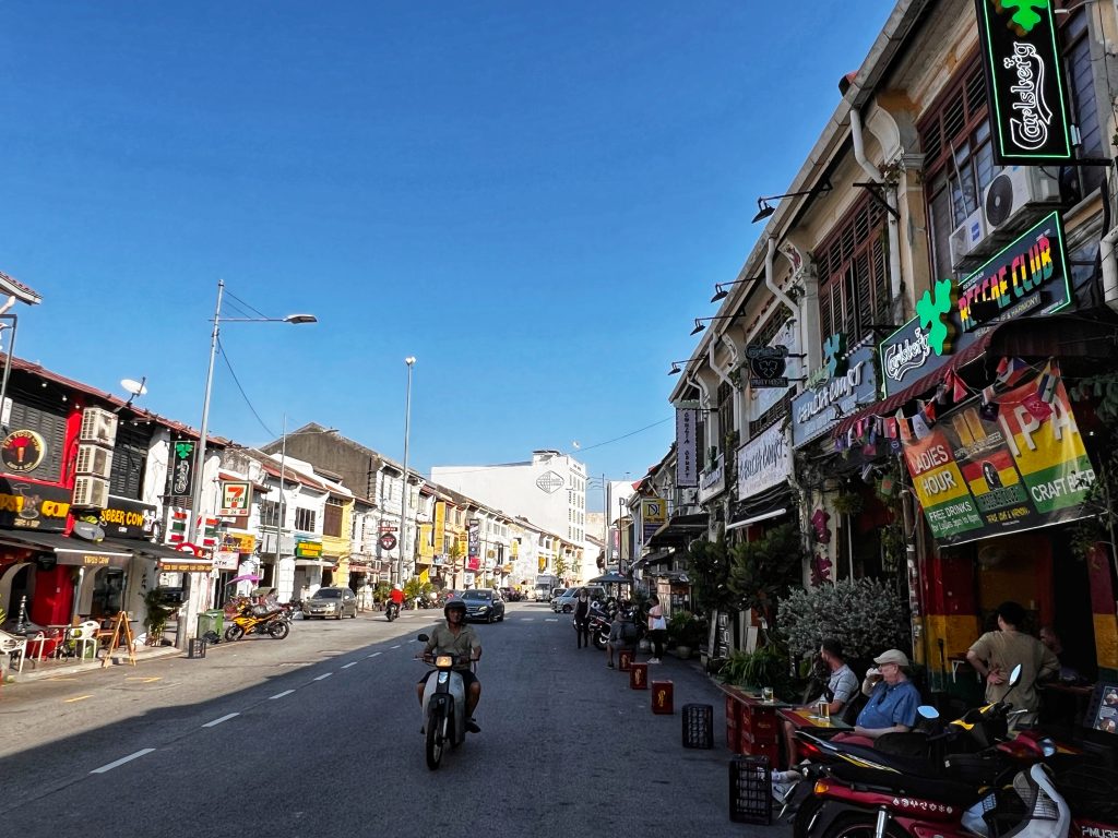 在那个周五的傍晚,我们乘坐Grab前往乔治城古城区,目的地是传说中的爱情巷。这条巷子两旁排列着一系列记录槟城历史深度的古老店屋和殖民时期建筑,它们静静地讲述着时光的故事。我们原本计划在其中一家酒吧静坐,享受着慢慢流淌的人潮,然而五点钟的爱情巷还处在一天的宁静时刻,巷内的商铺大多未见人烟。于是,我们转向巷外的酒吧区,那里我们找到了一个完美的角落,实现了我们的小小愿望。