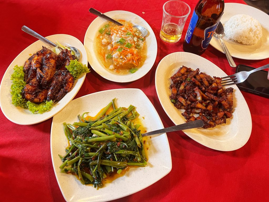 从左到右依次是大虾,豆腐,空心菜和酱猪肉,都很好吃 – From left to right, the dishes are prawns, tofu, water spinach, and pork in sauce, all of which are very delicious.