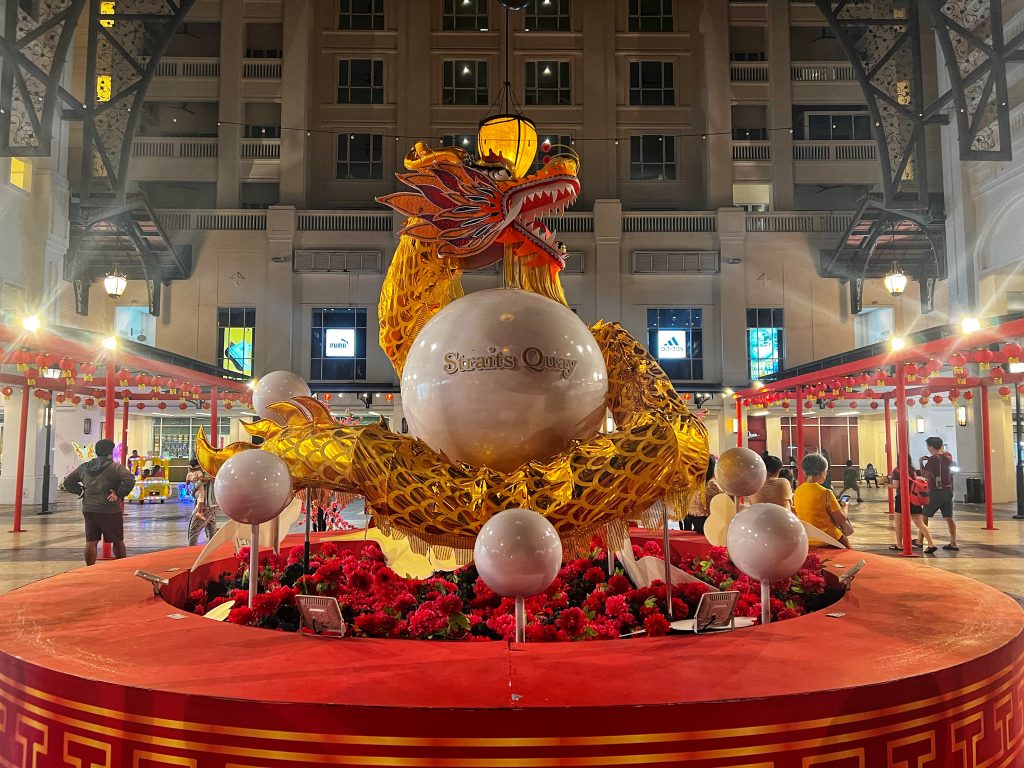 楼下商场入口处的大金龙,很有农历年的感觉 – The large golden dragon at the entrance of the shopping mall downstairs gives a strong Lunar New Year vibe.