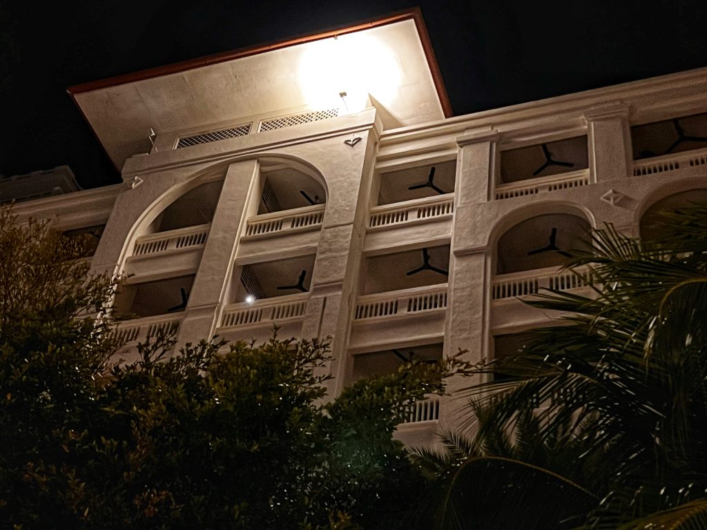 有电筒善良的那个阳台和右边的两个阳台就是我俩的房间 – The balcony with the flashlight on and the two balconies to its right are our rooms.