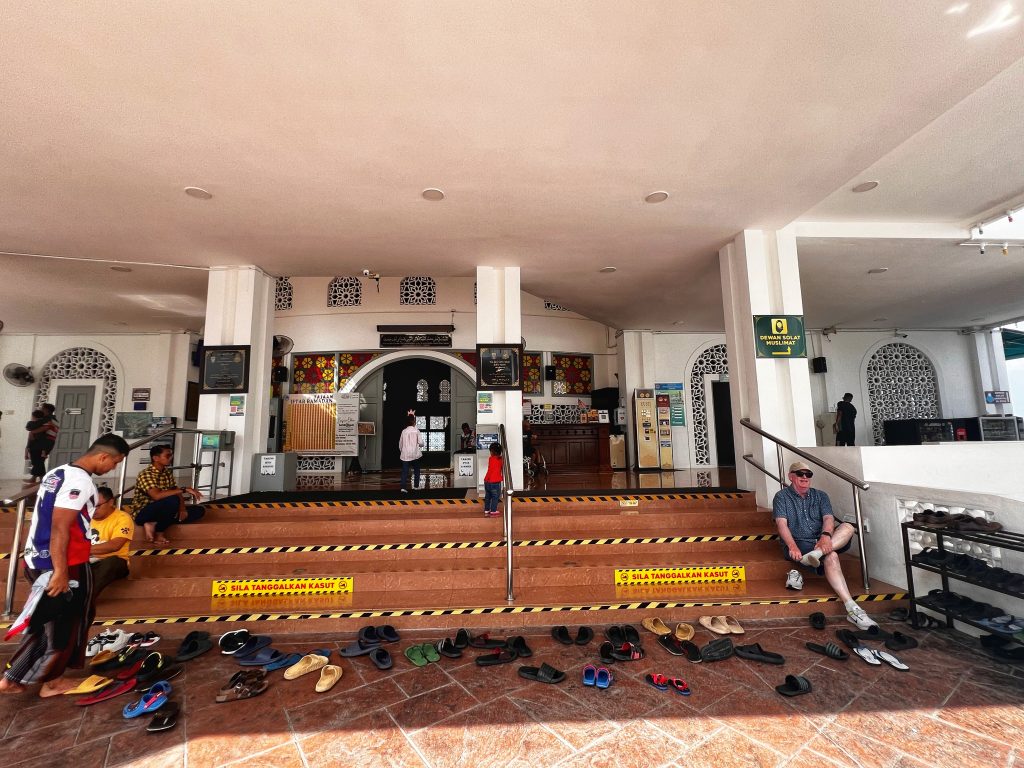 Visitors are allowed to enter for a visit. After registering our names, the gatekeeper asked us to wear traditional Muslim robes — I needed to wear one because I am a woman and had to cover my hair, while PJG needed to cover his lower body because he was wearing shorts. This was our first time entering a Muslim mosque, where a few male worshippers were praying. Women are not allowed to pray here, and I could enter perhaps because I am a tourist.