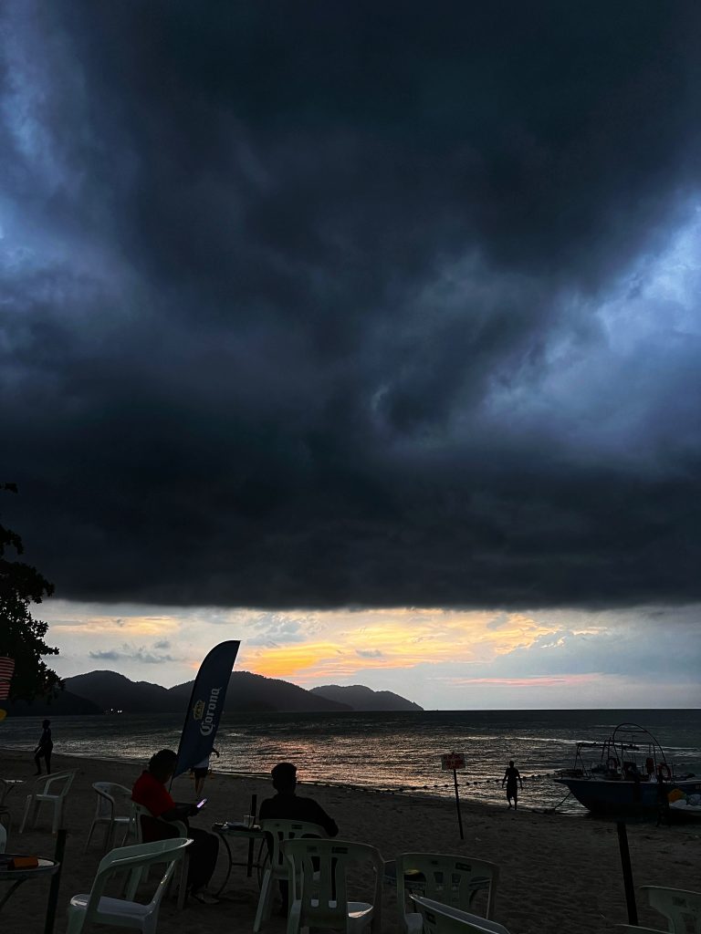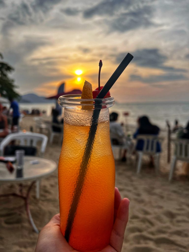 After leaving the Floating Mosque, we took a Grab to another beautiful spot in Penang — Batu Ferringhi Beach, one of the most popular beaches in Penang. Several restaurants along the coastline place their seats directly on the soft sand, creating a rare beach dining experience. This was indeed our first time enjoying a drink and watching the sunset right on the beach, surrounded by a continuous stream of people, enthusiasts of parasailing cutting across the sky, and vendors leading horses back and forth, making the evening seem so perfect. Moments like these seem to capture the essence of how we imagined our trip to Malaysia.