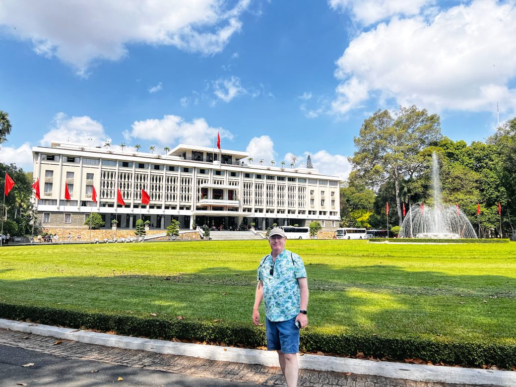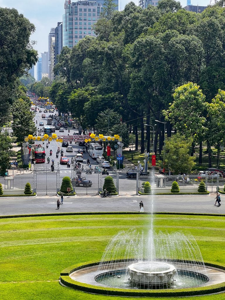 After enjoying the complimentary buffet breakfast at the hotel this morning, we went to visit the Independence Palace located directly across from our hotel. The ticket price was 65,000 Vietnamese Dong per person, and the audio guide cost an additional 90,000 Vietnamese Dong. We saw many foreign tourists and local Vietnamese people.