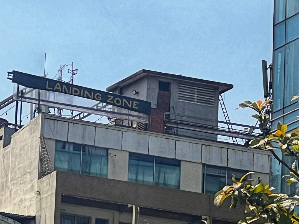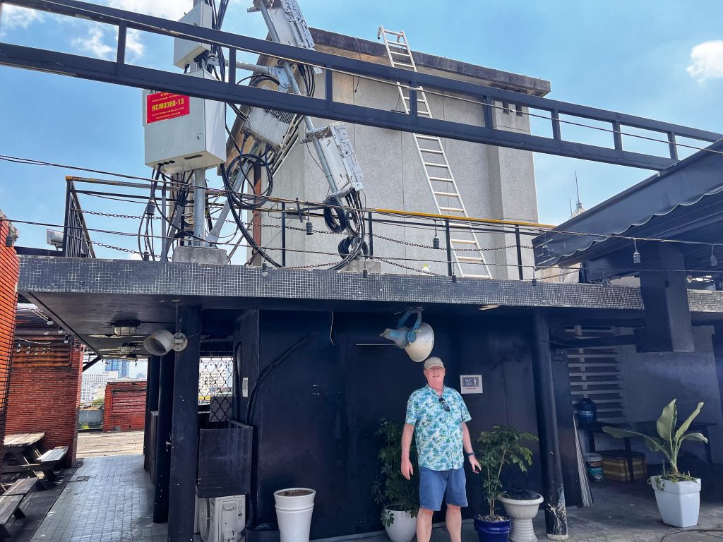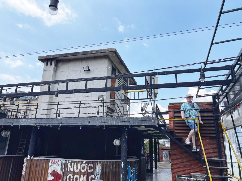 PJG saw online that someone said a coffee shop had opened on the top of that building and anyone could go up to visit. We excitedly found the location but couldn’t see any signs of a coffee shop. Just as we were feeling confused, a security guard on the first floor came out and gestured to ask if we wanted to go upstairs. With various hand signals, we expressed our desire to go to the coffee shop, and the security guard indicated that the coffee shop had closed, but if we gave him some money, he could let us go up. After some bargaining, we gave him 100,000 Vietnamese Dong (4 bucks) and finally made it to the 9th floor. There, we saw an abandoned coffee shop and the small platform from the photo.