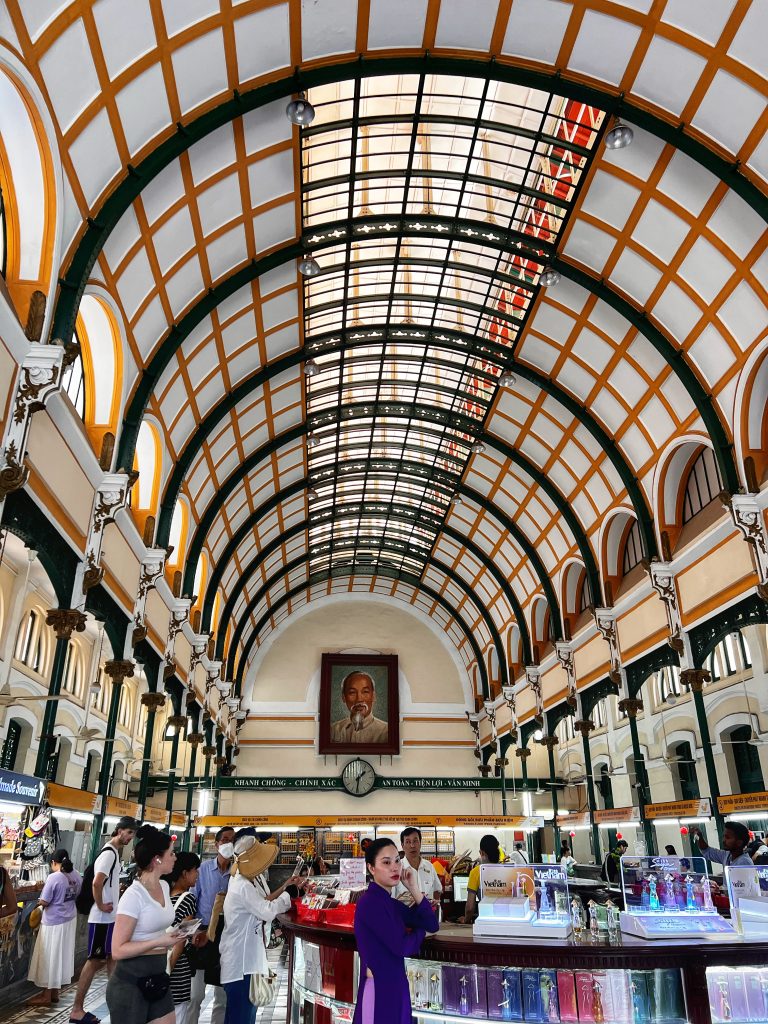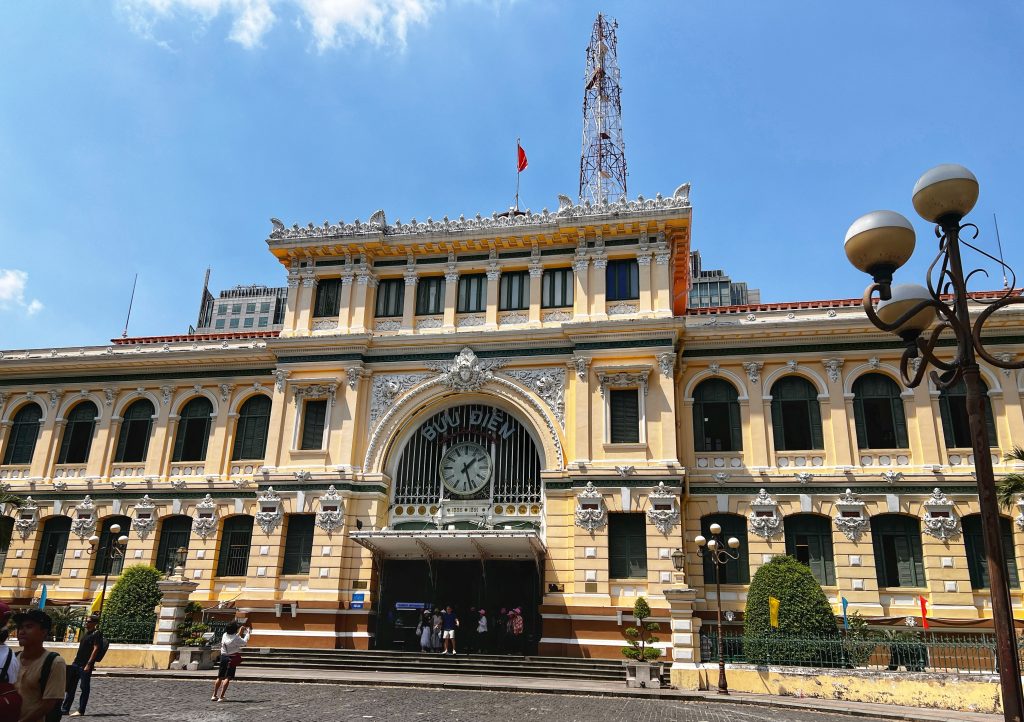 西贡中心邮政局是越南胡志明市的一个标志性建筑,始建于19世纪末,由法国建筑师设计,是一处展示法国殖民时期建筑风格的经典例证。- The Saigon Central Post Office is an iconic building in Ho Chi Minh City, Vietnam. Its construction began in the late 19th century and was designed by a French architect. It is a classic example showcasing the architectural style of the French colonial period.
