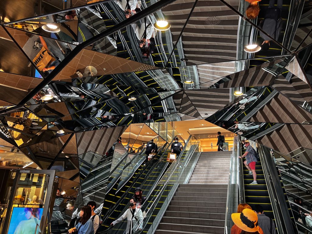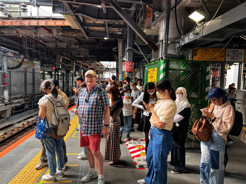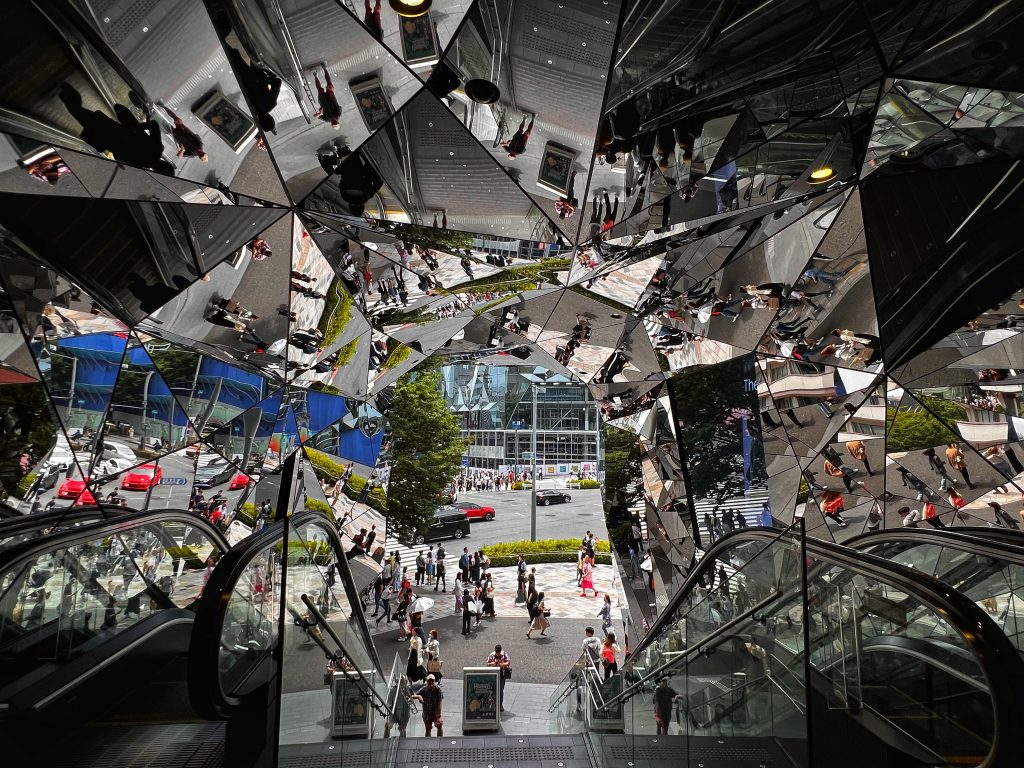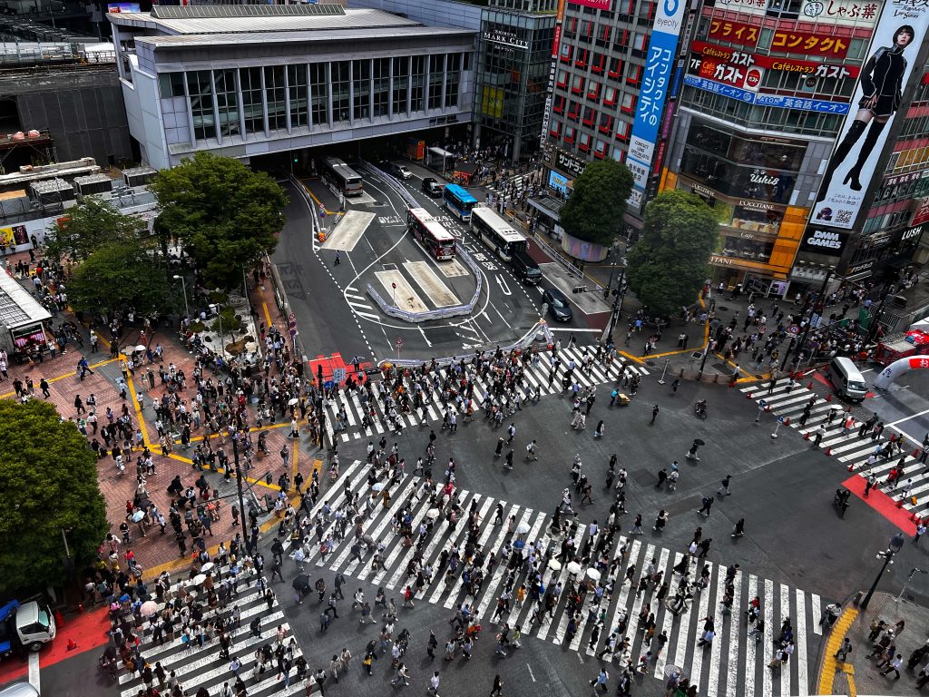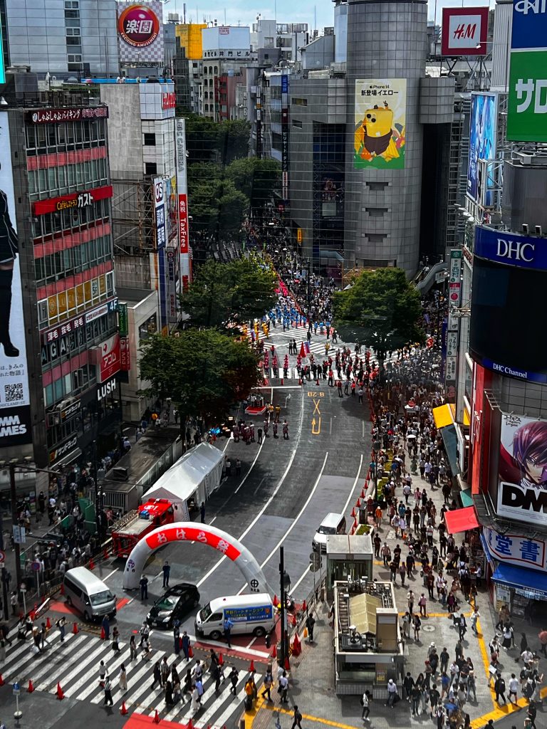 下一站就是去著名的涩谷路口,东京的著名地标,应该算是全球最繁忙的人行横道。每当信号灯变红时,来自不同方向的行人汇聚在十字路口,形成一幅壮观的画面。当信号灯一转绿色,成千上万的人们交织着穿行,就像一支鱼群在大海中舞动。据2016年的一个统计,在人流往来较多的时候,一次绿灯(约2分)的时间内有约3,000人通过这个路口。我俩去了MAGNET by SHIBUYA 109,这个商场的7楼外平台可以俯瞰到涩谷路口,到了那里没想到,要没人至少花钱买一杯550日元的饮料,好吧,可以坐下来休息一下也不错。