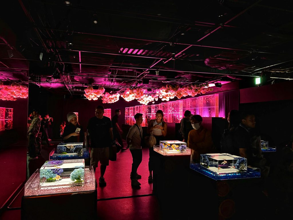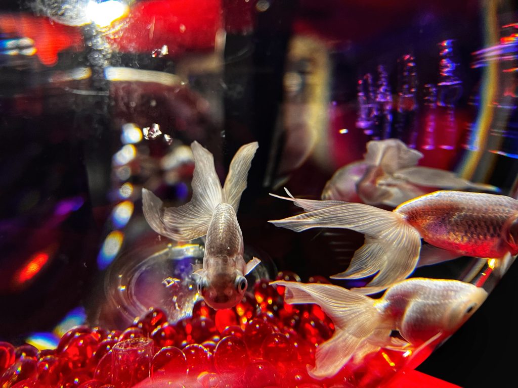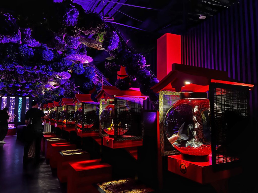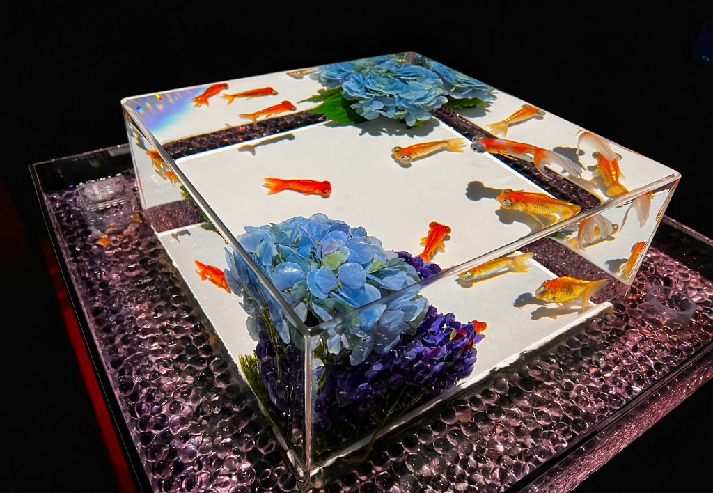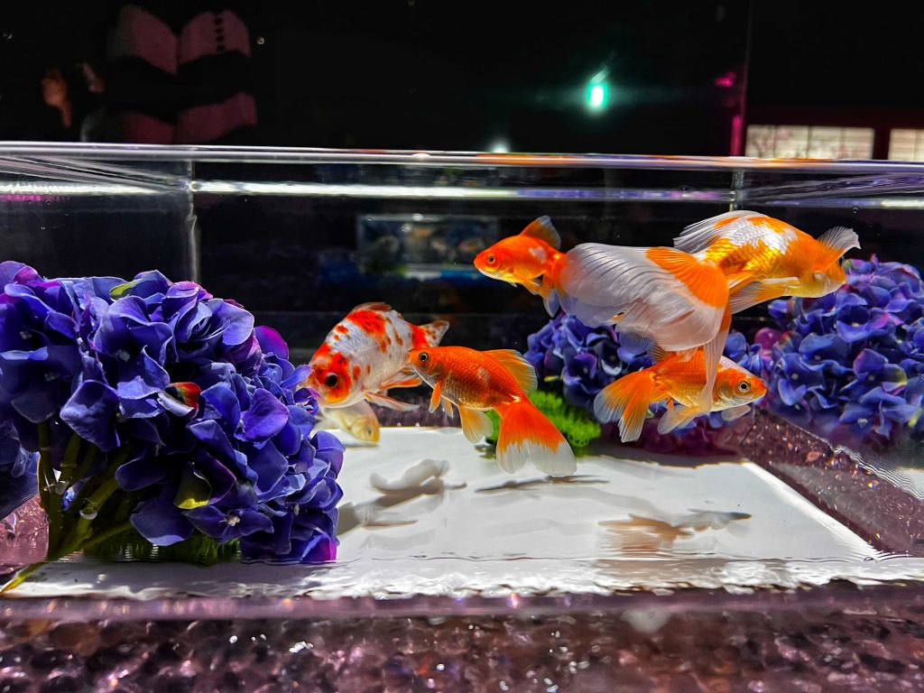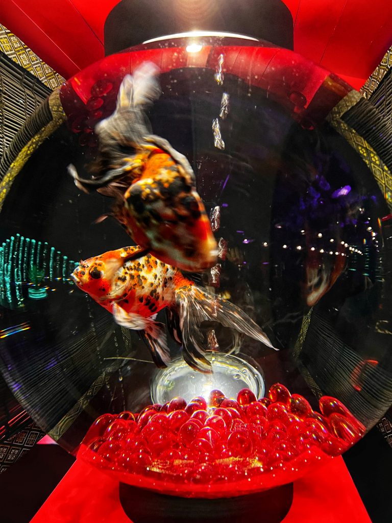 Goldfish are generally thought to have been introduced to Japan from China during the Muromachi period in the mid-15th century, but most of that time they were exotic pets of nobles. Goldfish’s popularity skyrocketed during the Edo period, and it has remained beloved by the Japanese ever since. Each tank in the aquarium displays a different type of goldfish, they swim freely in the water, with flowing scales, each fish is so delicate and beautiful. The movement of the water, the rhythm of the music, the changing of the lights, helps you enjoy the feeling of tranquility, relaxation and immersion provided here.