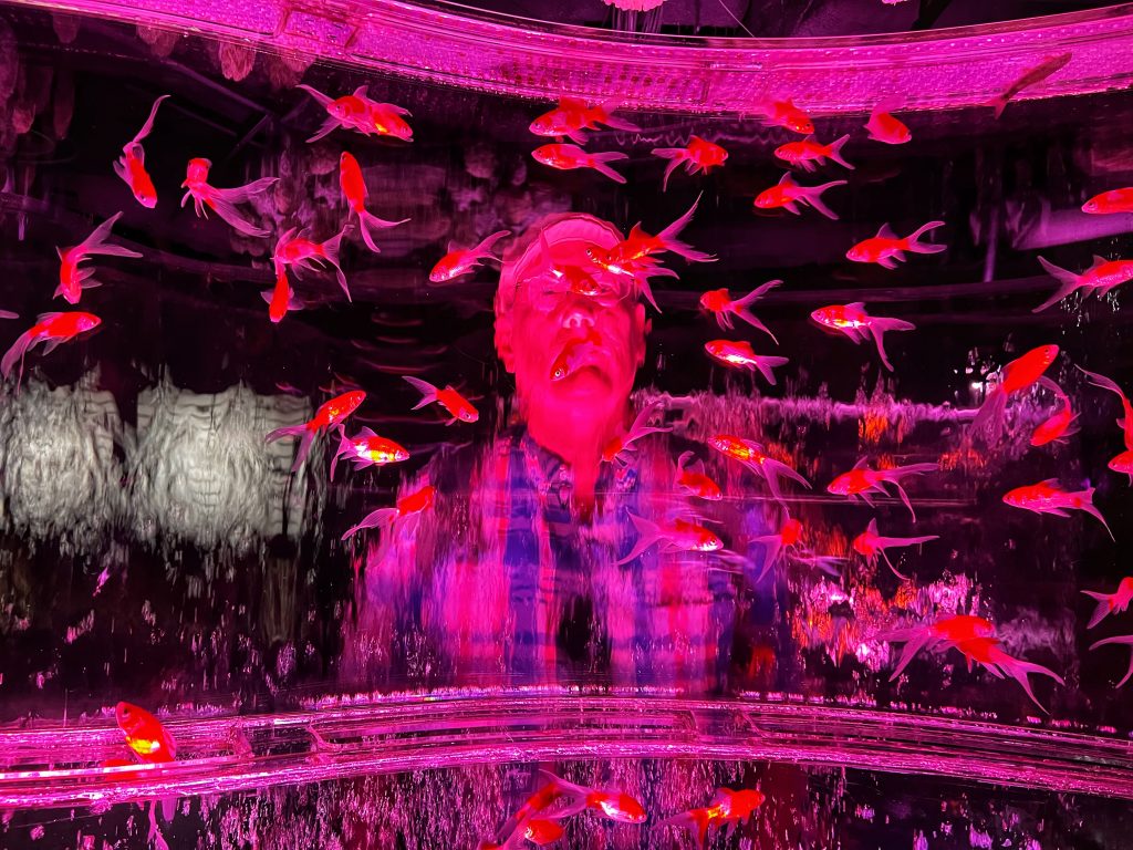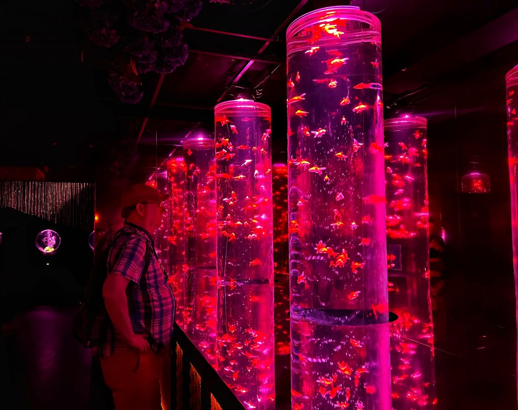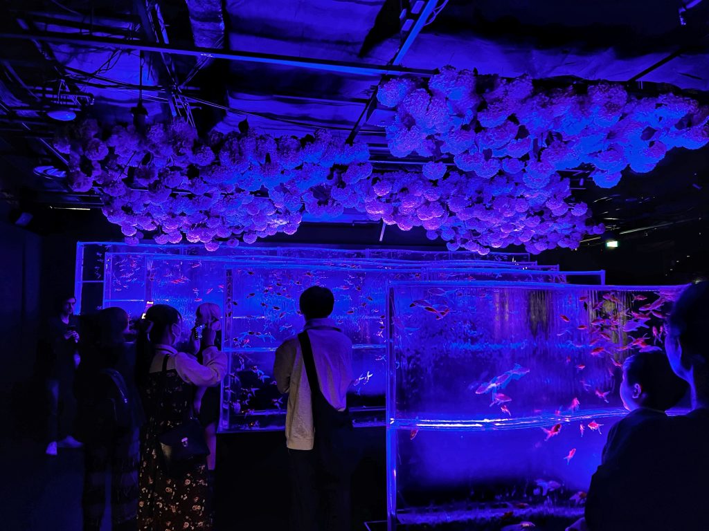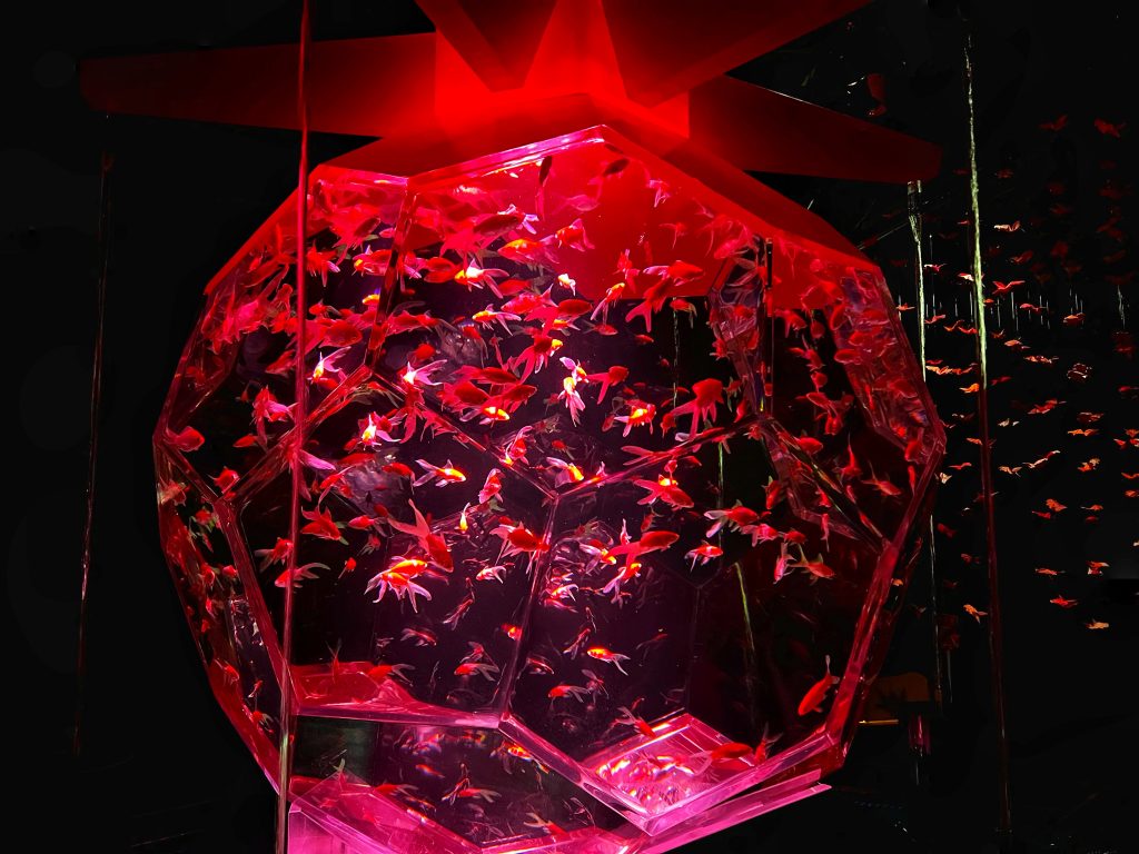 吃完午饭,出了面馆,发现又下起了雨,幸好计划的第二站是东京艺术水族馆。坐一班地铁,大概二十多分钟就到了水族馆,坐落在一座商城里。这是一个很不同的水族馆,里面只有金鱼,建立的背景源于日本艺术家堀江启一(Hidetomo Kimura)的创意和概念。堀江启一是一位将传统的金鱼养殖与艺术相结合的艺术家。他将传统的金鱼观赏提升到了一个全新的层次,通过灯光、音乐和装置艺术创造了令人独特的,令人惊叹的艺术展览。